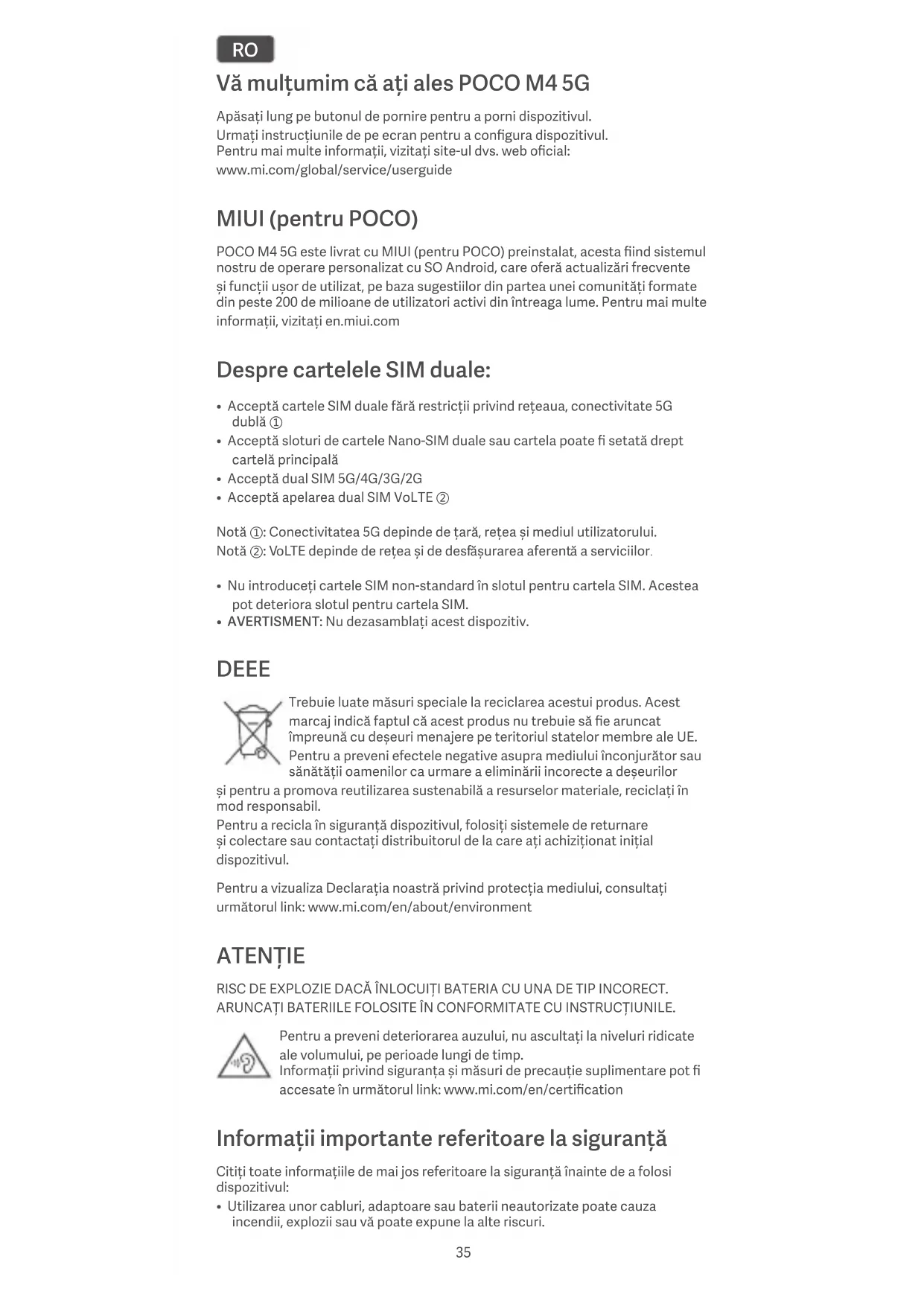 - AVERTISMENT: Nu dezasamblați acest dispozitiv. DEEE Trebuie luate măsuri speciale la reciclarea acestui produs. Acest marcaj indică faptul că acest produs nu trebuie să fie aruncat împreună cu deșeuri menajere pe teritoriul statelor membre ale UE. Pentru a preveni efectele negative asupra mediului înconjurător sau sănătății oamenilor ca urmare a eliminării incorecte a deșeurilor și pentru a promova reutilizarea sustenabilă a resurselor materiale, reciclați în mod responsabil. Pentru a recicla în siguranță dispozitivul, folosiți sistemele de returnare și colectare sau contactați distribuitorul de la care ați achiziționat inițial dispozitivul. Pentru a vizualiza Declarația noastră privind protecția mediului, consultați următorul link: www.mi.com/en/about/environment ATENȚIE RISC DE EXPLOZIE DACĂ ÎNLOCUIȚI BATERIA CU UNA DE TIP INCORECT. ARUNCAȚI BATERIILE FOLOSITE ÎN CONFORMITATE CU INSTRUCȚIUNILE. Pentru a preveni deteriorarea auzului, nu ascultați la niveluri ridicate ale volumului, pe perioade lungi de timp. Informații privind siguranța și măsuri de precauție suplimentare pot fi accesate în următorul link: www.mi.com/en/certification Informații importante referitoare la siguranță Citiți toate informațiile de mai jos referitoare la siguranță înainte de a folosi dispozitivul: