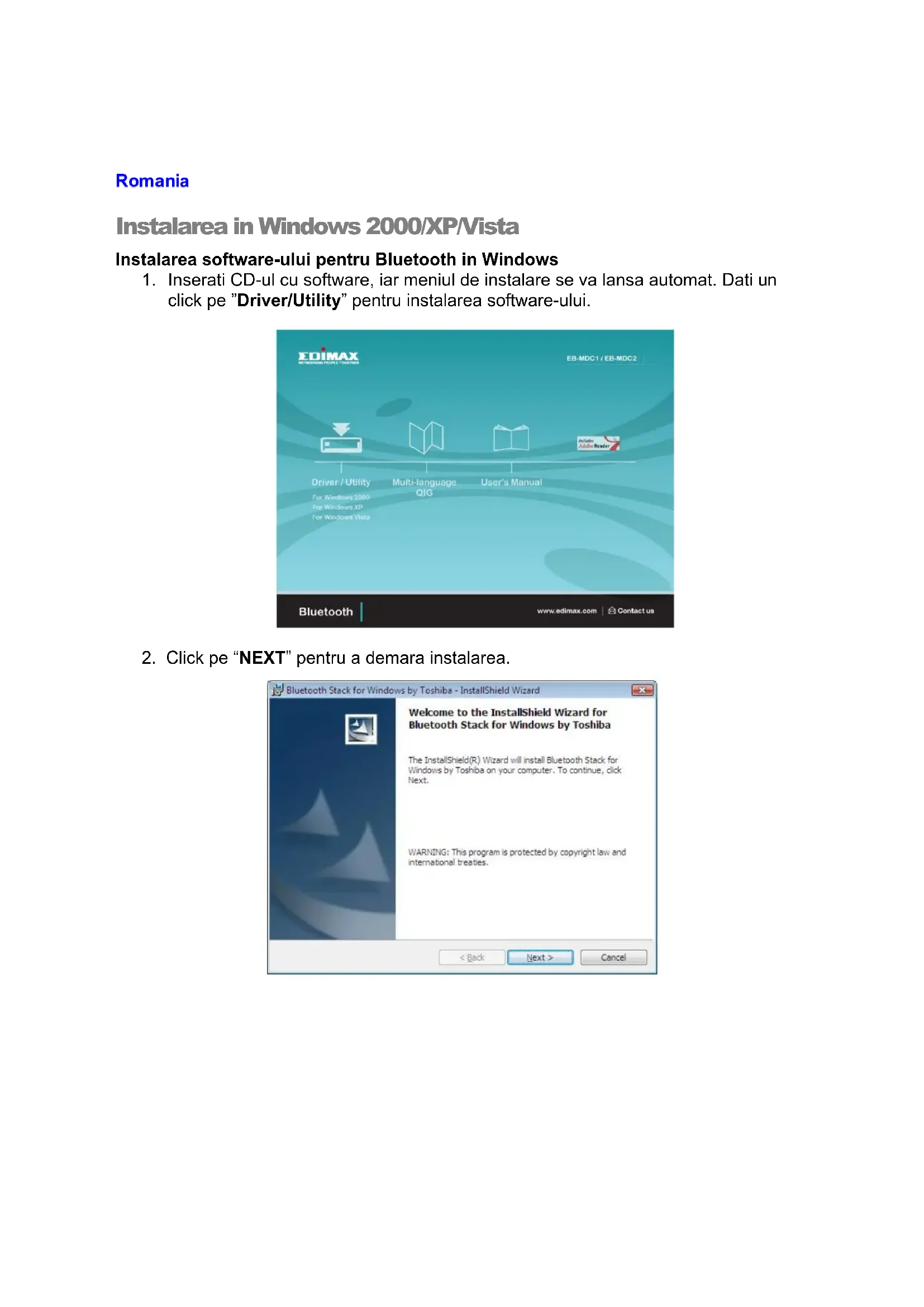 Instalarea in Windows 2000/XP/Vista Instalarea software-ului pentru Bluetooth in Windows
