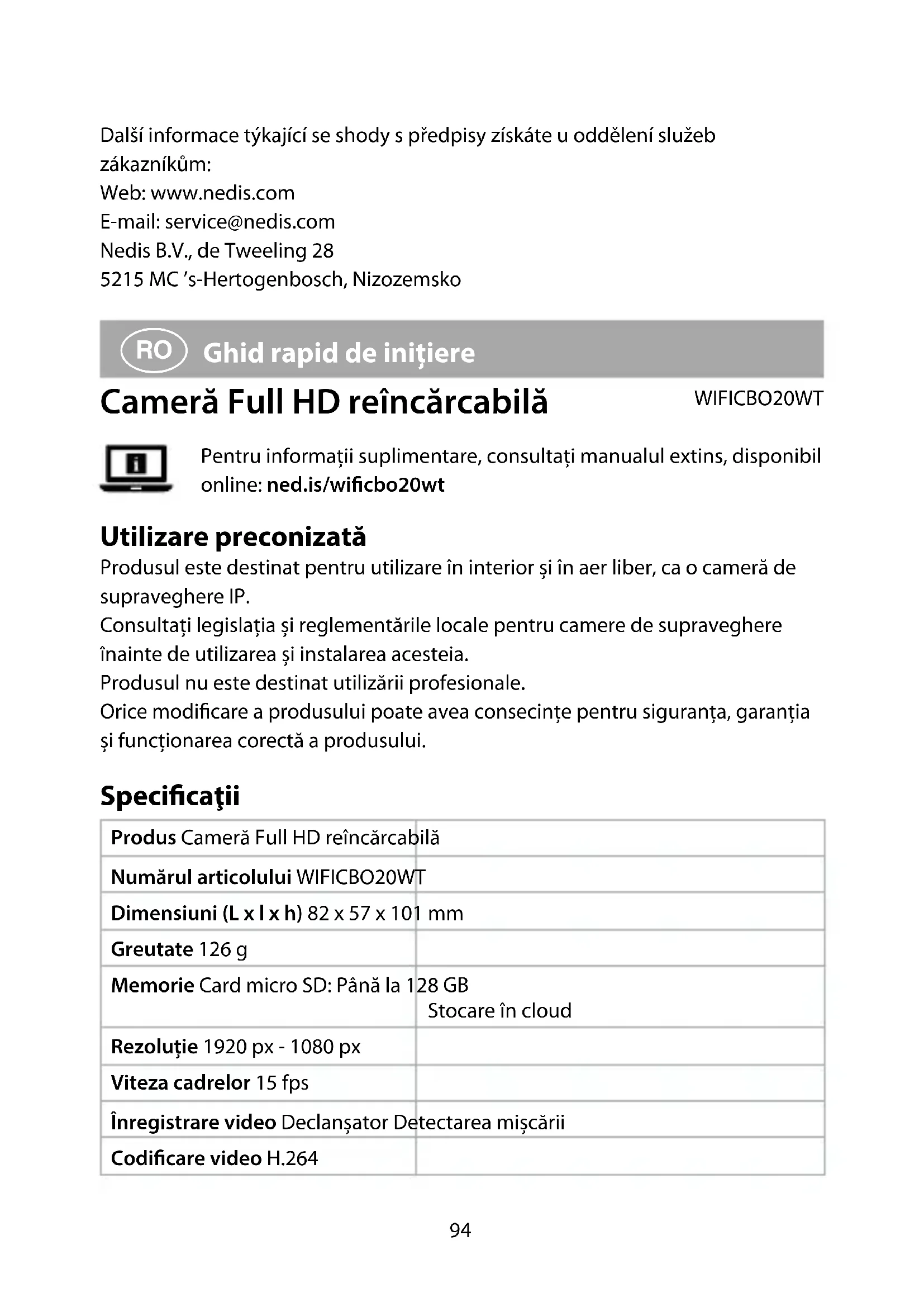 Setări Atingeți tasta setărilor pentru a deschide ecranul setărilor. Modicați numele produsului Modicați numele camerei de supraveghere. Partajați produse Partajați cu alte persoane accesul la produs. Informații despre produs Vizualizați informațiile produsului. Gestionare alimentare electrică Vizualizați starea bateriei și setați semnalul de baterie descărcată. Setările funcției de bază Schimbați setările camerei. Comutator PIR Reglați sensibilitatea detectării mișcării. Setări card SD Vizualizați setările cardului microSD și stabilități setările pentru înregistrare. Feedback Trimiteți feedback în legătură cu produsul către Nedis. Informații rmware Vizualizați versiunea software-ului. Eliminare produs Eliminați produsul din aplicația Nedis SmartLife. Declarație de conformitate Noi, Nedis B.V., declarăm, în calitate de producător, că produsul WIFICBO20WT de la marca noastră Nedis®, fabricat în China, a fost testat în conformitate cu toate standardele CE și reglementările relevante și că toate testele au fost trecute cu succes. Aceasta include, dar nu se limitează la directiva RED 2014/53/UE. Declarația de conformitate completă (și șa tehnică de securitate, dacă este cazul) pot găsite și descărcate prin intermediul: nedis.ro/WIFICBO20WT#support Pentru informații suplimentare privind respectarea conformității, contactați serviciul clienți: Site web: www.nedis.com E-mail: service@nedis.com Nedis B.V., de Tweeling 28 5215 MC ’s-Hertogenbosch, OlandaNedis BV De Tweeling 28, 5215 MC ’s-Hertogenbosch – The Netherlands 07/21