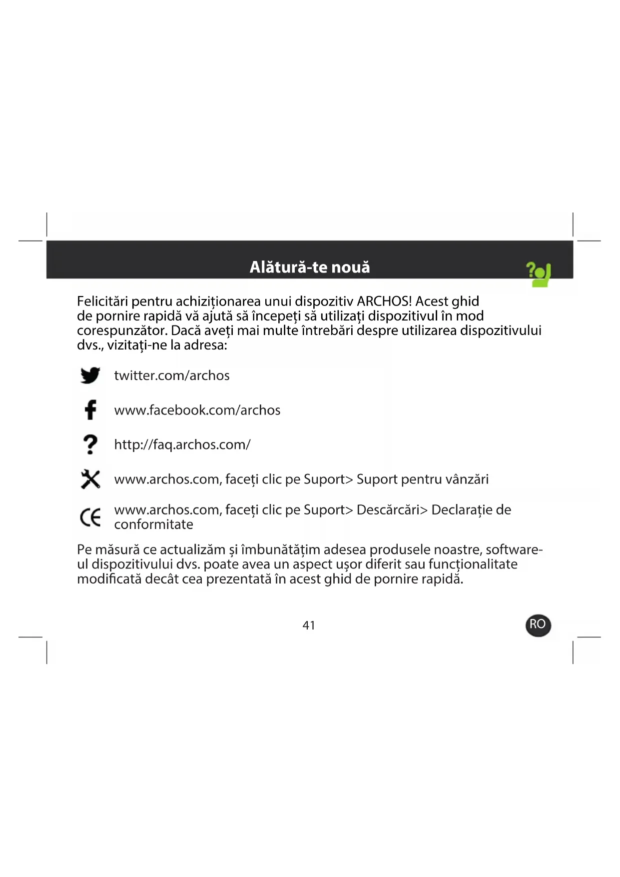 Felicitări pentru achiziționarea unui dispozitiv ARCHOS! Acest ghid de pornire rapidă vă ajută să începeți să utilizați dispozitivul în mod corespunzător. Dacă aveți mai multe întrebări despre utilizarea dispozitivului dvs., vizitați-ne la adresa: twitter.com/archos www.facebook.com/archos http://faq.archos.com/ www.archos.com, faceți clic pe Suport> Suport pentru vânzări www.archos.com, faceți clic pe Suport> Descărcări> Declarație de conformitate Pe măsură ce actualizăm și îmbunătățim adesea produsele noastre, software- ul dispozitivului dvs. poate avea un aspect ușor diferit sau funcționalitate modicată decât cea prezentată în acest ghid de pornire rapidă. Alătură-te nouă42