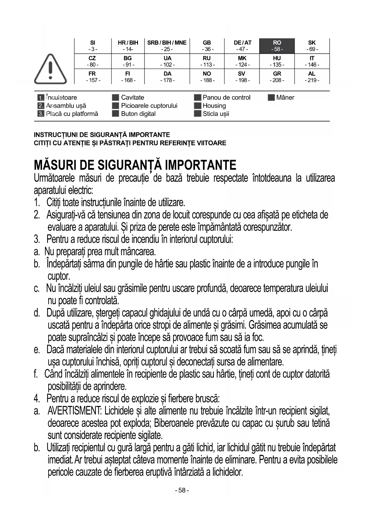 - 219 -- 59 - c. Cartoi, cârnații și castanele trebuie curățați sau găuriți înainte de gătit. Ouăle în coajă, ouă erte întregi nu trebuie încălzite în cuptoare cu microunde, deoarece acestea pot exploda, chiar și după încheierea încălzirii cu microunde. d. Conținutul biberoanelor și al borcanelor pentru alimente pentru bebeluși trebuie agitat sau agitat, iar temperatura trebuie vericată înainte de consum, pentru a evita arsurile.