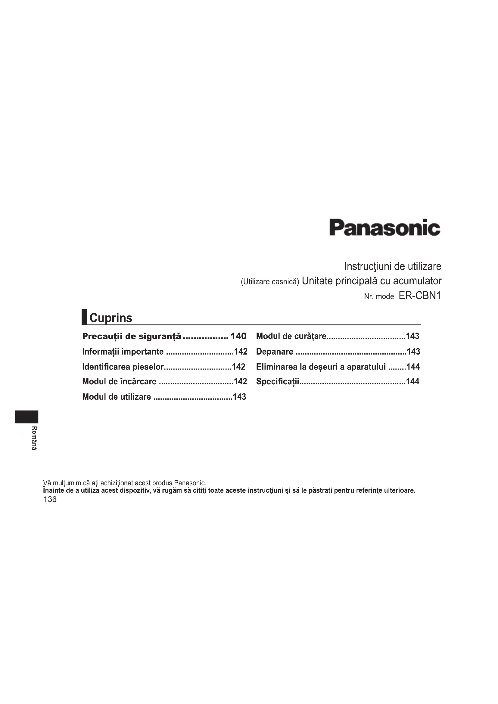 - Acest produs este destinat exclusiv pentru utilizare casnică. Pentru mai multe informații despe eciența energetică a produsului, vizitați site-ul nostru web, www.panasonic.com, și introduceți numărul modelului în caseta de căutare. Depunerealadeşeuriaechipamentelorşiabateriilorvechi Doar pentruUniuneaEuropeanăşipentruţărilecusistemede reciclare Aceste simboluri de pe produse, ambalaje şi/sau documentele însoţitoare indică faptul că produsele electrice şi electronice, precum şi bateriile uzate nu trebuie să e amestecate cu deşeurile menajere obişnuite. Pentru un tratament corespunzător, pentru recuperarea şi reciclarea produselor vechi şi a bateriilor uzate, vă rugăm să le depuneţi la punctele de colectare special amenajate, în conformitate cu legislaţia naţională. Prin depunerea corespunzătoare a acestora la deşeuri, veţi ajuta la economisirea unor resurse valoroase şi veţi preveni potenţiale efecte negative asupra sănătăţii umane şi asupra mediului înconjurător. Pentru mai multe informaţii despre colectare şi reciclare, vă rugăm să contactaţi autorităţile locale. Este posibil ca depunerea incorectă la deşeuri să e pedepsită în conformitate cu legile naţionale. Notăpentru simbolul de baterie(ultimeledouă exempledesimboluri) Acest simbol poate utilizat în combinaţie cu un simbol chimic. În acest caz, acesta este conform cu cerinţele stabilite de Directiva pentru elementul chimic în cauză.145 Türkçe Kullanım Talimatları (Ev için) Ni-MH Pil Ana Ünite Model No. ER-CBN1 Bu Panasonic ürününü aldığınız için teşekkür ederiz. Buüniteyikullanmadanöncelütfentalimatlarıeksiksizokuyunveileridekullanmakiçinsaklayın. Güvenlik önlemleri p. 148