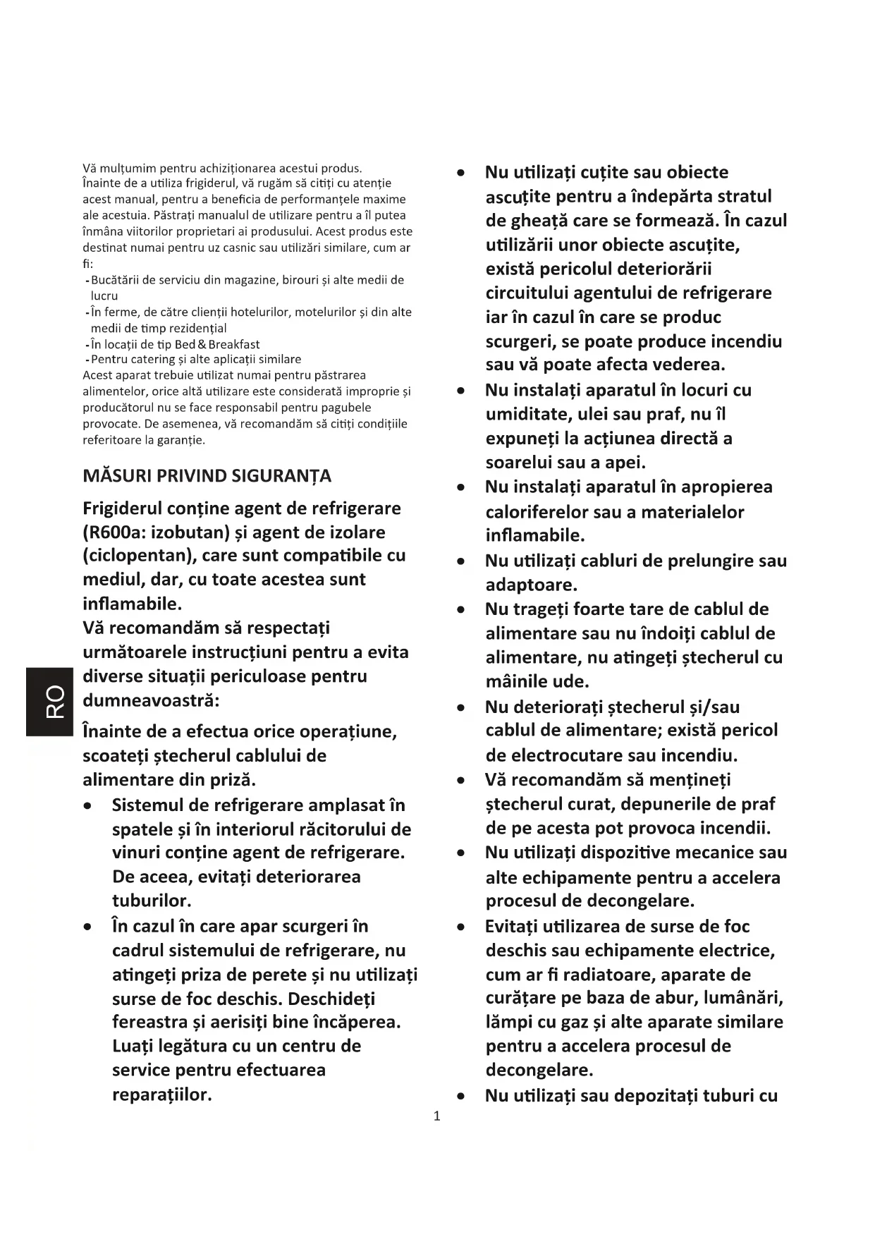 - Bucĉtĉrii de serviciu din magazine, birouri ƕi alte medii de lucru - În ferme, de cĉtre clienƜii hotelurilor, motelurilor ƕi din alte medii de Ɵmp rezidenƜial - În locĂƜii de Ɵp Bed & Breakfast - Pentru catering ƕi alte aplicaƜii similare Acest aparat trebuie uƟůŝzat numai pentru pĉstrarea alimentelor, orice altĉ uƟůŝzare este consideratĉ improprie ƕi producĉtorul nu se face responsabil pentru pagubele provocate. De asemenea, vĉ recomandĉm sĉ ciƟƜi condiƜiile referitoare la garanƜie. MSURI PRIVIND SIGURANfA Frigiderul conƜine agent de refrigerare (R600a: izobutan) ƕi agent de izolare (ciclopentan), care sunt compaƟbile cu mediul, dar, cu toate acestea sunt inŇamabile. Vĉ recomandĉŵ sĉ respectaƜi urŵĉtoarele instruĐƜiuni pentru a evita diverse situaƜii periculoase pentru dumneavoastrĉ: Înainte de a efectua orice operaƜiune, scoateƜi ƕtecherul cablului de alimentare din prŝnjĉ. x Sistemul de refrigerare amplasat în spatele ƕi în interiorul rĉcitorului de vinuri conƜine agent de refrigerare. De aceea, evitaƜi deteriorarea tuburilor. x În cazul în care apar scurgeri în cadrul sistemului de refrigerare, nu aƟngeƜi priza de perete ƕi nu uƟůŝnjĂƜi surse de foc deschis. DeschideƜi fereastra ƕi aerisiƜi bine încĉperea. LuaƜi legĉtura cu un centru de service pentru efectuarea reparaƜiilor. x Nu uƟůŝnjĂƜi cuƜite sau obiecte ascu Ɯite pentru a îndepĉrta stratul de gheaƜĉ care se formeĂnjĉ. În cazul uƟůŝnjĉrii unor obiecte ascuƜite, existĉ pericolul deteriorĉrii circuitului agentului de refrigerare iar în cazul în care se produc scurgeri, se poate produce incendiu sau vĉ poate afecta vederea. x Nu instalaƜi aparatul în locuri cu umiditate, ulei sau praf, nu îl expuneƜi la aĐƜiunea directĉ a soarelui sau a apei. x Nu instalaƜi aparatul în apropierea caloriferelor sau a materialelor inŇamabile. x Nu uƟůŝnjĂƜi cabluri de prelungire sau adaptoare. x Nu trageƜi foarte tare de cablul de alimentare sau nu îndoiƜi cablul de alimentare, nu aƟngeƜi ƕtecherul cu mâinile ude. x Nu deterioraƜi ƕtecherul ƕi/sau cablul de alimentare; existĉ pericol de electrocutare sau incendiu. x Vĉ recomandĉŵ sĉ menƜineƜi ƕtecherul curat, depunerile de praf de pe acesta pot provoca incendii. x Nu uƟůŝnjĂƜi dispoziƟve mecanice sau alte echipamente pentru a accelera procesul de decongelare. x EvitaƜi uƟůŝnjĂrea de surse de foc deschis sau echipamente electrice, cum ar Į radiatoare, aparate de curĉƜare pe baza de abur, lumânĉri, ůĉŵpi cu gaz ƕi alte aparate similare pentru a accelera procesul de decongelare. x Nu uƟůŝnjĂƜi sau depozitaƜi tuburi cu RO2 spray inŇĂŵĂbile, cuŵ ar Į tuburi pentru picturĉ, în apropierea rĉcitorului de vinuri. Pericol de explozie sau incendiu. x Nu uƟůŝnjĂƜi aparate electrice în interiorul coŵparƟŵentelor pentru depozitarea Ăůŝŵentelor, altele decât cele recoŵĂndate de cĉtre producĉtor. x Nu ĂŵplasaƜi sau nu depozitaƜi ŵĂteriale inŇĂŵĂbile sau foarte volaƟůe cuŵ ar Į eter, pertrol, GPL, gaz propan, recipiente cu aerosoli sub presiune, produse adezine, alcool pur etc. Aceste ŵĂteriale reprezintĉ pericol de explozie. x Nu depozitaƜi ŵedicĂŵente sau teste de laborator în rĉcitorul de vinuri. Dacĉ ŵĂterialul respecƟv necesitĉ un control strict al teŵperaturii de depozitare, este posibil sĉ se deterioreze sau sĉ se producĉ o reaĐƜie necontrolatĉ, ceea ce reprezintĉ un risc.