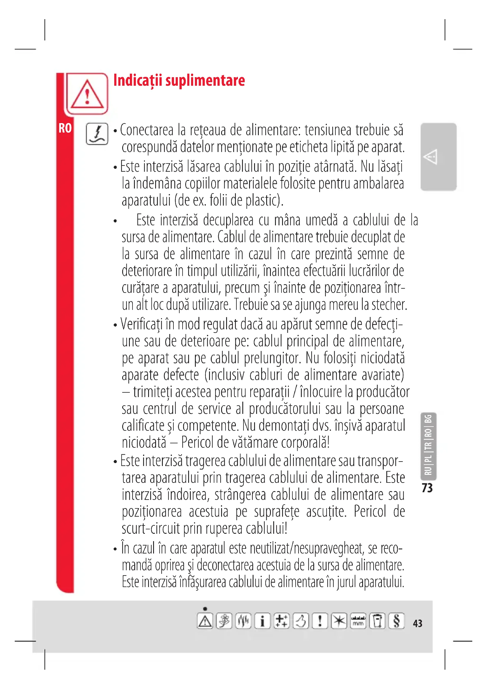 - În cazul în care aparatul este neutilizat / nesupravegheat, se reco- mandă oprirea şi deconectarea acestuia de la sursa de alimentare. Este interzisă înfăşurarea cablului de alimentare în jurul aparatului.44 Indicaţii suplimentare