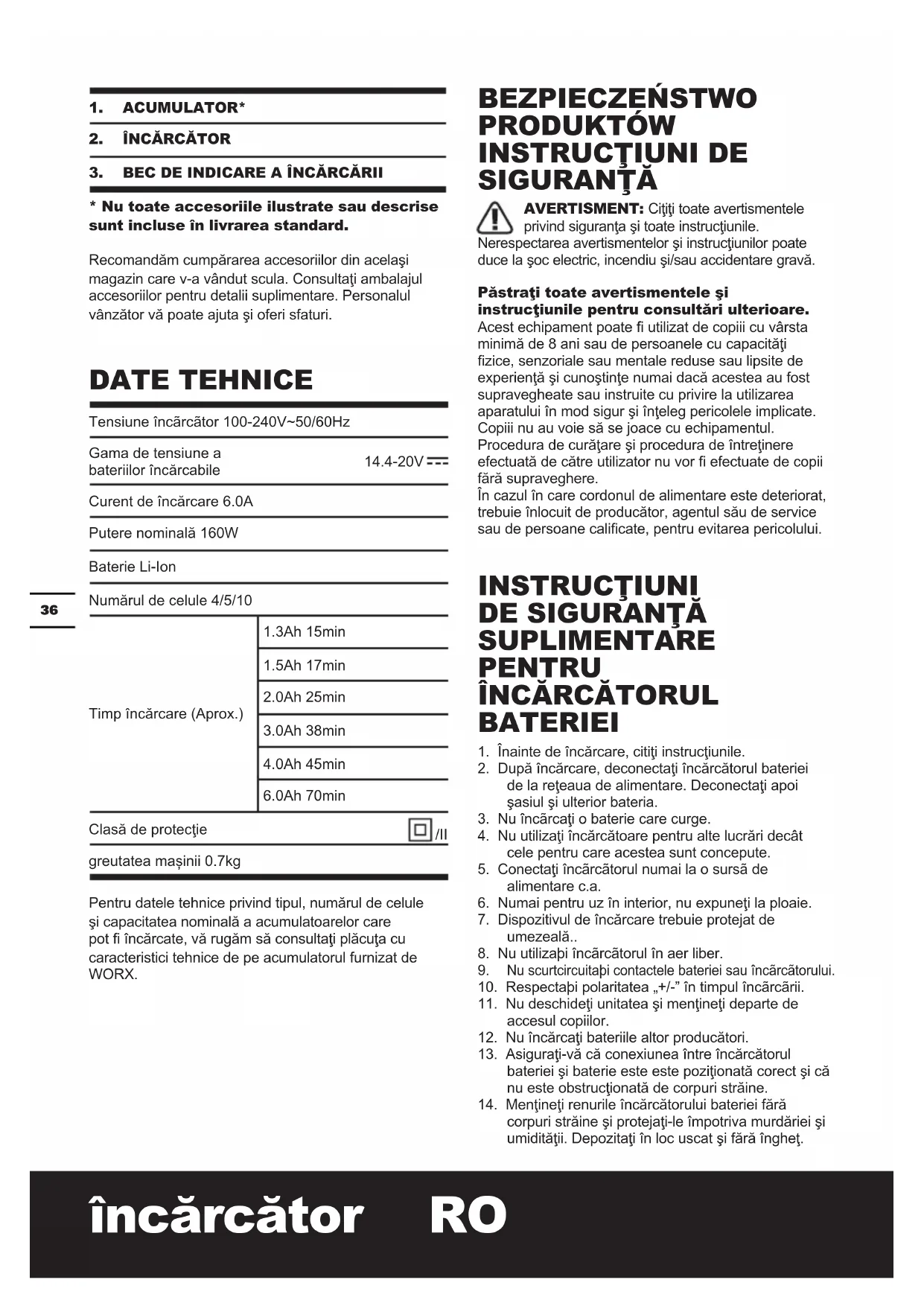 *Nutoateaccesoriileilustratesaudescrise suntincluseînlivrareastandard. Recomandăm cumpărarea accesoriilor din acelaşi magazin care v-a vândut scula. Consultaţi ambalajul accesoriilor pentru detalii suplimentare. Personalul vânzător vă poate ajuta şi oferi sfaturi. DATETEHNICE Tensiune încãrcãtor 100-240V~50/60Hz Gama de tensiune a bateriilor încărcabile 14.4-20V Curent de încărcare 6.0A Putere nominală 160W Baterie Li-Ion Numărul de celule 4/5/10 Timp încărcare (Aprox.) 1.3Ah 15min 1.5Ah 17min 2.0Ah 25min 3.0Ah 38min 4.0Ah 45min 6.0Ah 70min Clasă de protecţie /II greutatea mașinii 0.7kg Pentru datele tehnice privind tipul, numărul de celule şi capacitatea nominală a acumulatoarelor care pot încărcate, vă rugăm să consultaţi plăcuţa cu caracteristici tehnice de pe acumulatorul furnizat de WORX. BEZPIECZEŃSTWO PRODUKTÓW INSTRUCŢIUNIDE SIGURANŢĂ AVERTISMENT:Ciţiţi toate avertismentele privind siguranţa şi toate instrucţiunile. Nerespectarea avertismentelor şi instrucţiunilor poate duce la şoc electric, incendiu şi/sau accidentare gravă. Păstraţitoateavertismenteleşi instrucţiunilepentruconsultăriulterioare. Acest echipament poate utilizat de copiii cu vârsta minimă de 8 ani sau de persoanele cu capacităţi zice, senzoriale sau mentale reduse sau lipsite de experienţă şi cunoştinţe numai dacă acestea au fost supravegheate sau instruite cu privire la utilizarea aparatului în mod sigur şi înţeleg pericolele implicate. Copiii nu au voie să se joace cu echipamentul. Procedura de curăţare şi procedura de întreţinere efectuată de către utilizator nu vor efectuate de copii fără supraveghere. În cazul în care cordonul de alimentare este deteriorat, trebuie înlocuit de producător, agentul său de service sau de persoane calicate, pentru evitarea pericolului. INSTRUCŢIUNI DESIGURANŢĂ SUPLIMENTARE PENTRU
