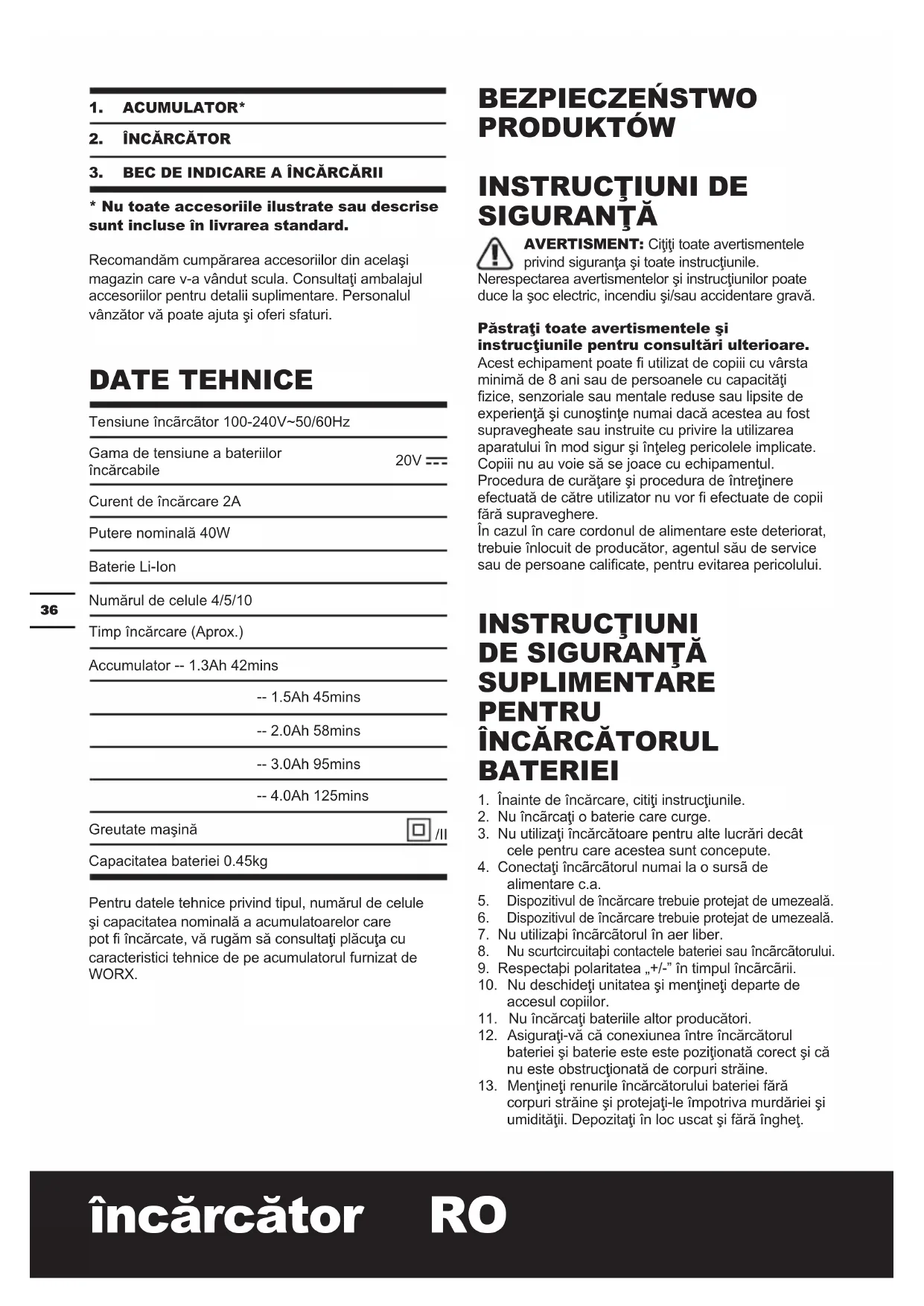 *Nutoateaccesoriileilustratesaudescrise suntincluseînlivrareastandard. Recomandăm cumpărarea accesoriilor din acelaşi magazin care v-a vândut scula. Consultaţi ambalajul accesoriilor pentru detalii suplimentare. Personalul vânzător vă poate ajuta şi oferi sfaturi. DATETEHNICE Tensiune încãrcãtor 100-240V~50/60Hz Gama de tensiune a bateriilor încărcabile 20V Curent de încărcare 2A Putere nominală 40W Baterie Li-Ion Numărul de celule 4/5/10 Timp încărcare (Aprox.) Accumulator -- 1.3Ah 42mins -- 1.5Ah 45mins -- 2.0Ah 58mins -- 3.0Ah 95mins -- 4.0Ah 125mins Greutate maşină /II Capacitatea bateriei 0.45kg Pentru datele tehnice privind tipul, numărul de celule şi capacitatea nominală a acumulatoarelor care pot încărcate, vă rugăm să consultaţi plăcuţa cu caracteristici tehnice de pe acumulatorul furnizat de WORX. BEZPIECZEŃSTWO PRODUKTÓW INSTRUCŢIUNIDE SIGURANŢĂ AVERTISMENT:Ciţiţi toate avertismentele privind siguranţa şi toate instrucţiunile. Nerespectarea avertismentelor şi instrucţiunilor poate duce la şoc electric, incendiu şi/sau accidentare gravă. Păstraţitoateavertismenteleşi instrucţiunilepentruconsultăriulterioare. Acest echipament poate utilizat de copiii cu vârsta minimă de 8 ani sau de persoanele cu capacităţi zice, senzoriale sau mentale reduse sau lipsite de experienţă şi cunoştinţe numai dacă acestea au fost supravegheate sau instruite cu privire la utilizarea aparatului în mod sigur şi înţeleg pericolele implicate. Copiii nu au voie să se joace cu echipamentul. Procedura de curăţare şi procedura de întreţinere efectuată de către utilizator nu vor efectuate de copii fără supraveghere. În cazul în care cordonul de alimentare este deteriorat, trebuie înlocuit de producător, agentul său de service sau de persoane calicate, pentru evitarea pericolului. INSTRUCŢIUNI DESIGURANŢĂ SUPLIMENTARE PENTRU