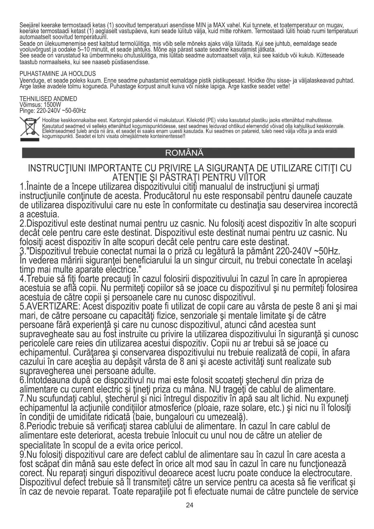 Veenduge, et seade poleks kuum. Enne seadme puhastamist eemaldage pistik pistikupesast. Hoidke õhu sisse- ja väljalaskeavad puhtad. Ärge laske avadele tolmu koguneda. Puhastage korpust ainult kuiva või niiske lapiga. Ärge kastke seadet vette! TEHNILISED ANDMED Võimsus: 1500W Pinge: 220-240V ~50-60Hz Hoolitse keskkonnakaitse eest. Kartongist pakendid vii makulatuuri. Kilekotid (PE) viska kasutatud plastiku jaoks ettenähtud mahutitesse. Kasutatud seadmed vii selleks ettenähtud kogumispunktidesse, sest seadmes leiduvad ohtlikud elemendid võivad olla kahjulikud keskkonnale. Elektriseadmed tuleb anda nii ära, et seadet ei saaks enam uuesti kasutada. Kui seadmes on patareid, tuleb need välja võtta ja anda eraldi kogumispunkti. Seadet ei tohi visata olmejäätmete konteineritesse!! ROMÂNĂ INSTRUCŢIUNI IMPORTANTE CU PRIVIRE LA SIGURANŢA DE UTILIZARE CITIŢI CU ATENŢIE ŞI PĂSTRAŢI PENTRU VIITOR 1.Înainte de a începe utilizarea dispozitivului citiţi manualul de instrucţiuni şi urmaţi instrucţiunile conţinute de acesta. Producătorul nu este responsabil pentru daunele cauzate de utilizarea dispozitivului care nu este în conformitate cu destinaţia sau deservirea incorectă a acestuia. 2.Dispozitivul este destinat numai pentru uz casnic. Nu folosiţi acest dispozitiv în alte scopuri decât cele pentru care este destinat. Dispozitivul este destinat numai pentru uz casnic. Nu folosiţi acest dispozitiv în alte scopuri decât cele pentru care este destinat. 3."Dispozitivul trebuie conectat numai la o priză cu legătură la pământ 220-240V ~50Hz. În vederea măririi siguranţei beneficiarului la un singur circuit, nu trebui conectate în acelaşi timp mai multe aparate electrice." 4.Trebuie să fiţi foarte precauţi în cazul folosirii dispozitivului în cazul în care în apropierea acestuia se află copii. Nu permiteţi copiilor să se joace cu dispozitivul şi nu permiteţi folosirea acestuia de către copii şi persoanele care nu cunosc dispozitivul. 5.AVERTIZARE: Acest dispozitiv poate fi utilizat de copii care au vârsta de peste 8 ani şi mai mari, de către persoane cu capacităţi fizice, senzoriale şi mentale limitate şi de către persoane fără experienţă şi care nu cunosc dispozitivul, atunci când acestea sunt supravegheate sau au fost instruite cu privire la utilizarea dispozitivului în siguranţă şi cunosc pericolele care reies din utilizarea acestui dispozitiv. Copii nu ar trebui să se joace cu echipamentul. Curăţarea şi conservarea dispozitivului nu trebuie realizată de copii, în afara cazului în care aceştia au depăşit vârsta de 8 ani şi aceste activităţi sunt realizate sub supravegherea unei persoane adulte. 6.Întotdeauna după ce dispozitivul nu mai este folosit scoateţi ştecherul din priza de alimentare cu curent electric şi ţineţi priza cu mâna. NU trageţi de cablul de alimentare. 7.Nu scufundaţi cablul, ştecherul şi nici întregul dispozitiv în apă sau alt lichid. Nu expuneţi echipamentul la acţiunile condiţiilor atmosferice (ploaie, raze solare, etc.) şi nici nu îl folosiţi în condiţii de umiditate ridicată (baie, bungalouri cu umezeală). 8.Periodic trebuie să verificaţi starea cablului de alimentare. În cazul în care cablul de alimentare este deteriorat, acesta trebuie înlocuit cu unul nou de către un atelier de specialitate în scopul de a evita orice pericol. 9.Nu folosiţi dispozitivul care are defect cablul de alimentare sau în cazul în care acesta a fost scăpat din mână sau este defect în orice alt mod sau în cazul în care nu funcţionează corect. Nu reparaţi singuri dispozitivul deoarece acest lucru poate conduce la electrocutare. Dispozitivul defect trebuie să îl transmiteţi către un service pentru ca acesta să fie verificat şi în caz de nevoie reparat. Toate reparaţiile pot fi efectuate numai de către punctele de service25 care posedă autorizaţie. Reparaţia care nu este realizată incorect poate cauza pericol grav pentru beneficiar. 10.Dispozitivul trebuie amplasat pe o suprafaţă stabilă, netedă, departe de dispozitivele de bucătărie care redau căldură, aşa cum ar fi: aragazul electric şi cel pe gaz etc. 11.Nu folosiţi dispozitivul în apropierea materialelor combustibile. 12.Cablul de alimentare nu poate să atârne peste marginea mesei sau să atingă suprafeţele fierbinţi. 13.Nu se permite lăsarea dispozitivului pornit şi nici a alimentatorului în priză fără supraveghere. 14.Pentru a asigura o protecţie suplimentară, se recomandă instalarea pe circuitul electric a unui dispozitiv cu curent diferenţial (RCD) cu curent alternativ diferenţial care nu va depăşi 30 mA. În acest sens trebuie să vă adresaţi unui electrician specialist.