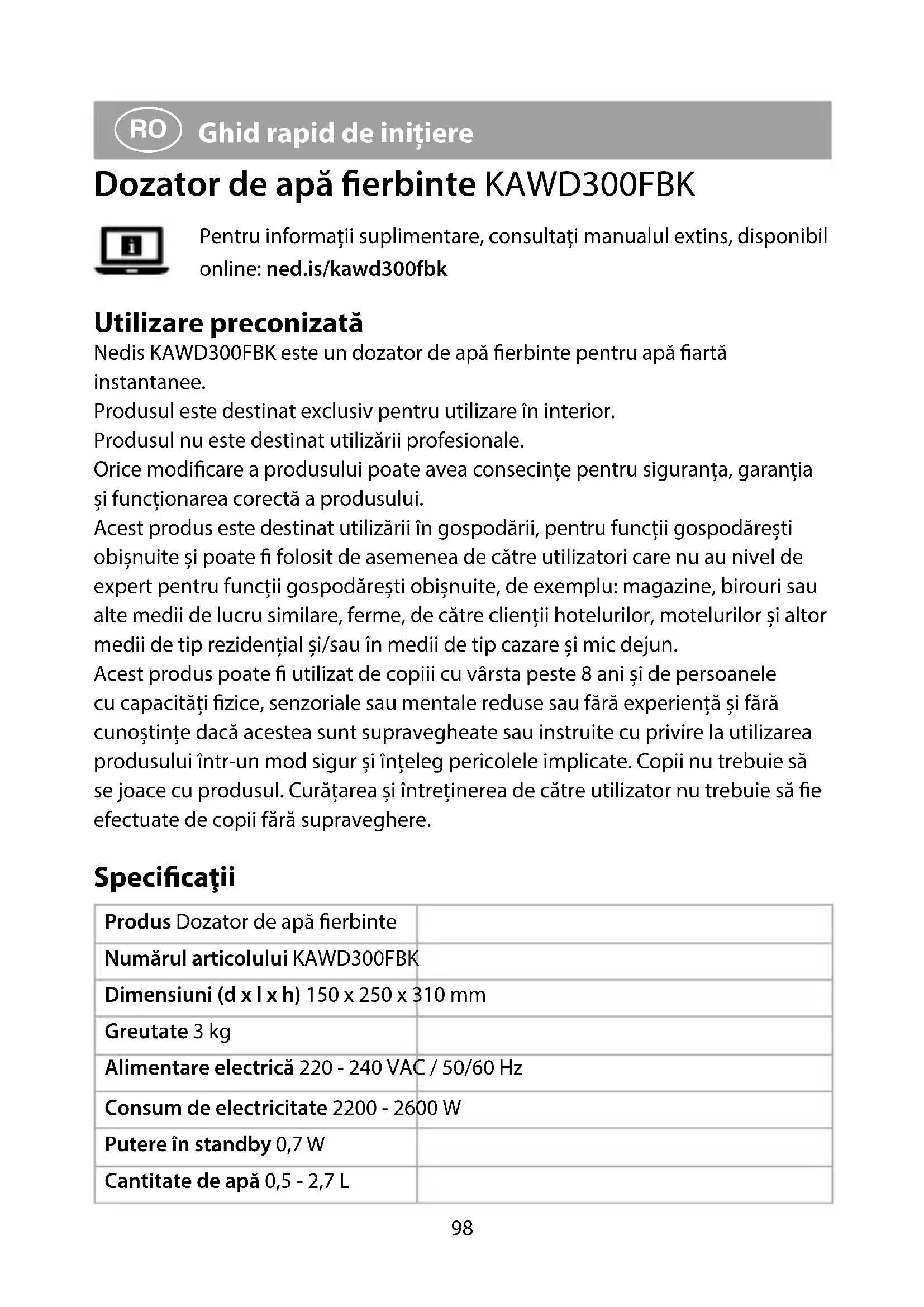 Ghid rapid de inițiere Dozator de apă erbinte KAWD300FBK Pentru informații suplimentare, consultați manualul extins, disponibil online: ned.is/kawd300fbk Utilizare preconizată Nedis KAWD300FBK este un dozator de apă erbinte pentru apă artă instantanee. Produsul este destinat exclusiv pentru utilizare în interior. Produsul nu este destinat utilizării profesionale. Orice modicare a produsului poate avea consecințe pentru siguranța, garanția și funcționarea corectă a produsului. Acest produs este destinat utilizării în gospodării, pentru funcții gospodărești obișnuite și poate folosit de asemenea de către utilizatori care nu au nivel de expert pentru funcții gospodărești obișnuite, de exemplu: magazine, birouri sau alte medii de lucru similare, ferme, de către clienții hotelurilor, motelurilor și altor medii de tip rezidențial și/sau în medii de tip cazare și mic dejun. Acest produs poate utilizat de copiii cu vârsta peste 8 ani și de persoanele cu capacități zice, senzoriale sau mentale reduse sau fără experiență și fără cunoștințe dacă acestea sunt supravegheate sau instruite cu privire la utilizarea produsului într-un mod sigur și înțeleg pericolele implicate. Copii nu trebuie să se joace cu produsul. Curățarea și întreținerea de către utilizator nu trebuie să e efectuate de copii fără supraveghere. Specicaţii Produs Dozator de apă erbinte Numărul articolului KAWD300FBK Dimensiuni (d x l x h) 150 x 250 x 310 mm Greutate 3 kg Alimentare electrică 220 - 240 VAC / 50/60 Hz Consum de electricitate 2200 - 2600 W Putere în standby 0,7 W Cantitate de apă 0,5 - 2,7 L KAWD300FBK_MAN_COMP_0520_print_(20160 1422)_v00.01.indd 98KAWD300FBK_MAN_COMP_0520_print_(20160 1422)_v00.01.indd 98 03-06-2020 08:2703-06-2020 08:2799 Piese principale (imagine A)
