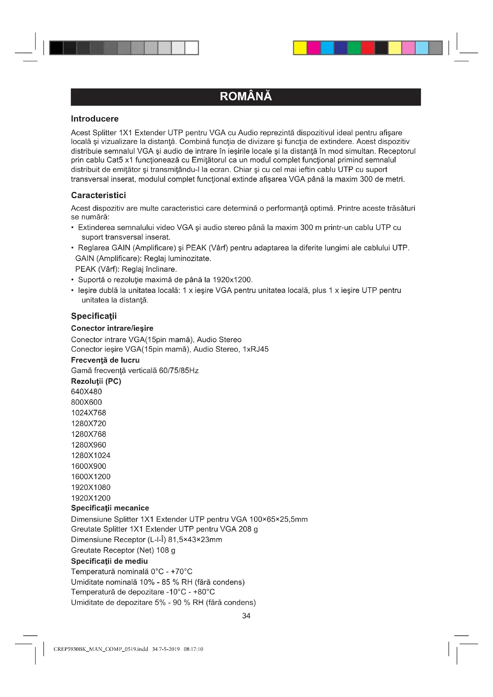 - Ieşire dublă la unitatea locală: 1 x ieşire VGA pentru unitatea locală, plus 1 x ieşire UTP pentru unitatea la distanţă. Specicaţii Conector intrare/ieşire Conector intrare VGA(15pin mamă), Audio Stereo Conector ieşire VGA(15pin mamă), Audio Stereo, 1xRJ45 Frecvenţă de lucru Gamă frecvenţă verticală 60/75/85Hz Rezoluţii (PC) 640X480 800X600 1024X768 1280X720 1280X768 1280X960 1280X1024 1600X900 1600X1200 1920X1080 1920X1200 Specicaţii mecanice Dimensiune Splitter 1X1 Extender UTP pentru VGA 100×65×25,5mm Greutate Splitter 1X1 Extender UTP pentru VGA 208 g Dimensiune Receptor (L-l-Î) 81,5×43×23mm Greutate Receptor (Net) 108 g Specicaţii de mediu Temperatură nominală 0°C - +70°C Umiditate nominală 10% - 85 % RH (fără condens) Temperatură de depozitare -10°C - +80°C Umiditate de depozitare 5% - 90 % RH (fără condens) CREP5930BK_MAN_COMP_0519.indd 34 7-5-2019 08:17:1035 Cerinţe alimentare Alimentare cu curent pentru Splitter 1X1 Extender UTP pentru VGA 5V@2A, max 5W Alimentare cu curent pentru receptor 5V@2A, max 5W Aprobări de reglementare Unitate convertor FCC,CE,UL Alimentare cu curent: UL,CE,FCC Observaţie: Specicaţiile pot modicate fără înştiinţare. Conţinutul pachetului Înainte de a începe să utilizaţi această unitate, vă rugăm să vericaţi pachetul şi să vă asiguraţi că următoarele elemente sunt incluse în el: