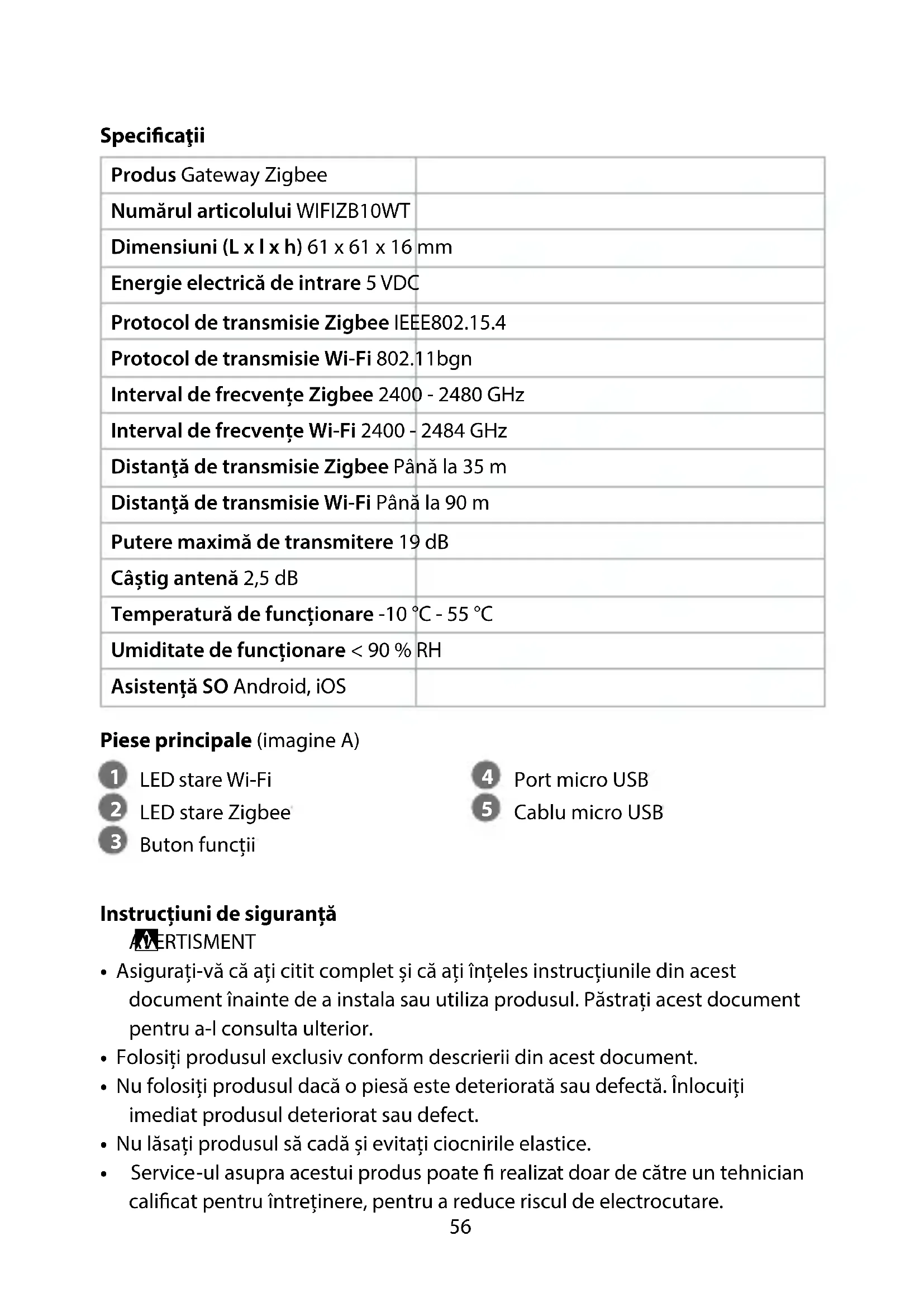 Ghid rapid de inițiere Gateway Zigbee WIFIZB10WT Pentru informații suplimentare, consultați manualul extins, disponibil online: ned.is/wizb10wt Utilizare preconizatăAcest produs este destinat conectării mai multor senzori la aplicația Nedis SmartLife prin intermediul unei conexiuni wireless Zigbee.Produsul este destinat exclusiv pentru utilizare în interior.Produsul nu este destinat utilizării profesionale.Orice modicare a produsului poate avea consecințe pentru siguranța, garanția și funcționarea corectă a produsului.56 Specicaţii Produs Gateway Zigbee Numărul articolului WIFIZB10WT Dimensiuni (L x l x h) 61 x 61 x 16 mm Energie electrică de intrare 5 VDC Protocol de transmisie Zigbee IEEE802.15.4 Protocol de transmisie Wi-Fi 802.11bgn Interval de frecvențe Zigbee 2400 - 2480 GHz Interval de frecvențe Wi-Fi 2400 - 2484 GHz Distanţă de transmisie Zigbee Până la 35 m Distanţă de transmisie Wi-Fi Până la 90 m Putere maximă de transmitere 19 dB Câștig antenă 2,5 dB Temperatură de funcționare -10 °C - 55 °C Umiditate de funcționare < 90 % RH Asistență SO Android, iOS Piese principale (imagine A)