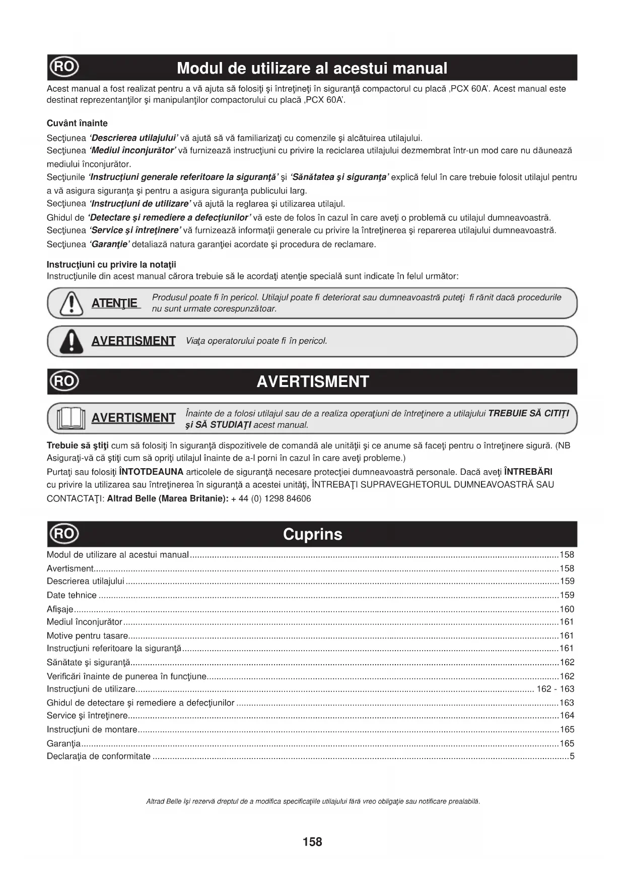 Cuprins Trebuie să útiĠi cum să folosiĠi în siguranĠă dispozitivele de comandă ale unităĠii úi ce anume să faceĠi pentru o întreĠinere sigură. (NB AsiguraĠi-vă că útiĠi cum să opriĠi utilajul înainte de a-l porni în cazul în care aveĠi probleme.) PurtaĠi sau folosiĠi ÎNTOTDEAUNA articolele de siguranĠă necesare protecĠiei dumneavoastră personale. Dacă aveĠi ÎNTREBĂRI cu privire la utilizarea sau întreĠinerea în siguranĠă a acestei unităĠi, ÎNTREBAğI SUPRAVEGHETORUL DUMNEAVOASTRĂ SAU CONTACTAğI: Altrad Belle (Marea Britanie): + 44 (0) 1298 84606