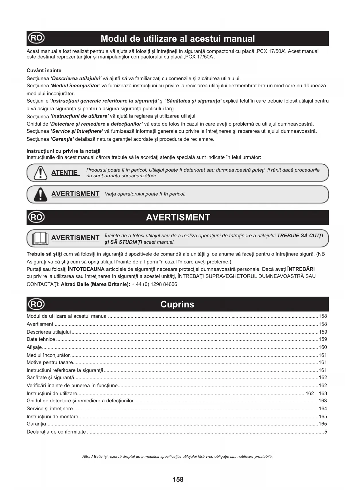 Cuprins Trebuie să útiĠi cum să folosiĠi în siguranĠă dispozitivele de comandă ale unităĠii úi ce anume să faceĠi pentru o întreĠinere sigură. (NB AsiguraĠi-vă că útiĠi cum să opriĠi utilajul înainte de a-l porni în cazul în care aveĠi probleme.) PurtaĠi sau folosiĠi ÎNTOTDEAUNA articolele de siguranĠă necesare protecĠiei dumneavoastră personale. Dacă aveĠi ÎNTREBĂRI cu privire la utilizarea sau întreĠinerea în siguranĠă a acestei unităĠi, ÎNTREBAğI SUPRAVEGHETORUL DUMNEAVOASTRĂ SAU CONTACTAğI: Altrad Belle (Marea Britanie): + 44 (0) 1298 84606