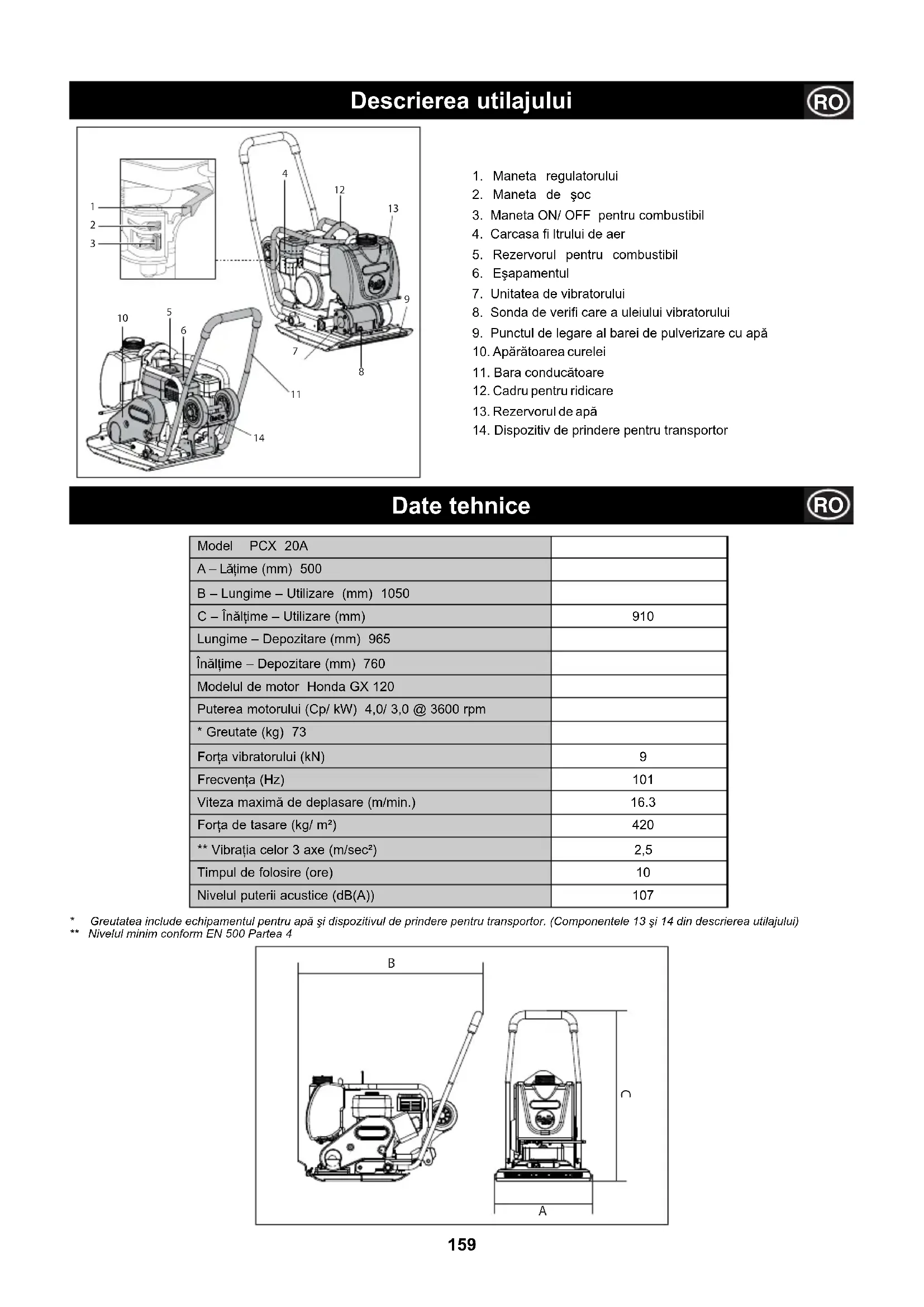VibraÚiile O parte din vibraiile din cursul operaiunii de netezire sunt transmise prin bara conduc×toare mâinilor manipulantului. Consultai specië caiile Ùii datele tehnice pentru nivelele de vibraie Ùi timpii de folosire (timpul zilnic maxim recomandat pentru folosire). NU DEPII timpii maximi de folosire. EPP (Echipamentul Personal de ProtecÚie) EPP corespunz×tor trebuie purtat când se foloseÙte acest utilaj, adic× ochelari de protecie, m×nuÙi, c×Ùti de protecie pentru urechi, masc× împotriva prafului Ùi înc×l×minte cu vârf metalic (cu t×lpi anti-derapante pentru protecie suplimentar×). Purtai îmbr×c×minte corespunz×toare activit×ii pe care o desf×Ùurai. Protejai-v× întotdeauna pielea de contactul cu betonul. Praful Procesul de tasare poate produce praf, ceea ce poate ë periculos pentru s×n×tatea dumneavoastr×. Întotdeauna purtai o masc× potrivit× tipului de praf produs. Combustibilul Nu ingerai sau inhalai vapori de combustibil Ùi evitai contactul cu pielea. Sp×lai imediat pielea cu ap× dac× a intrat în contact cu combustibilul. Dac× v× intr× în ochi combustibil, sp×lai cu ap× din abunden× Ùi consultai imdeiat medicul. Gazele de eÙapament Nu utilizai utilajul ‚PCX 20A’ în spaii închise sau în interior. Asigurai-v× c× zona de lucru este ventilat× corespunz×tor. Inspectarea înainte de punerea în funcÚiune Urm×toarele instruciuni de inspectare înainte de punerea în funciune trebuie efectuate înainte de începerea ë ec×rei sesiuni de lucru sau dup× ë ecare patru ore de utilizare, care dintre acestea are loc mai întâi. V× rug×m s× consultai seciunea de service pentru instruciuni mai detaliate. Dac× se descoper× orice defect, utilajul ‚PCX 20A’ nu trebuie folosit înainte de a remedia defectul în cauz×.
