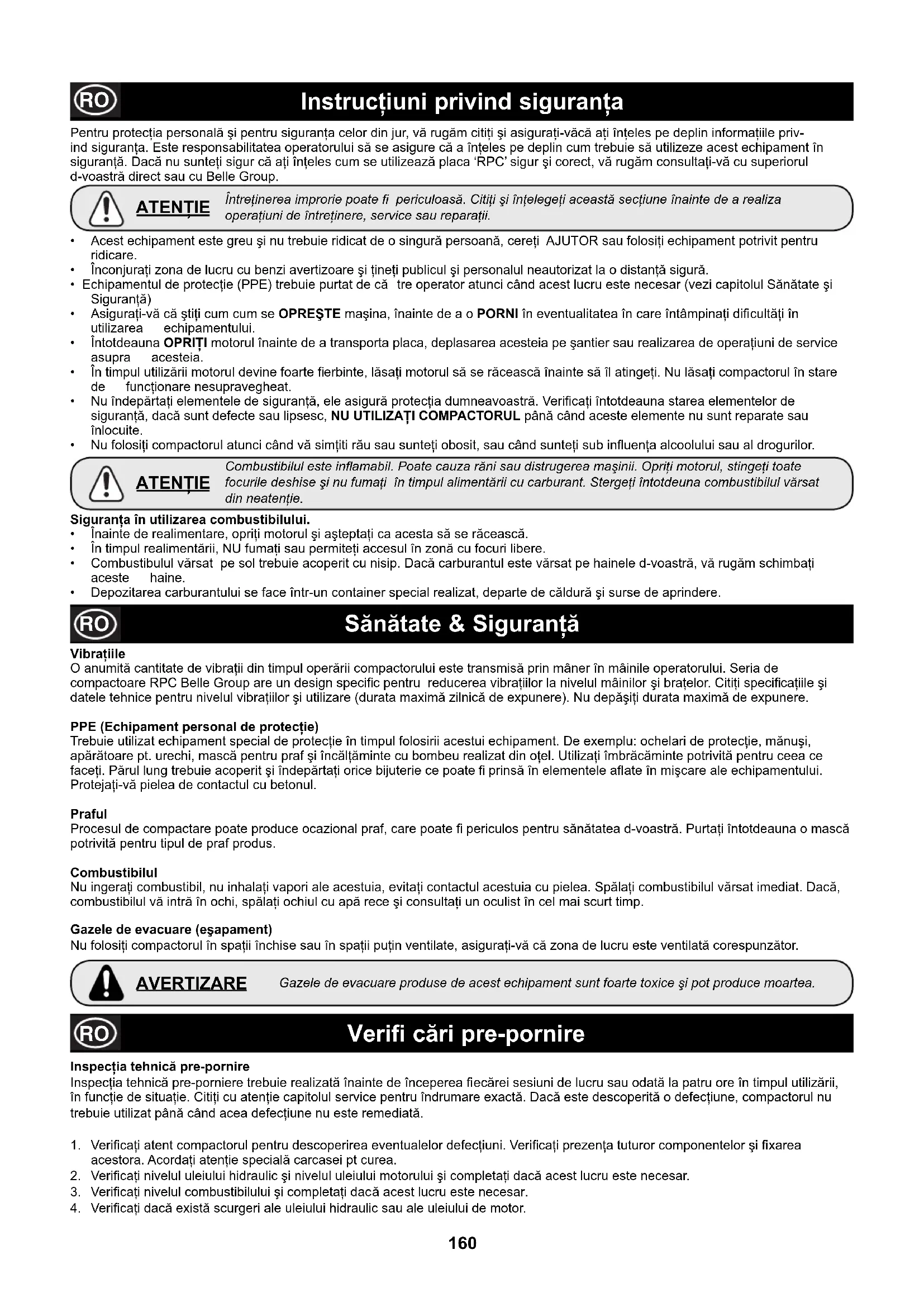 VibraÒiile O anumitK cantitate de vibraLii din timpul operKrii compactorului este transmisK prin mâner în mâinile operatorului. Seria de compactoare RPC Belle Group are un design speciÈ c pentru reducerea vibraLiilor la nivelul mâinilor Mi braLelor. CitiLi speciÈ caLiile Mi datele tehnice pentru nivelul vibraLiilor Mi utilizare (durata maximK zilnicK de expunere). Nu depKMiLi durata maximK de expunere. PPE (Echipament personal de protecÒie) Trebuie utilizat echipament special de protecLie în timpul folosirii acestui echipament. De exemplu: ochelari de protecLie, mKnuMi, apKrKtoare pt. urechi, mascK pentru praf Mi încKlLKminte cu bombeu realizat din oLel. UtilizaLi îmbrKcKminte potrivitK pentru ceea ce faceLi. PKrul lung trebuie acoperit Mi îndepKrtaLi orice bijuterie ce poate È prinsK în elementele aÎ ate în miMcare ale echipamentului. ProtejaLi-vK pielea de contactul cu betonul. Praful Procesul de compactare poate produce ocazional praf, care poate È periculos pentru sKnKtatea d-voastrK. PurtaLi întotdeauna o mascK potrivitK pentru tipul de praf produs. Combustibilul Nu ingeraL i combustibil, nu inhalaLi vapori ale acestuia, evitaLi contactul acestuia cu pielea. SpKlaLi combustibilul vKrsat imediat. DacK, combustibilul vK intrK în ochi, spKlaLi ochiul cu apK rece Mi consultaLi un oculist în cel mai scurt timp. Gazele de evacuare (eÞapament) Nu folosiLi compactorul în spaLii închise sau în spaLii puLin ventilate, asiguraLi-vK cK zona de lucru este ventilatK corespunzKtor. SÑnÑtate & SiguranÒÑ Veri cÑri pre-pornire