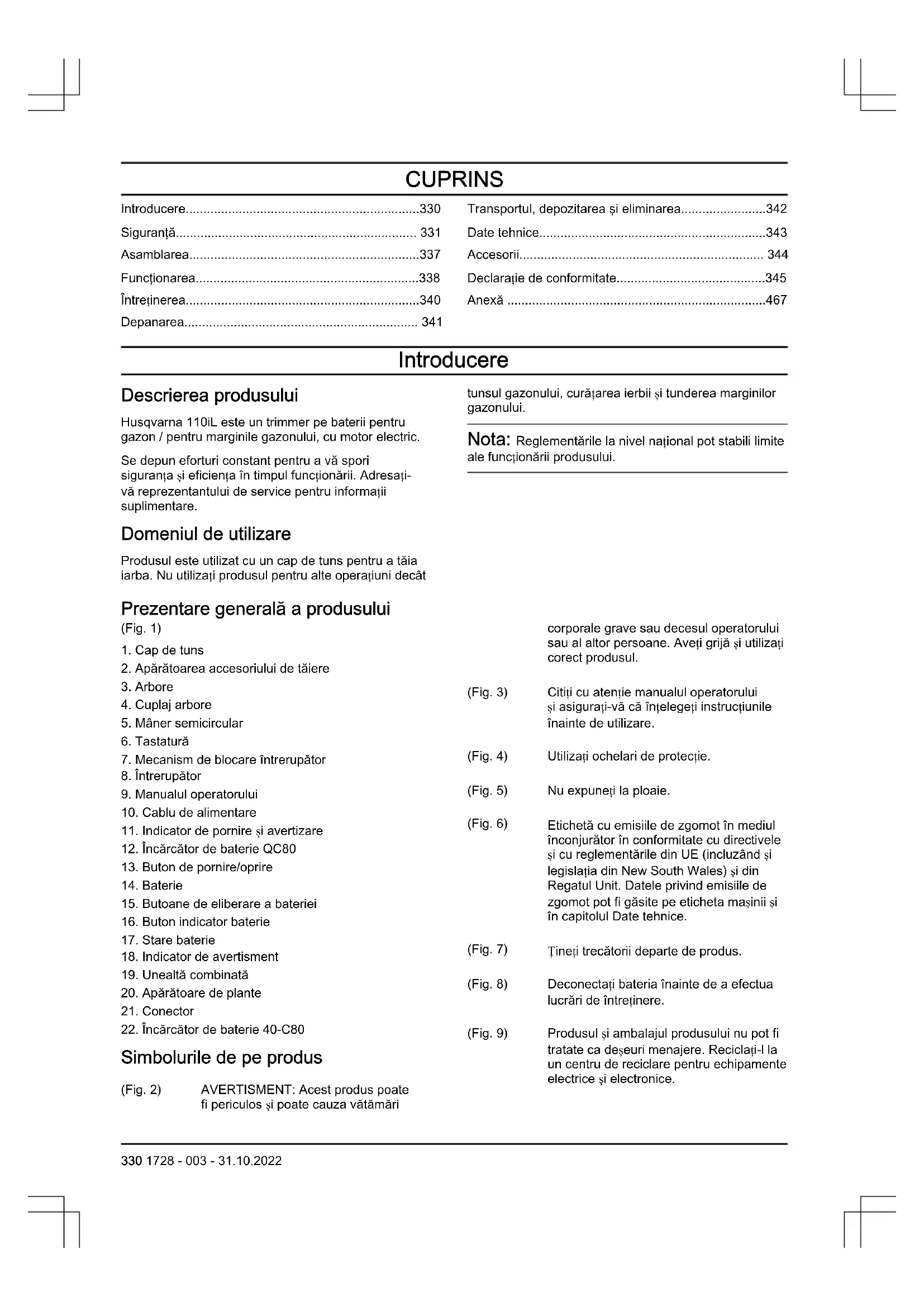 Simbolurile de pe produs (Fig. 2) AVERTISMENT: Acest produs poate fi periculos și poate cauza vătămări corporale grave sau decesul operatorului sau al altor persoane. Aveți grijă și utilizați corect produsul. (Fig. 3) Citiți cu atenție manualul operatorului și asigurați-vă că înțelegeți instrucțiunile înainte de utilizare. (Fig. 4) Utilizați ochelari de protecție. (Fig. 5) Nu expuneți la ploaie. (Fig. 6) Etichetă cu emisiile de zgomot în mediul înconjurător în conformitate cu directivele și cu reglementările din UE (incluzând și legislația din New South Wales) și din Regatul Unit. Datele privind emisiile de zgomot pot fi găsite pe eticheta mașinii și în capitolul Date tehnice. (Fig. 7) Țineți trecătorii departe de produs. (Fig. 8) Deconectați bateria înainte de a efectua lucrări de întreținere. (Fig. 9) Produsul și ambalajul produsului nu pot fi tratate ca deșeuri menajere. Reciclați-l la un centru de reciclare pentru echipamente electrice și electronice. 330 1728 - 003 - 31.10.2022(Fig. 10) Produsul respectă directivele UE aplicabile. (Fig. 11) Produsul este în conformitate cu reglementările aplicabile în Regatul Unit. (Fig. 12) Curent continuu. aaaassxxxxx Plăcuța de identificare sau textul imprimat cu laser indică numărul de serie. aaaa este anul fabricației și ss este săptămâna fabrica- ției. Simbolurile de pe baterie și/sau de pe încărcătorul acesteia (Fig. 16) Reciclați acest produs la un centru de reciclare pentru echi- pamente electrice și electroni- ce. (Este valabilă numai pentru Europa) (Fig. 13) Transformator autoprotejat. (Fig. 14) Utilizați și păstrați încărcătorul de baterie numai în interior. (Fig. 15) Izolație dublă. Răspunderea pentru produs Conform prevederilor legislației privind răspunderea pentru produs, nu ne asumăm răspunderea pentru daunele cauzate de produsul nostru dacă: