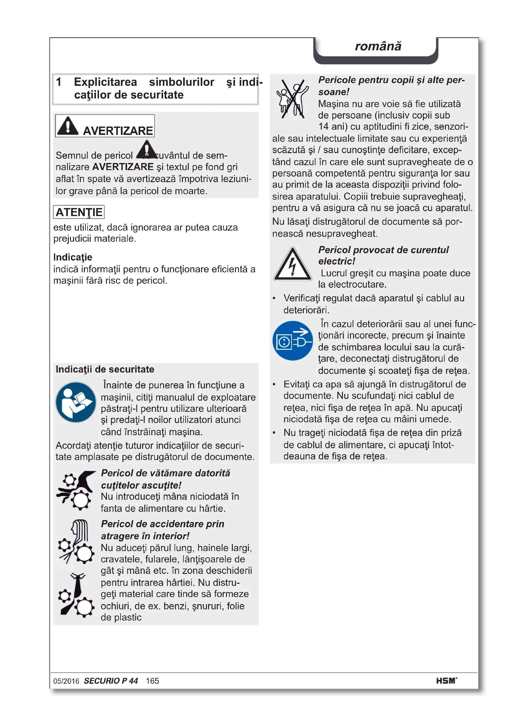 - Az egy menetben vágni kívánt, hosszanti irányban bevezetett lapok (DIN A4, 70 g/m², ill. 80 g/m²) maximális száma. A megadott teljesítményadatok meghatározása új, olajozott vágómű és hideg motor mellett történik. A megadottnál alacsonyabb hálózati feszültség vagy eltérő hálózati frekvencia kisebb lapteljesítményt és nagyobb működési zajt okozhat. A papír minőségétől és tulajdonságaitól, valamint a bevezetés jellegétől függően a lapteljesítmény eltérhet.05/2016 SECURIO P 44 165 română 1 Explicitarea simbolurilor şi indi- caţiilor de securitate Indicaţie indică informaţii pentru o funcţionare efi cientă a maşinii fără risc de pericol. AVERTIZARE Semnul de pericol cu cuvântul de sem- nalizare AVERTIZARE şi textul pe fond gri afl at în spate vă avertizează împotriva leziuni- lor grave până la pericol de moarte. Indicaţii de securitate Înainte de punerea în funcţiune a maşinii, citiţi manualul de exploatare păstraţi-l pentru utilizare ulterioară şi predaţi-l noilor utilizatori atunci când înstrăinaţi maşina. Acordaţi atenţie tuturor indicaţiilor de securi- tate amplasate pe distrugătorul de documente. Pericol de vătămare datorită cuţitelor ascuţite! Nu introduceţi mâna niciodată în fanta de alimentare cu hârtie. Pericol de accidentare prin atragere în interior! Nu aduceţi părul lung, hainele largi, cravatele, fularele, lănţişoarele de gât şi mână etc. în zona deschiderii pentru intrarea hârtiei. Nu distru- geţi material care tinde să formeze ochiuri, de ex. benzi, şnururi, folie de plastic Pericole pentru copii şi alte per- soane! Maşina nu are voie să fi e utilizată de persoane (inclusiv copii sub 14 ani) cu aptitudini fi zice, senzori- ale sau intelectuale limitate sau cu experienţă scăzută şi / sau cunoştinţe defi citare, excep- tând cazul în care ele sunt supravegheate de o persoană competentă pentru siguranţa lor sau au primit de la aceasta dispoziţii privind folo- sirea aparatului. Copiii trebuie supravegheaţi, pentru a vă asigura că nu se joacă cu aparatul. Nu lăsaţi distrugătorul de documente să por- nească nesupravegheat. Pericol provocat de curentul electric! Lucrul greşit cu maşina poate duce la electrocutare.