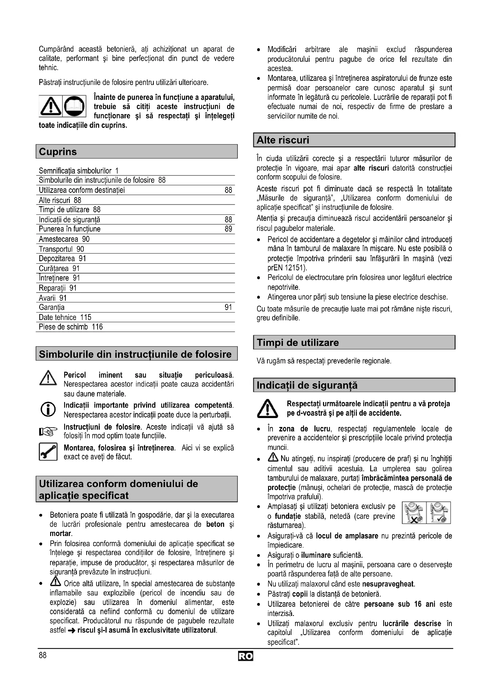 Cuprins Semnificaţia simbolurilor 1 Simbolurile din instrucţiunile de folosire 88 Utilizarea conform destinaţiei 88 Alte riscuri 88 Timpi de utilizare 88 Indicaţii de siguranţă 88 Punerea în funcţiune 89 Amestecarea 90 Transportul 90 Depozitarea 91 Curăţarea 91 Întreţinere 91 Reparaţii 91 Avarii 91 Garanţia 91 Date tehnice 115 Piese de schimb 116