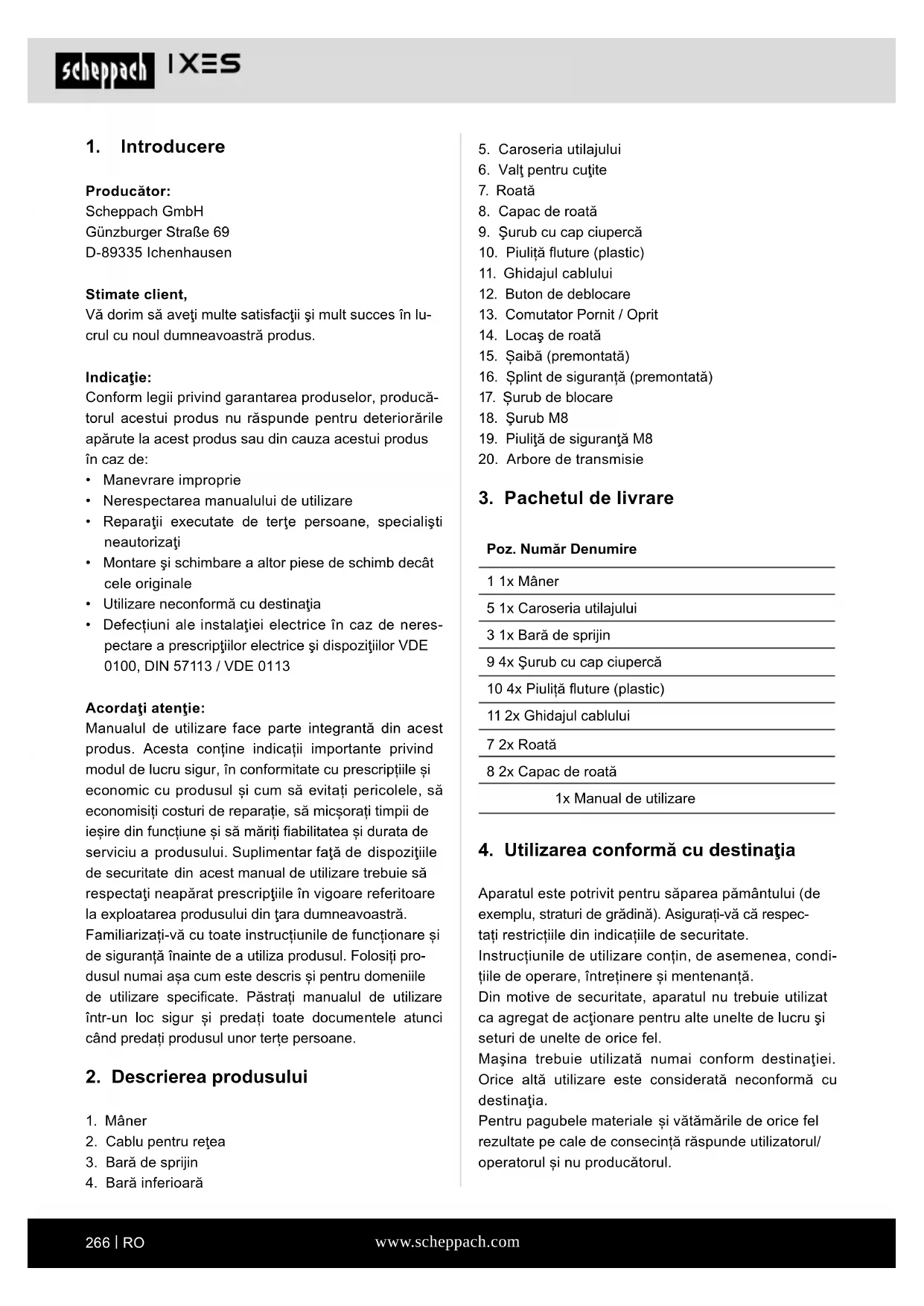 Producător: Scheppach GmbH Günzburger Straße 69 D-89335 Ichenhausen Stimate client, Vă dorim să aveţi multe satisfacţii şi mult succes în lu- crul cu noul dumneavoastră produs. Indicaţie: Conform legii privind garantarea produselor, producă- torul acestui produs nu răspunde pentru deteriorările apărute la acest produs sau din cauza acestui produs în caz de: