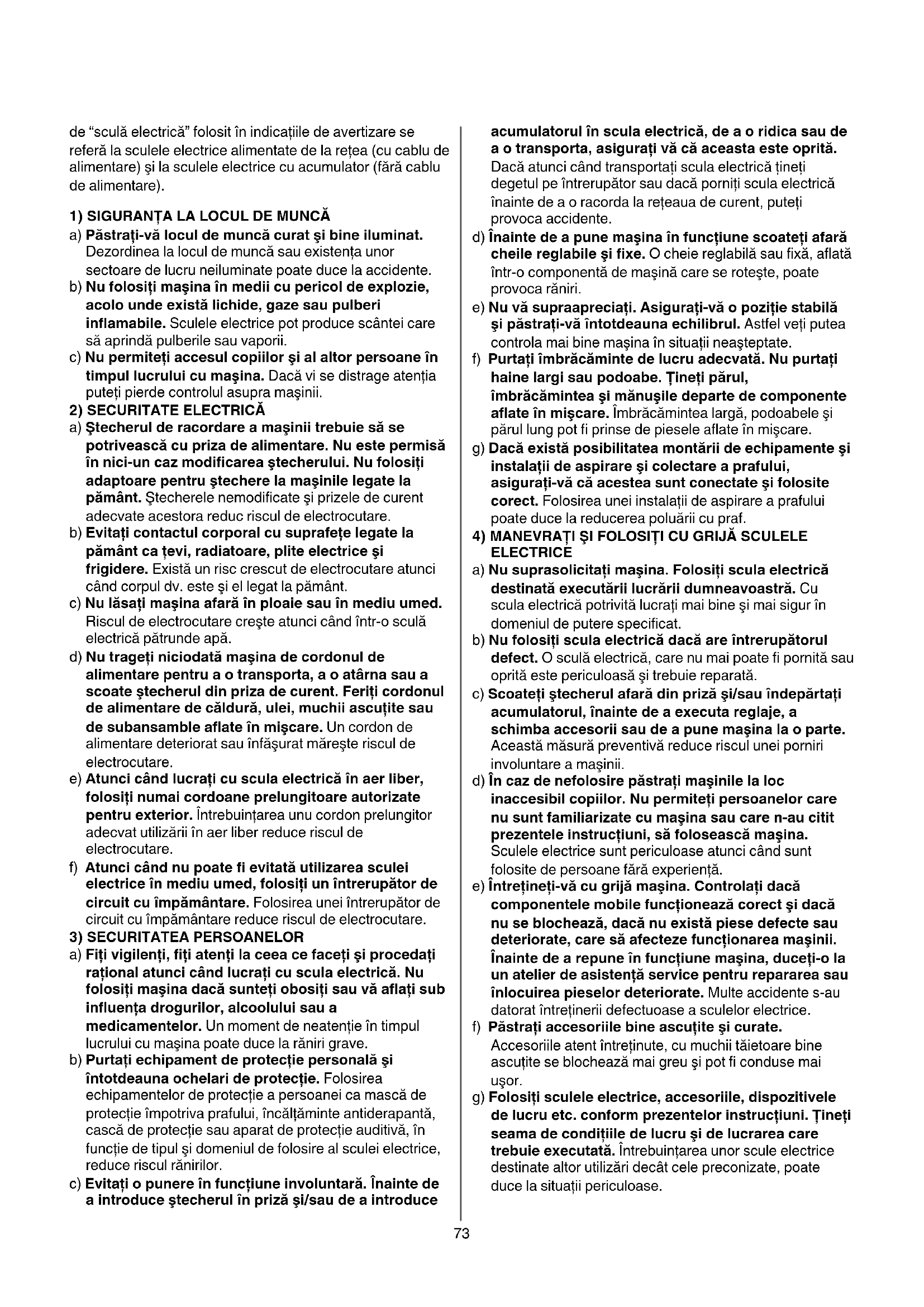 ATENŢIE!Citiţitoateindicaţiiledeavertizareşi instrucţiunile. Nerespectarea indicaţiilor de avertizare şi a instrucţiunilor poate provoca electrocutare, incendii şi/sau răniri grave. Păstraţitoateindicaţiiledeavertizareşi instrucţiunileînvedereautilizărilorviitoare. Termenul73 de “sculă electrică” folosit în indicaţiile de avertizare se referă la sculele electrice alimentate de la reţea (cu cablu de alimentare) şi la sculele electrice cu acumulator (fără cablu de alimentare). 1)SIGURANŢALALOCULDEMUNCĂ a) Păstraţi-văloculdemuncăcuratşibineiluminat. Dezordinea la locul de muncă sau existenţa unor sectoare de lucru neiluminate poate duce la accidente. b) Nufolosiţimaşinaînmediicupericoldeexplozie, acoloundeexistălichide,gazesaupulberi inflamabile. Sculele electrice pot produce scântei care să aprindă pulberile sau vaporii. c) Nupermiteţiaccesulcopiilorşialaltorpersoaneîn timpullucruluicumaşina. Dacă vi se distrage atenţia puteţi pierde controlul asupra maşinii. 2)SECURITATEELECTRICĂ a) Ştecherulderacordareamaşiniitrebuiesăse potriveascăcuprizadealimentare.Nuestepermisă înnici-uncazmodificareaştecherului.Nufolosiţi adaptoarepentruştecherelamaşinilelegatela pământ. Ştecherele nemodificate şi prizele de curent adecvate acestora reduc riscul de electrocutare. b) Evitaţicontactulcorporalcusuprafeţelegatela pământcaţevi,radiatoare,pliteelectriceşi frigidere. Există un risc crescut de electrocutare atunci când corpul dv. este şi el legat la pământ. c) Nulăsaţimaşinaafarăînploaiesauînmediuumed. Riscul de electrocutare creşte atunci când într-o sculă electrică pătrunde apă. d) Nutrageţiniciodatămaşinadecordonulde alimentare pentru a o transporta, a o atârna sau a scoateştecheruldinprizadecurent.Feriţicordonul dealimentaredecăldură,ulei,muchiiascuţitesau desubansambleaflateînmişcare. Un cordon de alimentare deteriorat sau înfăşurat măreşte riscul de electrocutare. e) Atuncicândlucraţicusculaelectricăînaerliber, folosiţinumaicordoaneprelungitoareautorizate pentru exterior. Întrebuinţarea unu cordon prelungitor adecvat utilizării în aer liber reduce riscul de electrocutare. f) Atuncicândnupoatefievitatăutilizareasculei electriceînmediuumed,folosiţiunîntrerupătorde circuitcuîmpământare. Folosirea unei întrerupător de circuit cu împământare reduce riscul de electrocutare.