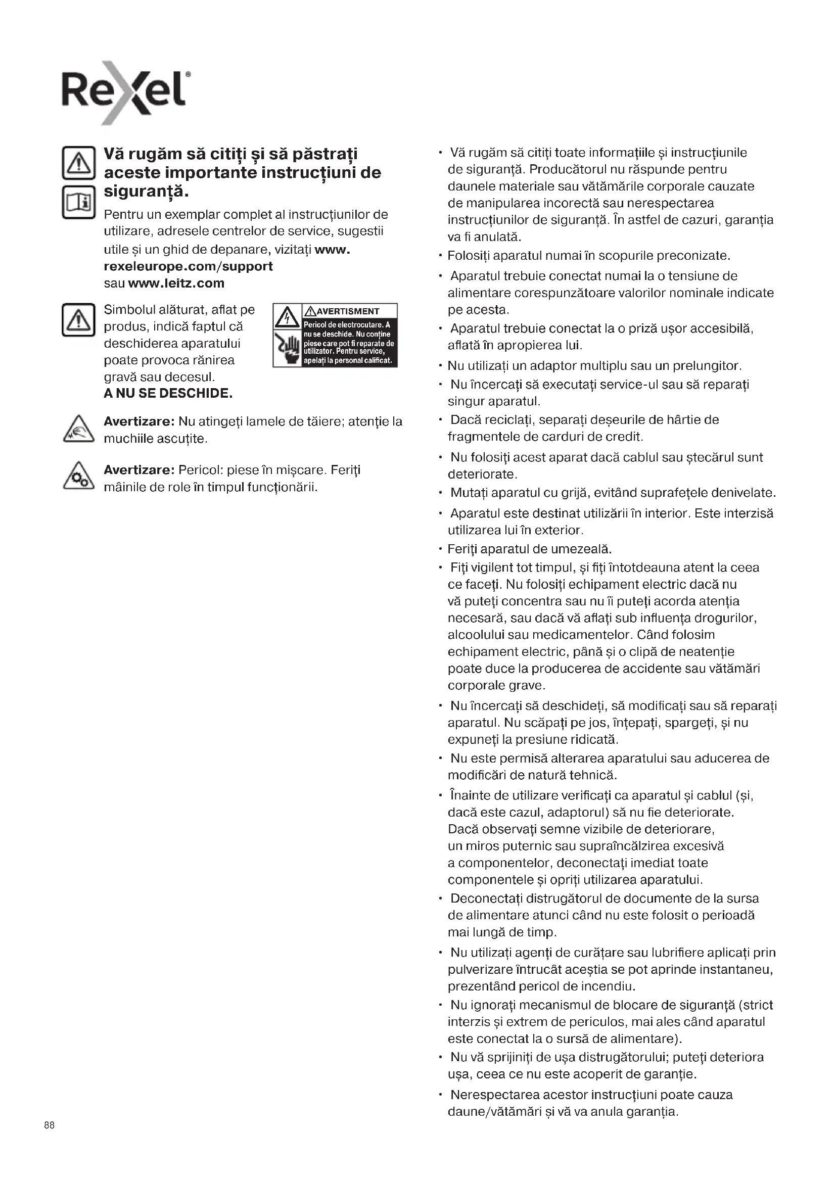 - Nerespectarea acestor instrucțiuni poate cauza daune/vătămări și vă va anula garanția. Vă rugăm să citiți și să păstrați aceste importante instrucțiuni de siguranță. Pentru un exemplar complet al instrucțiunilor de utilizare, adresele centrelor de service, sugestii utile și un ghid de depanare, vizitați www. rexeleurope.com/support sau www.leitz.com Avertizare: Nu atingeți lamele de tăiere; atenție la muchiile ascuțite. Avertizare: Pericol: piese în mișcare. Feriți mâinile de role în timpul funcționării.898989 Feriți bijuteriile pentru a nu fi prinse în aparat Feriți cravatele și hainele largi pentru a nu fi prinse în aparat Simboluri de avertizare Feriți părul lung pentru a nu fi prins în aparat Nu umblați la fanta de alimentare Simboluri de avertizare Capacitate de tăiere (coli) Nu distruge CD-uri Nu distruge capse mai mari de 26 mm Avertizare: piese în mișcare Acest aparat nu este destinat utilizării de către copii Nu utilizați aerosoli. Nu utilizați agenți de curățare sau lubrifiere aplicați prin pulverizare întrucât aceștia se pot aprinde instantaneu, prezentând pericol de incendiu. Icoană Tip Buton glisant / indicator și acțiune Butoane de control Buton de pornire și așteptare (apăsați o singură dată) Buton de revers manual (țineți apăsat) Buton de înaintare manual (țineți apăsat) Indicator de supraîncălzire (lăsați distrugătorul de documente să se răcească) Indicator de supraalimentare / Indicator de blocare (reduceți numărul de coli / îndepărtați blocajul) Modele cu butoane de apăsare Icoană Tip Buton glisant / indicator și acțiune Buton glisant Pornire automată (deplasați în această poziție pentru distrugere) Revers (deplasați în această poziție) Înainte (deplasați în această poziție) Indicatori de stare Oprire (deplasați în această poziție) Indicator Gata de utilizare (capul distrugătorului trebuie să fie pe coș, iar butonul glisant în poziția de pornire automată) Indicator de supraîncălzire (lăsați distrugătorul de documente să se răcească) Comenzi și indicatori Modele cu buton glisant Nu introduceți cărți de credit Accesorii Utilizați numai accesorii Rexel: Coli impregnate cu ulei (20) - 2101949 Coli impregnate cu ulei (12) - 210194890 Hârtie groasă sau carton < 200 gsm Coli multiple pliate (coli A3 pliate în două) Hârtie lucioasă sau o coală imprimată pe ambele părți CD-uri și DVD-uri. Nu utilizați aerosoli Fără ulei, doar foi de ulei Capacitate de distrugere POATE distruge următoarele: