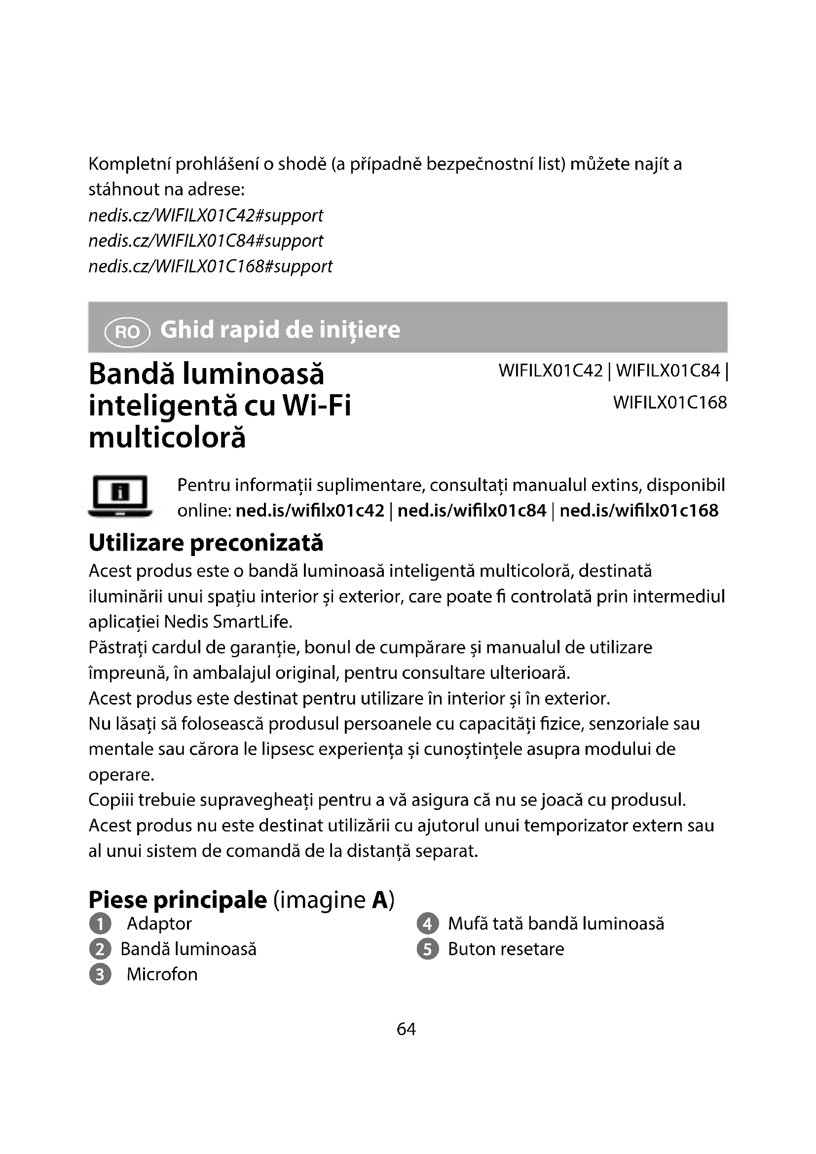 WIFILX01C168 Pentru informații suplimentare, consultați manualul extins, disponibil online: ned.is/wilx01c42 | ned.is/wilx01c84 | ned.is/wilx01c168 Utilizare preconizată Acest produs este o bandă luminoasă inteligentă multicoloră, destinată iluminării unui spațiu interior și exterior, care poate controlată prin intermediul aplicației Nedis SmartLife. Păstrați cardul de garanție, bonul de cumpărare și manualul de utilizare împreună, în ambalajul original, pentru consultare ulterioară. Acest produs este destinat pentru utilizare în interior și în exterior. Nu lăsați să folosească produsul persoanele cu capacități zice, senzoriale sau mentale sau cărora le lipsesc experiența și cunoștințele asupra modului de operare. Copiii trebuie supravegheați pentru a vă asigura că nu se joacă cu produsul. Acest produs nu este destinat utilizării cu ajutorul unui temporizator extern sau al unui sistem de comandă de la distanță separat. Piese principale (imagine A) 1 Adaptor 2 Bandă luminoasă 3 Microfon 4 Mufă tată bandă luminoasă 5 Buton resetare65 Instrucțiuni de siguranță