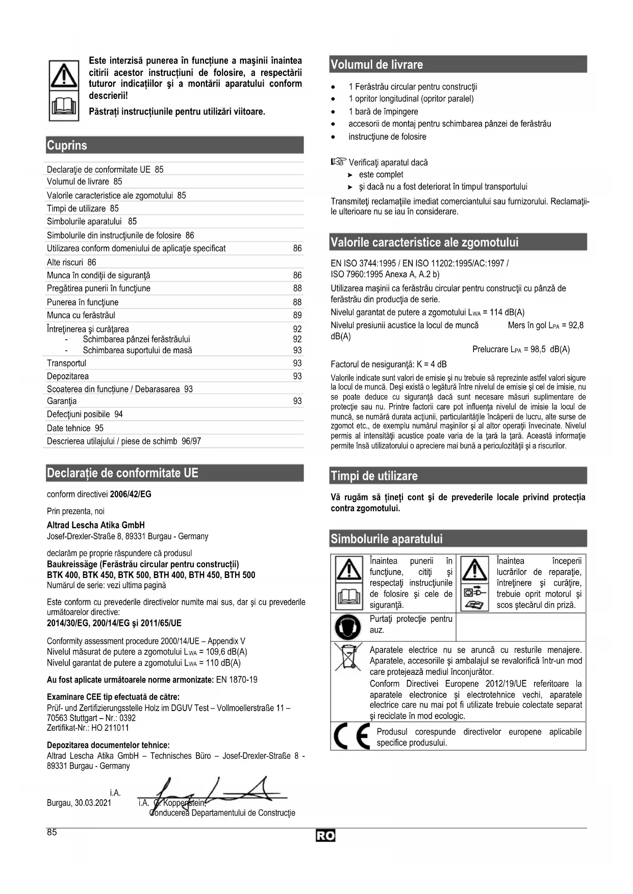 i.A. Burgau, 30.03.2021 i.A. G. Koppenstein, Conducerea Departamentului de Construcţie Volumul de livrare 1 Ferăstrău circular pentru construcţii 1 opritor longitudinal (opritor paralel) 1 bară de împingere accesorii de montaj pentru schimbarea pânzei de ferăstrău instrucţiune de folosire Verificaţi aparatul dacă este complet şi dacă nu a fost deteriorat în timpul transportului Transmiteţi reclamaţiile imediat comerciantului sau furnizorului. Reclamaţii- le ulterioare nu se iau în considerare.