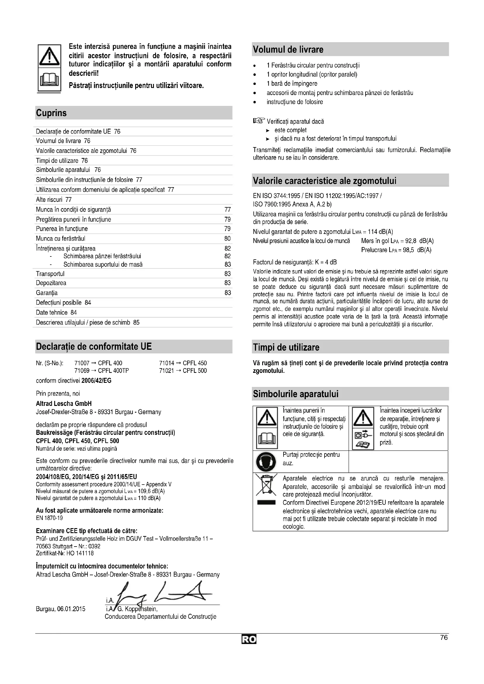 Numărul de serie: vezi ultima pagină Este conform cu prevederile directivelor numite mai sus, dar şi cu prevederile următoarelor directive: 2004/108/EG, 200/14/EG şi 2011/65/EU Conformity assessment procedure 2000/14/UE – Appendix V Nivelul măsurat de putere a zgomotului L = 109,6 dB(A) Nivelul garantat de putere a zgomotului L = 110 dB(A) Au fost aplicate următoarele norme armonizate: EN 1870-19 Examinare CEE tip efectuată de către: Prüf- und Zertifizierungsstelle Holz im DGUV Test – Vollmoellerstraße 11 – 70563 Stuttgart – Nr.: 0392 Zertifikat-Nr.: HO 141118 Împuternicit cu întocmirea documentelor tehnice: Altrad Lescha GmbH – Josef-Drexler-Straße 8 - 89331 Burgau - Germany