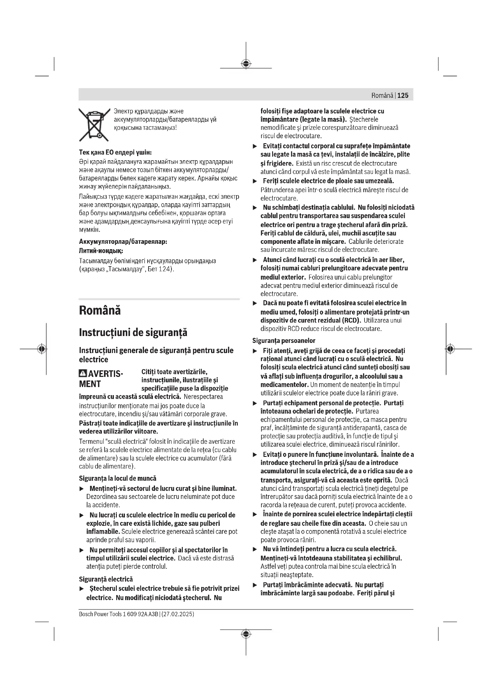 Аккумуляторлар/батареялар: Литий-иондық: Тасымалдау бөліміндегі нұсқауларды орындаңыз (қараңыз „Тасымалдау“, Бет124). Română Instrucţiuni de siguranţă Instrucţiuni generale de siguranţă pentru scule electrice AVERTIS- MENT Citiţi toate avertizările, instrucţiunile, ilustraţiile şi specificaţiile puse la dispoziţie împreună cu această sculă electrică. Nerespectarea instrucţiunilor menţionate mai jos poate duce la electrocutare, incendiu şi/sau vătămări corporale grave. Păstraţi toate indicaţiile de avertizare şi instrucţiunile în vederea utilizărilor viitoare. Termenul "sculă electrică" folosit în indicaţiile de avertizare se referă la sculele electrice alimentate de la reţea (cu cablu de alimentare) sau la sculele electrice cu acumulator (fără cablu de alimentare). Siguranţa la locul de muncă u Menţineţi‑vă sectorul de lucru curat şi bine iluminat. Dezordinea sau sectoarele de lucru neluminate pot duce la accidente. u Nu lucraţi cu sculele electrice în mediu cu pericol de explozie, în care există lichide, gaze sau pulberi inflamabile. Sculele electrice generează scântei care pot aprinde praful sau vaporii. u Nu permiteţi accesul copiilor şi al spectatorilor în timpul utilizării sculei electrice. Dacă vă este distrasă atenţia puteţi pierde controlul. Siguranţă electrică u Ştecherul sculei electrice trebuie să fie potrivit prizei electrice. Nu modificaţi niciodată ştecherul. Nu folosiţi fişe adaptoare la sculele electrice cu împământare (legate la masă). Ştecherele nemodificate şi prizele corespunzătoare diminuează riscul de electrocutare. u Evitaţi contactul corporal cu suprafeţe împământate sau legate la masă ca ţevi, instalaţii de încălzire, plite şi frigidere. Există un risc crescut de electrocutare atunci când corpul vă este împământat sau legat la masă. u Feriţi sculele electrice de ploaie sau umezeală. Pătrunderea apei într‑o sculă electrică măreşte riscul de electrocutare. u Nu schimbaţi destinaţia cablului. Nu folosiţi niciodată cablul pentru transportarea sau suspendarea sculei electrice ori pentru a trage ştecherul afară din priză. Feriţi cablul de căldură, ulei, muchii ascuţite sau componente aflate în mişcare. Cablurile deteriorate sau încurcate măresc riscul de electrocutare. u Atunci când lucraţi cu o sculă electrică în aer liber, folosiţi numai cabluri prelungitoare adecvate pentru mediul exterior. Folosirea unui cablu prelungitor adecvat pentru mediul exterior diminuează riscul de electrocutare. u Dacă nu poate fi evitată folosirea sculei electrice în mediu umed, folosiţi o alimentare protejată printr-un dispozitiv de curent rezidual (RCD). Utilizarea unui dispozitiv RCD reduce riscul de electrocutare. Siguranţa persoanelor u Fiţi atenţi, aveţi grijă de ceea ce faceţi şi procedaţi raţional atunci când lucraţi cu o sculă electrică. Nu folosiţi scula electrică atunci când sunteţi obosiţi sau vă aflaţi sub influenţa drogurilor, a alcoolului sau a medicamentelor. Un moment de neatenţie în timpul utilizării sculelor electrice poate duce la răniri grave. u Purtaţi echipament personal de protecţie. Purtaţi întoteauna ochelari de protecţie. Purtarea echipamentului personal de protecţie, ca masca pentru praf, încălţăminte de siguranţă antiderapantă, casca de protecţie sau protecţia auditivă, în funcţie de tipul şi utilizarea sculei electrice, diminuează riscul rănirilor. u Evitaţi o punere în funcţiune involuntară. Înainte de a introduce ştecherul în priză şi/sau de a introduce acumulatorul în scula electrică, de a o ridica sau de a o transporta, asiguraţi‑vă că aceasta este oprită. Dacă atunci când transportaţi scula electrică ţineţi degetul pe întrerupător sau dacă porniţi scula electrică înainte de a o racorda la reţeaua de curent, puteţi provoca accidente. u Înainte de pornirea sculei electrice îndepărtaţi cleştii de reglare sau cheile fixe din aceasta. O cheie sau un cleşte ataşat la o componentă rotativă a sculei electrice poate provoca răniri. u Nu vă întindeţi pentru a lucra cu scula electrică. Menţineţi-vă întotdeauna stabilitatea şi echilibrul. Astfel veţi putea controla mai bine scula electrică în situaţii neaşteptate. u Purtaţi îmbrăcăminte adecvată. Nu purtaţi îmbrăcăminte largă sau podoabe. Feriţi părul şi Bosch Power Tools 1 609 92A A3B | (27.02.2025)126 | Română îmbrăcămintea de piesele aflate în mişcare. Îmbrăcămintea largă, părul lung sau podoabele pot fi prinse în piesele aflate în mişcare. u Dacă pot fi montate echipamente de aspirare şi colectare a prafului, asiguraţi‑vă că acestea sunt racordate şi folosite în mod corect. Folosirea unei instalaţii de aspirare a prafului poate duce la reducerea poluării cu praf. u Nu vă lăsaţi amăgiţi de uşurinţa în operare dobândită în urma folosirii frecvente a sculelor electrice şi nu ignoraţi principiile de siguranţă ale acestora. Neglijenţa poate provoca, într-o fracţiune de secundă, vătămări corporale grave. Utilizarea şi manevrarea atentă a sculelor electrice u Nu suprasolicitaţi scula electrică. Folosiţi pentru executarea lucrării dv. scula electrică destinată acelui scop. Cu scula electrică potrivită lucraţi mai bine şi mai sigur în domeniul de putere indicat. u Nu folosiţi scula electrică dacă aceasta are întrerupătorul defect. O sculă electrică, care nu mai poate fi pornită sau oprită, este periculoasă şi trebuie reparată. u Scoateţi ştecherul afară din priză şi/sau îndepărtaţi acumulatorul dacă este detaşabil, înainte de a executa reglaje, a schimba accesorii sau a depozita scula electrică. Această măsură de prevedere împiedică pornirea involuntară a sculei electrice. u Păstraţi s