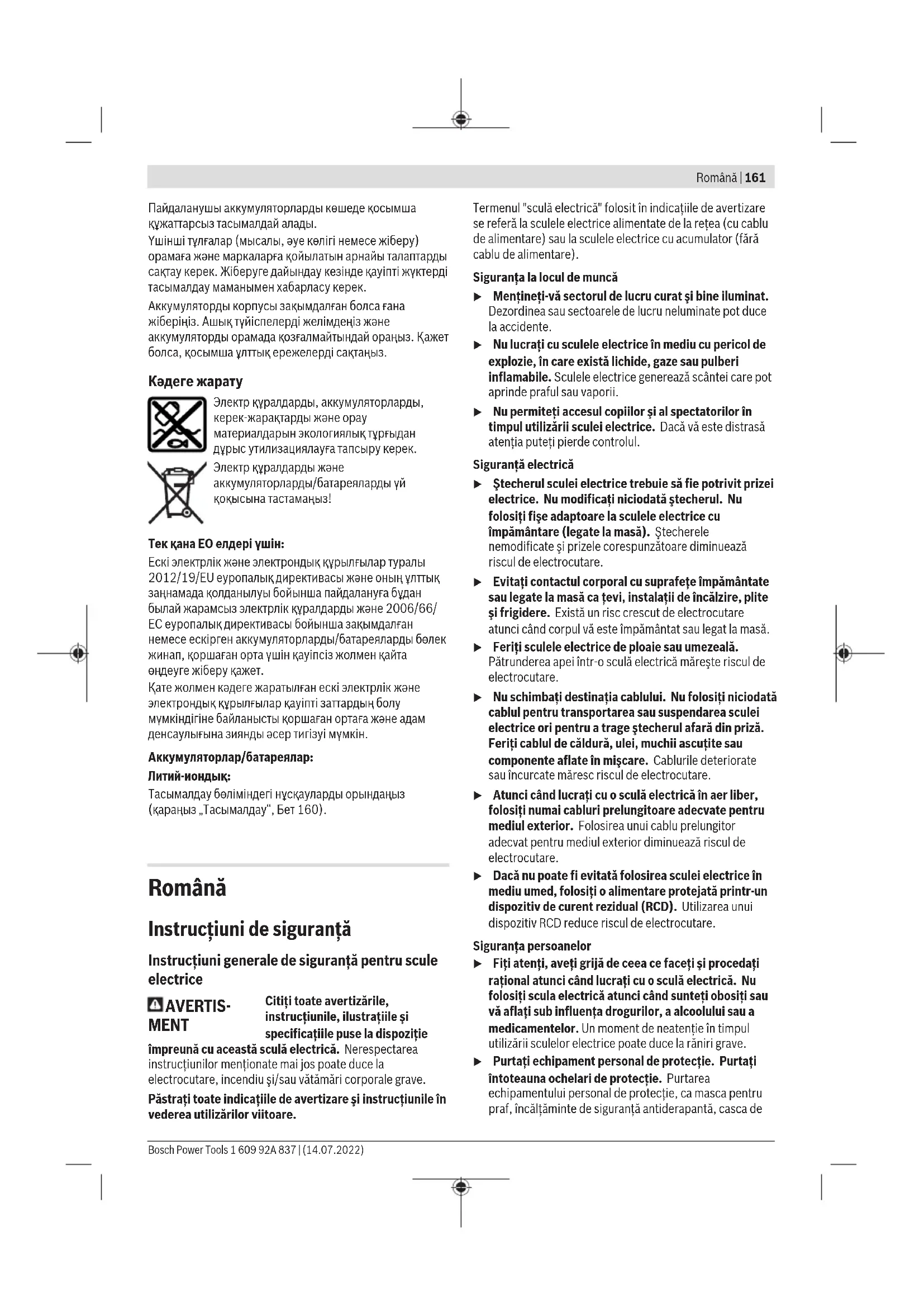 Ұсынылған литий-иондық аккумуляторлар қауіпті тауарларға қойылатын талаптарға бағынады. 1 609 92A 837 | (14.07.2022) Bosch Power ToolsRomână | 161 Пайдаланушы аккумуляторларды көшеде қосымша құжаттарсыз тасымалдай алады. Үшінші тұлғалар (мысалы, әуе көлігі немесе жіберу) орамаға және маркаларға қойылатын арнайы талаптарды сақтау керек. Жіберуге дайындау кезінде қауіпті жүктерді тасымалдау маманымен хабарласу керек. Аккумуляторды корпусы зақымдалған болса ғана жіберіңіз. Ашық түйіспелерді желімдеңіз және аккумуляторды орамада қозғалмайтындай ораңыз. Қажет болса, қосымша ұлттық ережелерді сақтаңыз. Кәдеге жарату Электр құралдарды, аккумуляторларды, керек-жарақтарды және орау материалдарын экологиялық тұрғыдан дұрыс утилизациялауға тапсыру керек. Электр құралдарды және аккумуляторларды/батареяларды үй қоқысына тастамаңыз! Тек қана ЕО елдері үшін: Ескі электрлік және электрондық құрылғылар туралы 2012/19/EU еуропалық директивасы және оның ұлттық заңнамада қолданылуы бойынша пайдалануға бұдан былай жарамсыз электрлік құралдарды және 2006/66/ ЕC еуропалық директивасы бойынша зақымдалған немесе ескірген аккумуляторларды/батареяларды бөлек жинап, қоршаған орта үшін қауіпсіз жолмен қайта өңдеуге жіберу қажет. Қате жолмен кәдеге жаратылған ескі электрлік және электрондық құрылғылар қауіпті заттардың болу мүмкіндігіне байланысты қоршаған ортаға және адам денсаулығына зиянды әсер тигізуі мүмкін. Аккумуляторлар/батареялар: Литий-иондық: Тасымалдау бөліміндегі нұсқауларды орындаңыз (қараңыз „Тасымалдау“, Бет160). Română Instrucţiuni de siguranţă Instrucţiuni generale de siguranţă pentru scule electrice AVERTIS- MENT Citiţi toate avertizările, instrucţiunile, ilustraţiile şi specificaţiile puse la dispoziţie împreună cu această sculă electrică. Nerespectarea instrucţiunilor menţionate mai jos poate duce la electrocutare, incendiu şi/sau vătămări corporale grave. Păstraţi toate indicaţiile de avertizare şi instrucţiunile în vederea utilizărilor viitoare. Termenul "sculă electrică" folosit în indicaţiile de avertizare se referă la sculele electrice alimentate de la reţea (cu cablu de alimentare) sau la sculele electrice cu acumulator (fără cablu de alimentare). Siguranţa la locul de muncă u Menţineţi‑vă sectorul de lucru curat şi bine iluminat. Dezordinea sau sectoarele de lucru neluminate pot duce la accidente. u Nu lucraţi cu sculele electrice în mediu cu pericol de explozie, în care există lichide, gaze sau pulberi inflamabile. Sculele electrice generează scântei care pot aprinde praful sau vaporii. u Nu permiteţi accesul copiilor şi al spectatorilor în timpul utilizării sculei electrice. Dacă vă este distrasă atenţia puteţi pierde controlul. Siguranţă electrică u Ştecherul sculei electrice trebuie să fie potrivit prizei electrice. Nu modificaţi niciodată ştecherul. Nu folosiţi fişe adaptoare la sculele electrice cu împământare (legate la masă). Ştecherele nemodificate şi prizele corespunzătoare diminuează riscul de electrocutare. u Evitaţi contactul corporal cu suprafeţe împământate sau legate la masă ca ţevi, instalaţii de încălzire, plite şi frigidere. Există un risc crescut de electrocutare atunci când corpul vă este împământat sau legat la masă. u Feriţi sculele electrice de ploaie sau umezeală. Pătrunderea apei într‑o sculă electrică măreşte riscul de electrocutare. u Nu schimbaţi destinaţia cablului. Nu folosiţi niciodată cablul pentru transportarea sau suspendarea sculei electrice ori pentru a trage ştecherul afară din priză. Feriţi cablul de căldură, ulei, muchii ascuţite sau componente aflate în mişcare. Cablurile deteriorate sau încurcate măresc riscul de electrocutare. u Atunci când lucraţi cu o sculă electrică în aer liber, folosiţi numai cabluri prelungitoare adecvate pentru mediul exterior. Folosirea unui cablu prelungitor adecvat pentru mediul exterior diminuează riscul de electrocutare. u Dacă nu poate fi evitată folosirea sculei electrice în mediu umed, folosiţi o alimentare protejată printr-un dispozitiv de curent rezidual (RCD). Utilizarea unui dispozitiv RCD reduce riscul de electrocutare. Siguranţa persoanelor u Fiţi atenţi, aveţi grijă de ceea ce faceţi şi procedaţi raţional atunci când lucraţi cu o sculă electrică. Nu folosiţi scula electrică atunci când sunteţi obosiţi sau vă aflaţi sub influenţa drogurilor, a alcoolului sau a medicamentelor. Un moment de neatenţie în timpul utilizării sculelor electrice poate duce la răniri grave. u Purtaţi echipament personal de protecţie. Purtaţi întoteauna ochelari de protecţie. Purtarea echipamentului personal de protecţie, ca masca pentru p