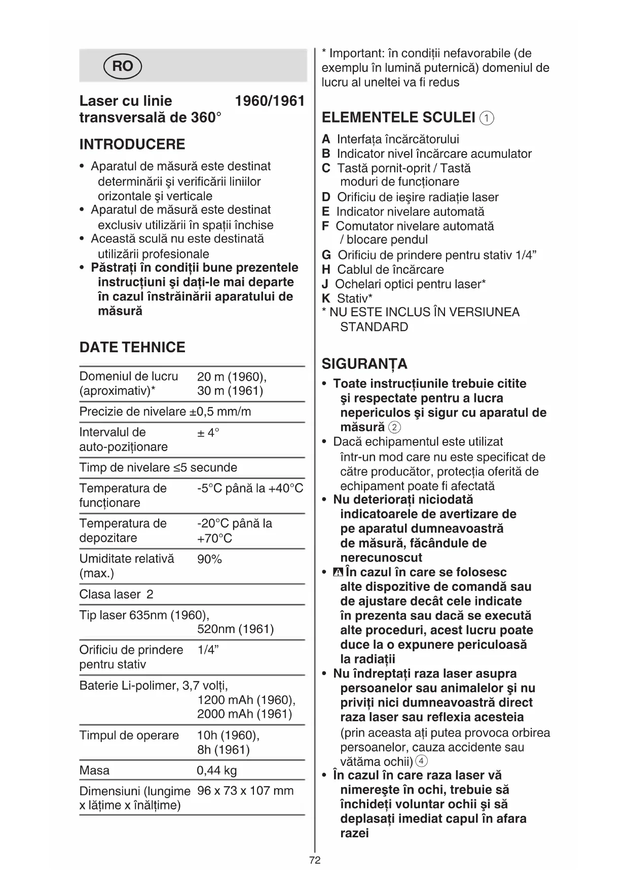 - Păstraţi în condiţii bune prezentele instrucţiuni şi daţi-le mai departe în cazul înstrăinării aparatului de măsură DATE TEHNICE Domeniul de lucru (aproximativ)* 20 m (1960), 30 m (1961) Precizie de nivelare ±0,5 mm/m Intervalul de auto-poziționare ± 4° Timp de nivelare ≤5 secunde Temperatura de funcționare -5°C până la +40°C Temperatura de depozitare -20°C până la +70°C Umiditate relativă (max.) 90% Clasa laser 2 Tip laser 635nm (1960), 520nm (1961) Oriciu de prindere pentru stativ 1/4” Baterie Li-polimer, 3,7 volți, 1200 mAh (1960), 2000 mAh (1961) Timpul de operare 10h (1960), 8h (1961) Masa 0,44 kg Dimensiuni (lungime x lățime x înălțime) 96 x 73 x 107 mm73 - Indicatorul B clipește GALBEN indicând faptul că bateria se încarcă și capacitatea curentă a bateriei permite ca unealta să funcționeze timp de 30 de minute - Indicatorul B clipește VERDE indicând faptul că bateria este încărcată mai mult de 90% din capacitatea maximă - indicatorul B se va face VERDE continuu, atunci când bateria va complet încărcată