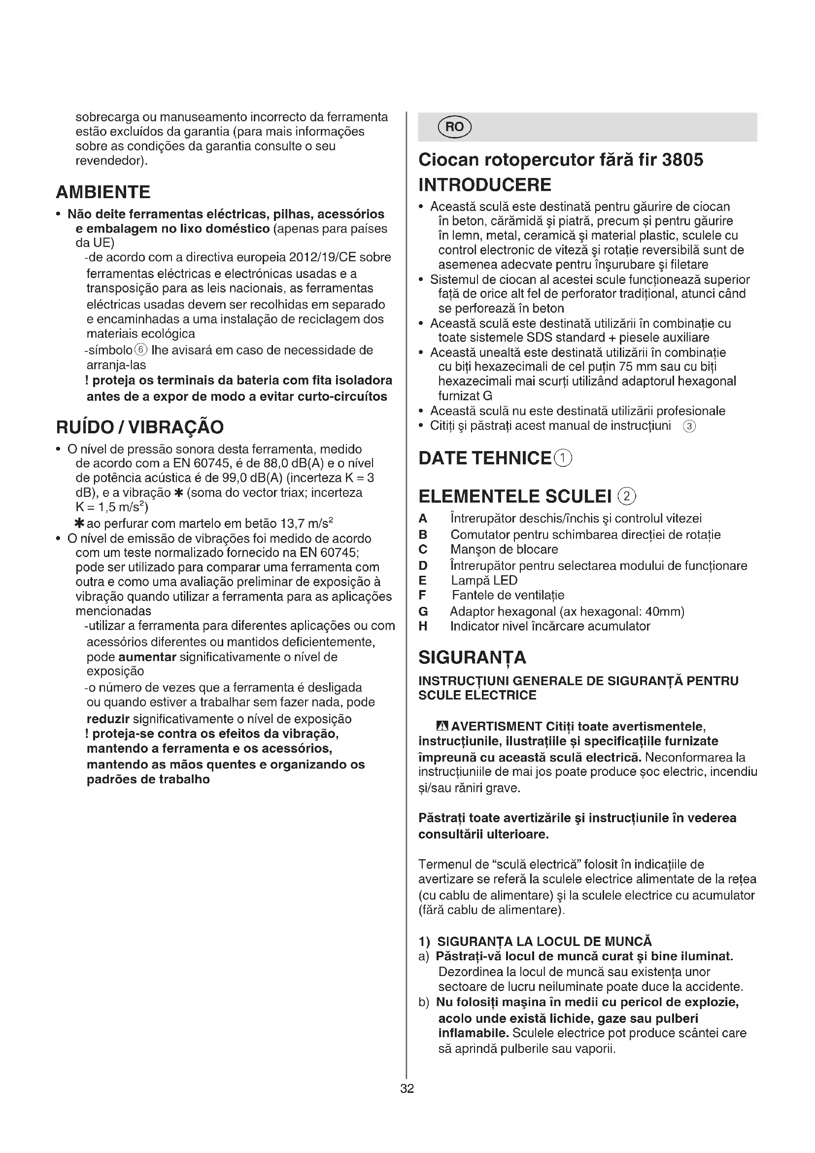 a) Păstraţi-vă locul de muncă curat şi bine iluminat. Dezordinea la locul de muncă sau existenţa unor sectoare de lucru neiluminate poate duce la accidente. b) Nu folosiţi maşina în medii cu pericol de explozie, acolo unde există lichide, gaze sau pulberi inamabile. Sculele electrice pot produce scântei care să aprindă pulberile sau vaporii. sobrecarga ou manuseamento incorrecto da ferramenta estão excluídos da garantia (para mais informações sobre as condições da garantia consulte o seu revendedor). AMBIENTE