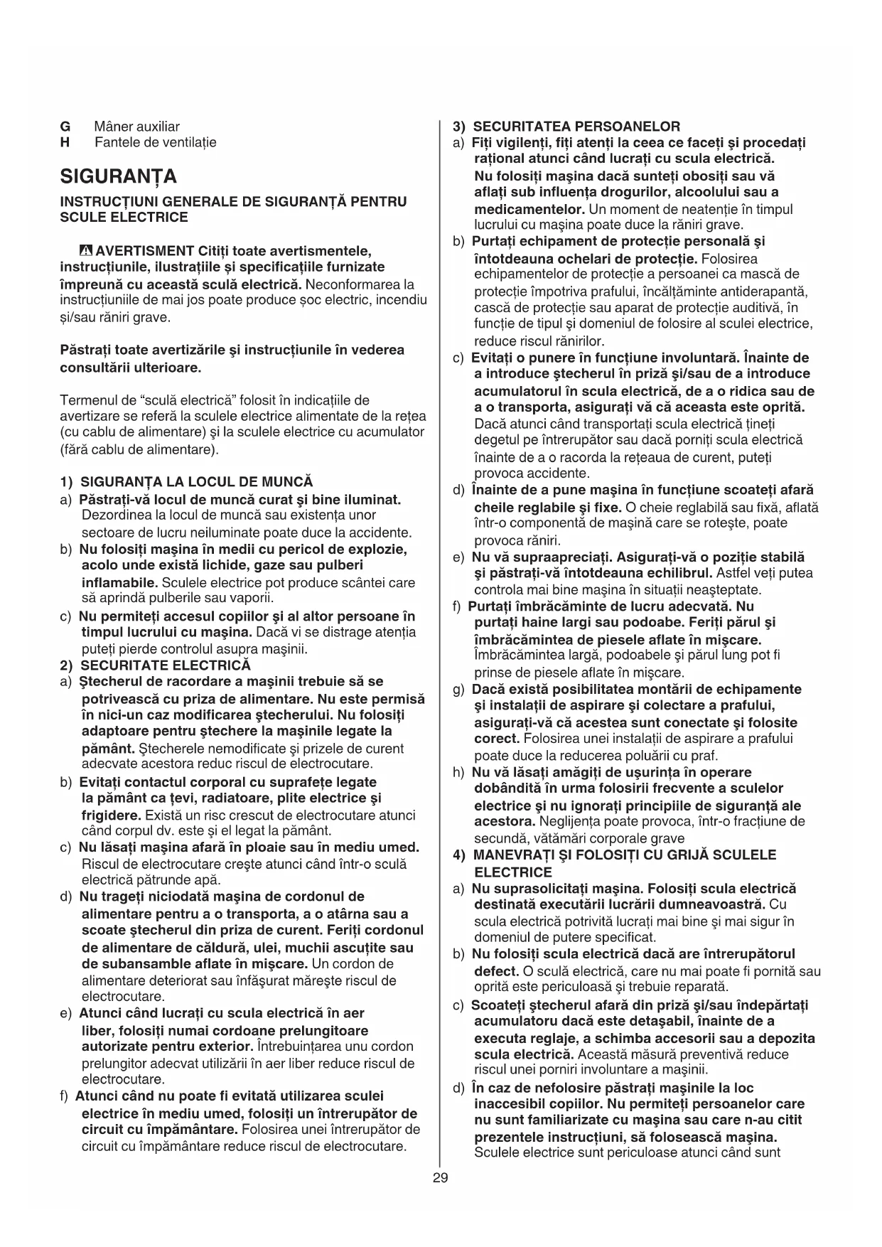 ELECTRICE a) Nu suprasolicitaţi maşina. Folosiţi scula electrică destinată executării lucrării dumneavoastră. Cu scula electrică potrivită lucraţi mai bine şi mai sigur în domeniul de putere specicat. b) Nu folosiţi scula electrică dacă are întrerupătorul defect. O sculă electrică, care nu mai poate pornită sau oprită este periculoasă şi trebuie reparată. c) Scoateţi ştecherul afară din priză şi/sau îndepărtaţi acumulatoru dacă este detaşabil, înainte de a executa reglaje, a schimba accesorii sau a depozita scula electrică. Această măsură preventivă reduce riscul unei porniri involuntare a maşinii. d) În caz de nefolosire păstraţi maşinile la loc inaccesibil copiilor. Nu permiteţi persoanelor care nu sunt familiarizate cu maşina sau care n-au citit prezentele instrucţiuni, să folosească maşina. Sculele electrice sunt periculoase atunci când sunt G Mâner auxiliar H Fantele de ventilaţie SIGURANŢA