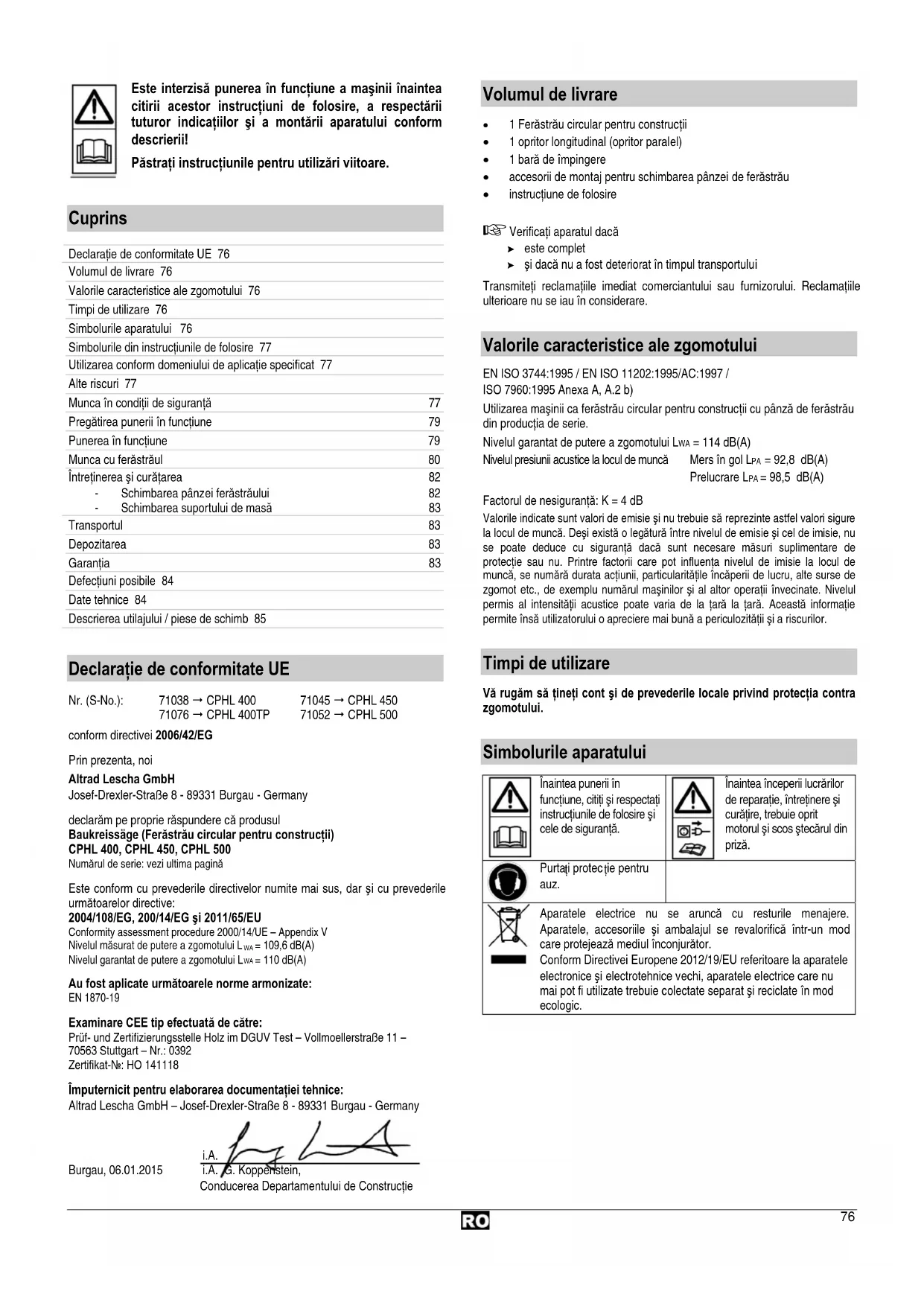 Numărul de serie: vezi ultima pagină Este conform cu prevederile directivelor numite mai sus, dar şi cu prevederile următoarelor directive: 2004/108/EG, 200/14/EG şi 2011/65/EU Conformity assessment procedure 2000/14/UE – Appendix V Nivelul măsurat de putere a zgomotului L = 109,6 dB(A) Nivelul garantat de putere a zgomotului L = 110 dB(A) Au fost aplicate următoarele norme armonizate: EN 1870-19 Examinare CEE tip efectuată de către: Prüf- und Zertifizierungsstelle Holz im DGUV Test – Vollmoellerstraße 11 – 70563 Stuttgart – Nr.: 0392 Zertifikat-Nr.: HO 141118 Împuternicit pentru elaborarea documentaţiei tehnice: Altrad Lescha GmbH – Josef-Drexler-Straße 8 - 89331 Burgau - Germany