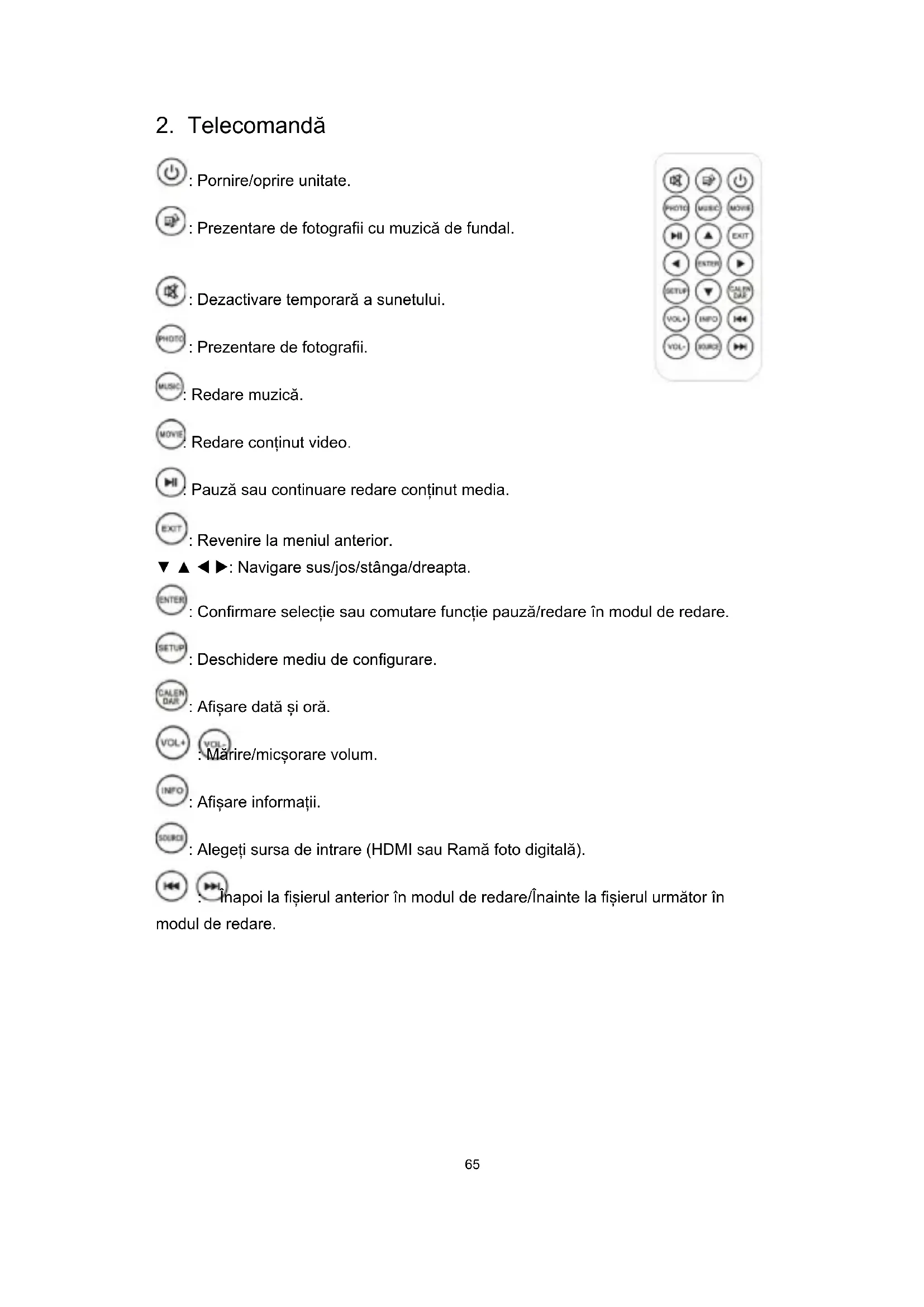 : Pornire/oprire unitate. : Prezentare de fotografii cu muzică de fundal. : Dezactivare temporară a sunetului. : Prezentare de fotografii. : Redare muzică. : Redare conținut video. : Pauză sau continuare redare conținut media. : Revenire la meniul anterior. ▼ ▲ : Navigare sus/jos/stânga/dreapta. : Confirmare selecție sau comutare funcție pauză/redare în modul de redare. : Deschidere mediu de configurare. : Afișare dată și oră. : Mărire/micșorare volum. : Afișare informații. : Alegeți sursa de intrare (HDMI sau Ramă foto digitală). : Înapoi la fișierul anterior în modul de redare/Înainte la fișierul următor în modul de redare.66