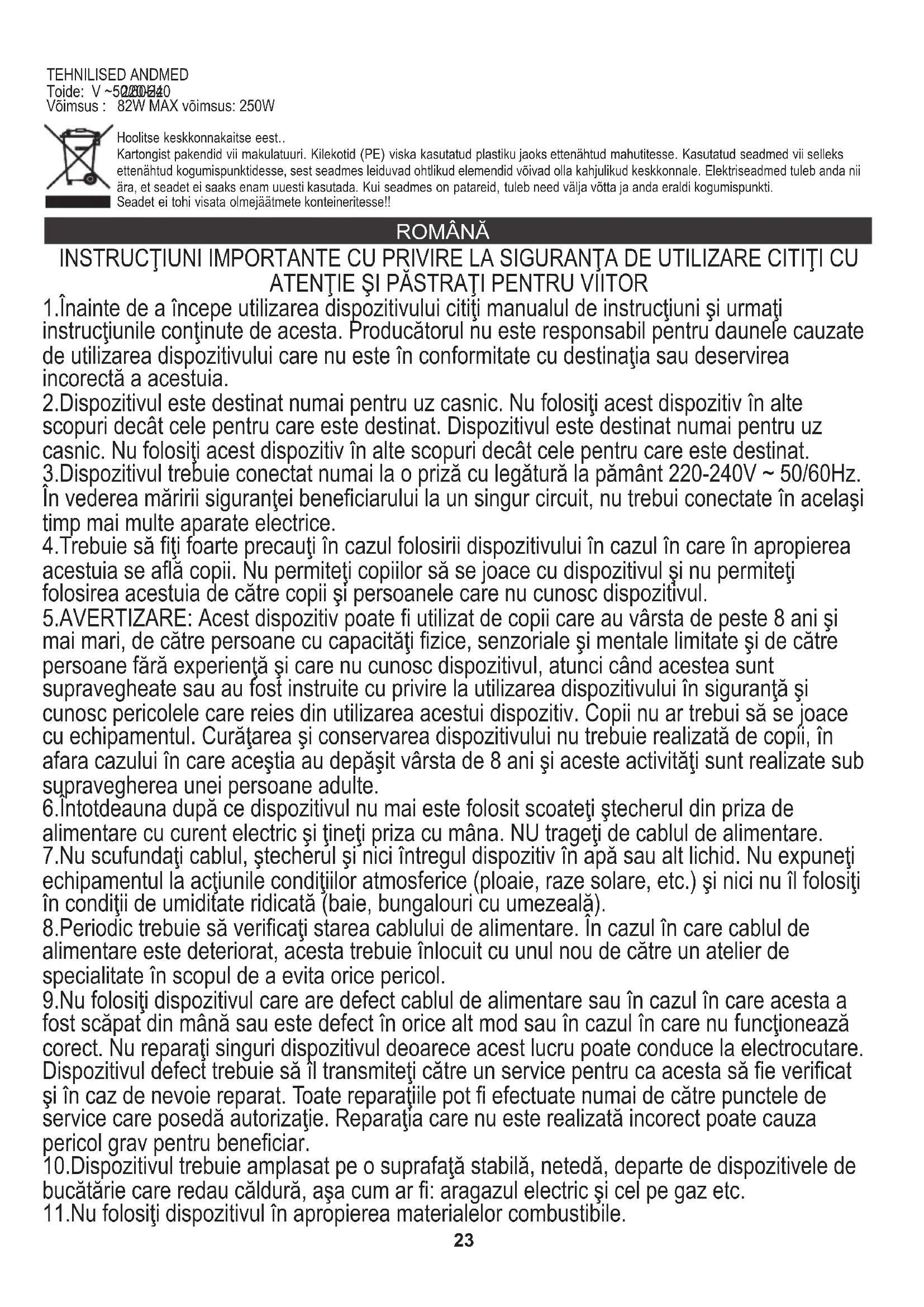 ROMÂNĂ INSTRUCŢIUNI IMPORTANTE CU PRIVIRE LA SIGURANŢA DE UTILIZARE CITIŢI CU ATENŢIE ŞI PĂSTRAŢI PENTRU VIITOR 1.Înainte de a începe utilizarea dispozitivului citiţi manualul de instrucţiuni şi urmaţi instrucţiunile conţinute de acesta. Producătorul nu este responsabil pentru daunele cauzate de utilizarea dispozitivului care nu este în conformitate cu destinaţia sau deservirea incorectă a acestuia. 2.Dispozitivul este destinat numai pentru uz casnic. Nu folosiţi acest dispozitiv în alte scopuri decât cele pentru care este destinat. Dispozitivul este destinat numai pentru uz casnic. Nu folosiţi acest dispozitiv în alte scopuri decât cele pentru care este destinat. 3.Dispozitivul trebuie conectat numai la o priză cu legătură la pământ 220-240V ~ 50/60Hz. În vederea măririi siguranţei beneficiarului la un singur circuit, nu trebui conectate în acelaşi timp mai multe aparate electrice. 4.Trebuie să fiţi foarte precauţi în cazul folosirii dispozitivului în cazul în care în apropierea acestuia se află copii. Nu permiteţi copiilor să se joace cu dispozitivul şi nu permiteţi folosirea acestuia de către copii şi persoanele care nu cunosc dispozitivul. 5.AVERTIZARE: Acest dispozitiv poate fi utilizat de copii care au vârsta de peste 8 ani şi mai mari, de către persoane cu capacităţi fizice, senzoriale şi mentale limitate şi de către persoane fără experienţă şi care nu cunosc dispozitivul, atunci când acestea sunt supravegheate sau au fost instruite cu privire la utilizarea dispozitivului în siguranţă şi cunosc pericolele care reies din utilizarea acestui dispozitiv. Copii nu ar trebui să se joace cu echipamentul. Curăţarea şi conservarea dispozitivului nu trebuie realizată de copii, în afara cazului în care aceştia au depăşit vârsta de 8 ani şi aceste activităţi sunt realizate sub supravegherea unei persoane adulte. 6.Întotdeauna după ce dispozitivul nu mai este folosit scoateţi ştecherul din priza de alimentare cu curent electric şi ţineţi priza cu mâna. NU trageţi de cablul de alimentare. 7.Nu scufundaţi cablul, ştecherul şi nici întregul dispozitiv în apă sau alt lichid. Nu expuneţi echipamentul la acţiunile condiţiilor atmosferice (ploaie, raze solare, etc.) şi nici nu îl folosiţi în condiţii de umiditate ridicată (baie, bungalouri cu umezeală). 8.Periodic trebuie să verificaţi starea cablului de alimentare. În cazul în care cablul de alimentare este deteriorat, acesta trebuie înlocuit cu unul nou de către un atelier de specialitate în scopul de a evita orice pericol. 9.Nu folosiţi dispozitivul care are defect cablul de alimentare sau în cazul în care acesta a fost scăpat din mână sau este defect în orice alt mod sau în cazul în care nu funcţionează corect. Nu reparaţi singuri dispozitivul deoarece acest lucru poate conduce la electrocutare. Dispozitivul defect trebuie să îl transmiteţi către un service pentru ca acesta să fie verificat şi în caz de nevoie reparat. Toate reparaţiile pot fi efectuate numai de către punctele de service care posedă autorizaţie. Reparaţia care nu este realizată incorect poate cauza pericol grav pentru beneficiar. 10.Dispozitivul trebuie amplasat pe o suprafaţă stabilă, netedă, departe de dispozitivele de bucătărie care redau căldură, aşa cum ar fi: aragazul electric şi cel pe gaz etc. 11.Nu folosiţi dispozitivul în apropierea materialelor combustibile.24 12.Cablul de alimentare nu poate să atârne peste marginea mesei sau să atingă suprafeţele fierbinţi. 13.Nu se permite lăsarea dispozitivului pornit şi nici a alimentatorului în priză fără supraveghere. 14.Pentru a asigura o protecţie suplimentară, se recomandă instalarea pe circuitul electric a unui dispozitiv cu curent diferenţial (RCD) cu curent alternativ diferenţial care nu va depăşi 30 mA. În acest sens trebuie să vă adresaţi unui electrician specialist.