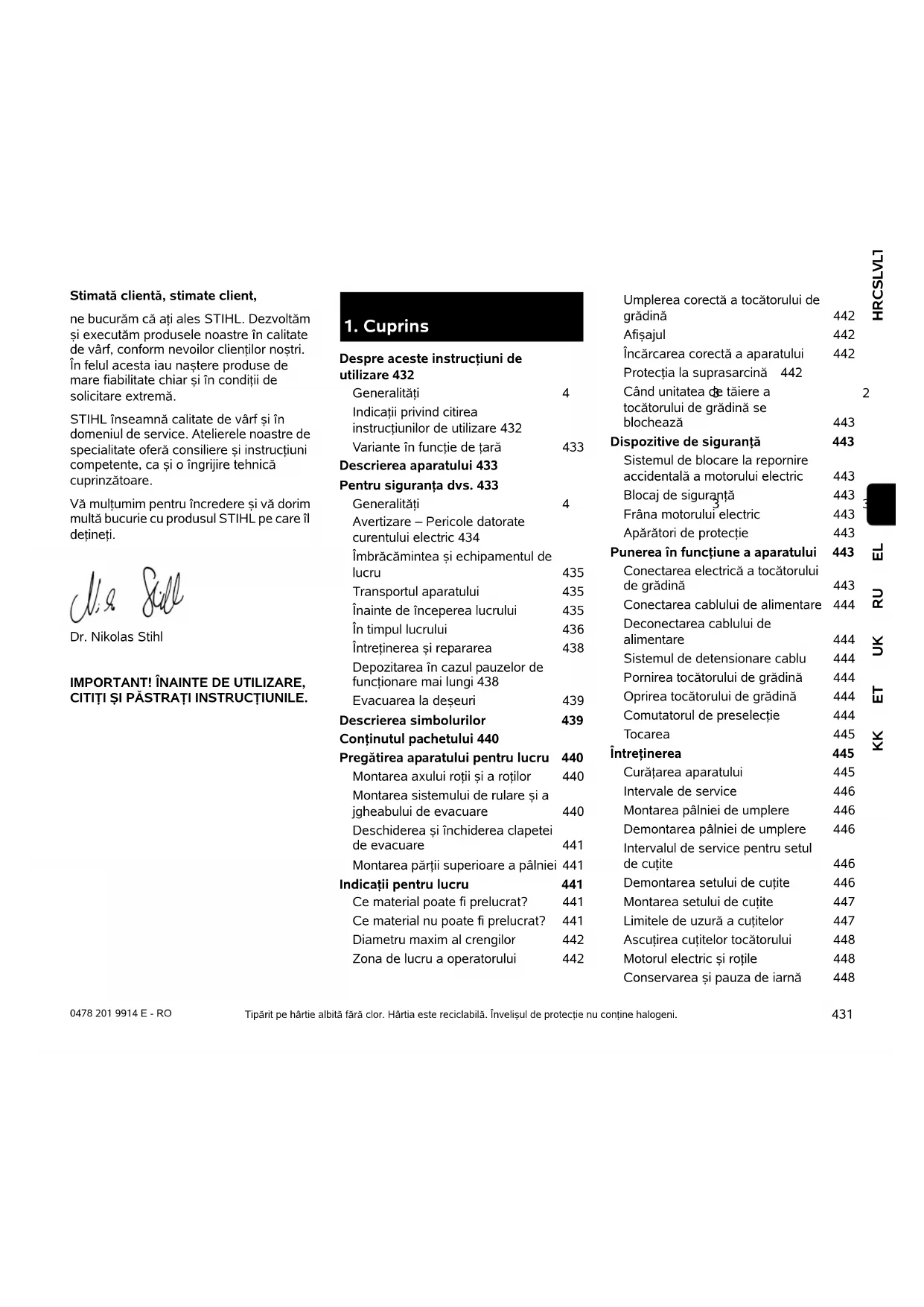 HRCSLVLTRO 0478 201 9914 E - RO ELRUUKETKK Stimată clientă, stimate client, ne bucurăm că aţi ales STIHL. Dezvoltăm şi executăm produsele noastre în calitate de vârf, conform nevoilor clienţilor noştri. În felul acesta iau naştere produse de mare fiabilitate chiar şi în condiţii de solicitare extremă. STIHL înseamnă calitate de vârf şi în domeniul de service. Atelierele noastre de specialitate oferă consiliere şi instrucţiuni competente, ca şi o îngrijire tehnică cuprinzătoare. Vă mulţumim pentru încredere şi vă dorim multă bucurie cu produsul STIHL pe care îl deţineţi. Dr. Nikolas Stihl IMPORTANT! ÎNAINTE DE UTILIZARE, CITIŢI ŞI PĂSTRAŢI INSTRUCŢIUNILE. Tipărit pe hârtie albită fără clor. Hârtia este reciclabilă. Învelişul de protecţie nu conţine halogeni.