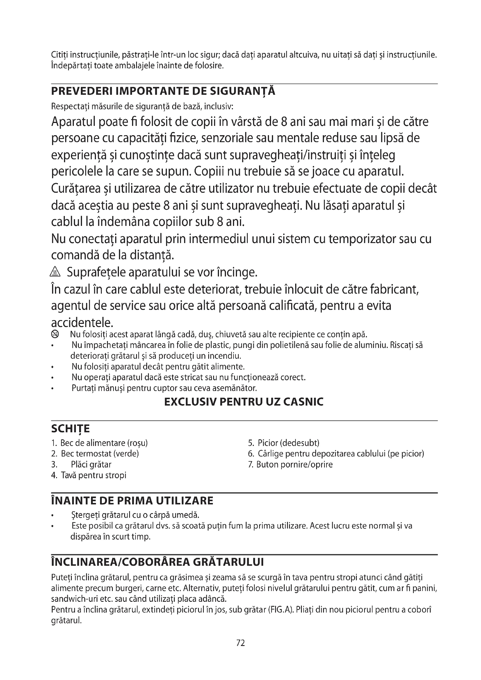 Respectaţi măsurile de siguranţă de bază, inclusiv: Aparatul poate folosit de copii în vârstă de 8 ani sau mai mari și de către persoane cu capacități zice, senzoriale sau mentale reduse sau lipsă de experiență și cunoștințe dacă sunt supravegheați/instruiți și înțeleg pericolele la care se supun. Copiii nu trebuie să se joace cu aparatul. Curățarea și utilizarea de către utilizator nu trebuie efectuate de copii decât dacă aceștia au peste 8 ani și sunt supravegheați. Nu lăsați aparatul și cablul la îndemâna copiilor sub 8 ani. Nu conectaţi aparatul prin intermediul unui sistem cu temporizator sau cu comandă de la distanţă. ¬ Suprafețele aparatului se vor încinge. În cazul în care cablul este deteriorat, trebuie înlocuit de către fabricant, agentul de service sau orice altă persoană calicată, pentru a evita accidentele. b Nu folosiţi acest aparat lângă cadă, duş, chiuvetă sau alte recipiente ce conţin apă.
