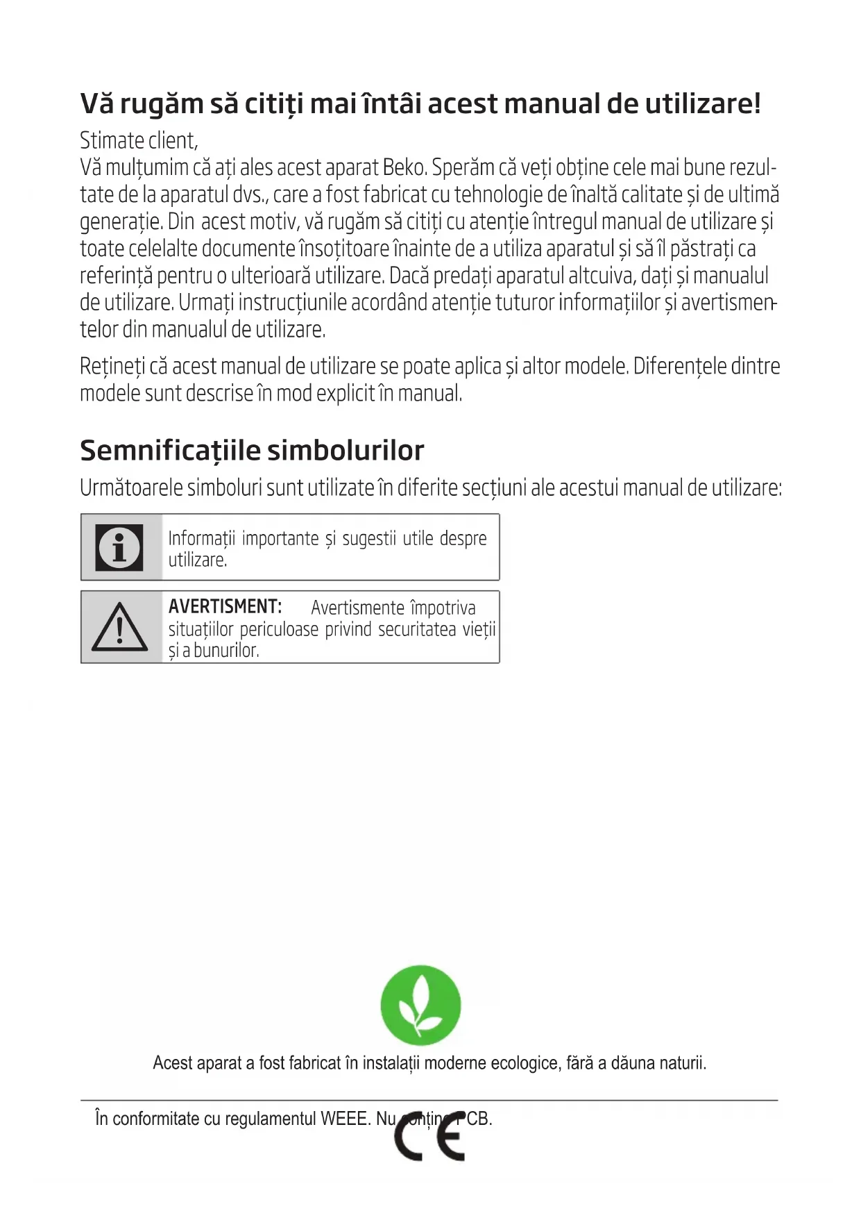 pozitivelor electrice și electronice. Pentru a găsi aceste sisteme de co- lectare, vă rugăm să contactați au- toritățile locale sau comerciantul cu amănuntul unde a fost pus în vân- zare produsul. Fiecare gospodărie joacă un rol important în recuperarea și reciclarea apara- telor vechi. Eliminarea adecvată a aparatului utilizat ajută la preve- nirea potențialelor consecințe ne- gative pentru mediu și sănătatea umană.