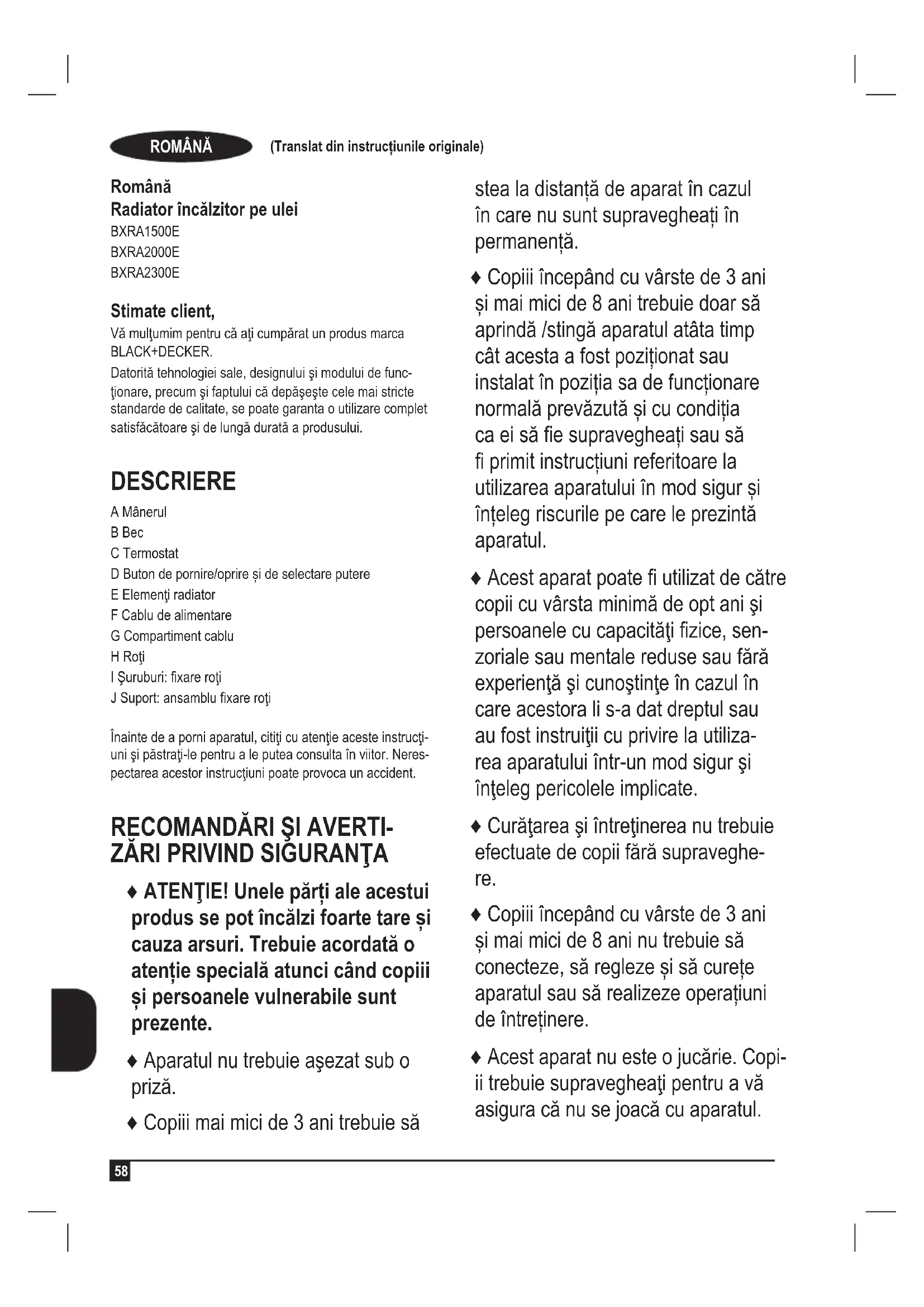 Română Radiator încălzitor pe ulei BXRA1500E BXRA2000E BXRA2300E Stimate client, Vă mulţumim pentru că aţi cumpărat un produs marca BLACK+DECKER. Datorită tehnologiei sale, designului şi modului de func- ţionare, precum şi faptului că depăşeşte cele mai stricte standarde de calitate, se poate garanta o utilizare complet satisfăcătoare şi de lungă durată a produsului. DESCRIERE A Mânerul B Bec C Termostat D Buton de pornire/oprire și de selectare putere E Elemenţi radiator F Cablu de alimentare G Compartiment cablu H Roţi I Şuruburi: xare roţi J Suport: ansamblu xare roţi Înainte de a porni aparatul, citiţi cu atenţie aceste instrucţi- uni şi păstraţi-le pentru a le putea consulta în viitor. Neres- pectarea acestor instrucţiuni poate provoca un accident.