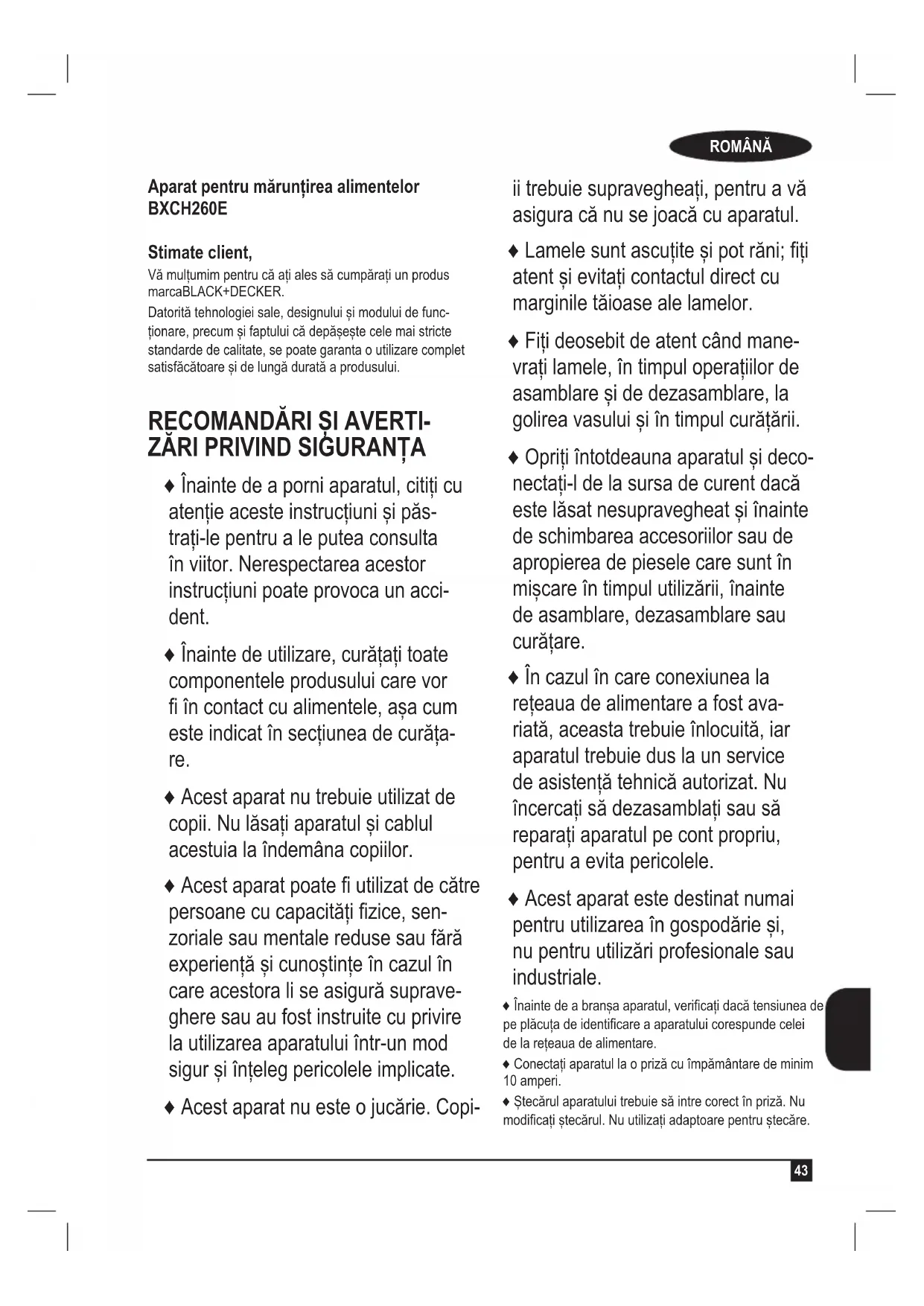 Aparat pentru mărunțirea alimentelor BXCH260E Stimate client, Vă mulțumim pentru că ați ales să cumpărați un produs marcaBLACK+DECKER. Datorită tehnologiei sale, designului și modului de func- ționare, precum și faptului că depășește cele mai stricte standarde de calitate, se poate garanta o utilizare complet satisfăcătoare și de lungă durată a produsului.