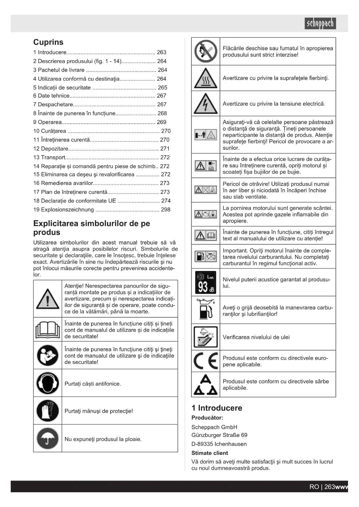 - 19 Explosionszeichnung Explicitarea simbolurilor de pe produs Utilizarea simbolurilor din acest manual trebuie să vă atragă atenţia asupra posibilelor riscuri. Simbolurile de securitate şi declaraţiile, care le însoţesc, trebuie înţelese exact. Avertizările în sine nu îndepărtează riscurile şi nu pot înlocui măsurile corecte pentru prevenirea accidente- lor. Atenţie! Nerespectarea panourilor de sigu- ranță montate pe produs și a indicațiilor de avertizare, precum și nerespectarea indicați- ilor de siguranță și de operare, poate condu- ce de la vătămări, până la moarte. Înainte de punerea în funcțiune citiți și țineți cont de manualul de utilizare și de indicațiile de securitate! Înainte de punerea în funcţiune citiţi şi ţineţi cont de manualul de utilizare şi de indicaţiile de securitate! Purtați căști antifonice. Purtaţi mănuşi de protecţie! Nu expuneţi produsul la ploaie. Flăcările deschise sau fumatul în apropierea produsului sunt strict interzise! Avertizare cu privire la suprafeţele fierbinţi. Avertizare cu privire la tensiune electrică. Asiguraţi-vă că celelalte persoane păstrează o distanţă de siguranţă. Țineți persoanele neparticipante la distanță de produs. Atenţie suprafeţe fierbinţi! Pericol de provocare a ar- surilor. Înainte de a efectua orice lucrare de curăța- re sau întreținere curentă, opriți motorul și scoateți fișa bujiilor de pe bujie. Pericol de otrăvire! Utilizați produsul numai în aer liber și niciodată în încăperi închise sau slab ventilate. La pornirea motorului sunt generate scântei. Acestea pot aprinde gazele inflamabile din apropiere. Înainte de punerea în funcțiune, citiți întregul text al manualului de utilizare cu atenție! Important. Opriţi motorul înainte de comple- tarea nivelului carburantului. Nu completaţi carburantul în regimul funcţional activ. Nivelul puterii acustice garantat al produsu- lui. Aveţi o grijă deosebită la manevrarea carbu- ranţilor şi lubrifianţilor! Verificarea nivelului de ulei Produsul este conform cu directivele euro- pene aplicabile. Produsul este conform cu directivele sârbe aplicabile. 1 Introducere Producător: Scheppach GmbH Günzburger Straße 69 D-89335 Ichenhausen Stimate client Vă dorim să aveţi multe satisfacţii şi mult succes în lucrul cu noul dumneavoastră produs. RO | 263www.scheppach.comIndicație: Conform legii privind garantarea produselor, producătorul acestui produs nu răspunde pentru deteriorările apărute la acest produs sau din cauza acestui produs în caz de: p. 298