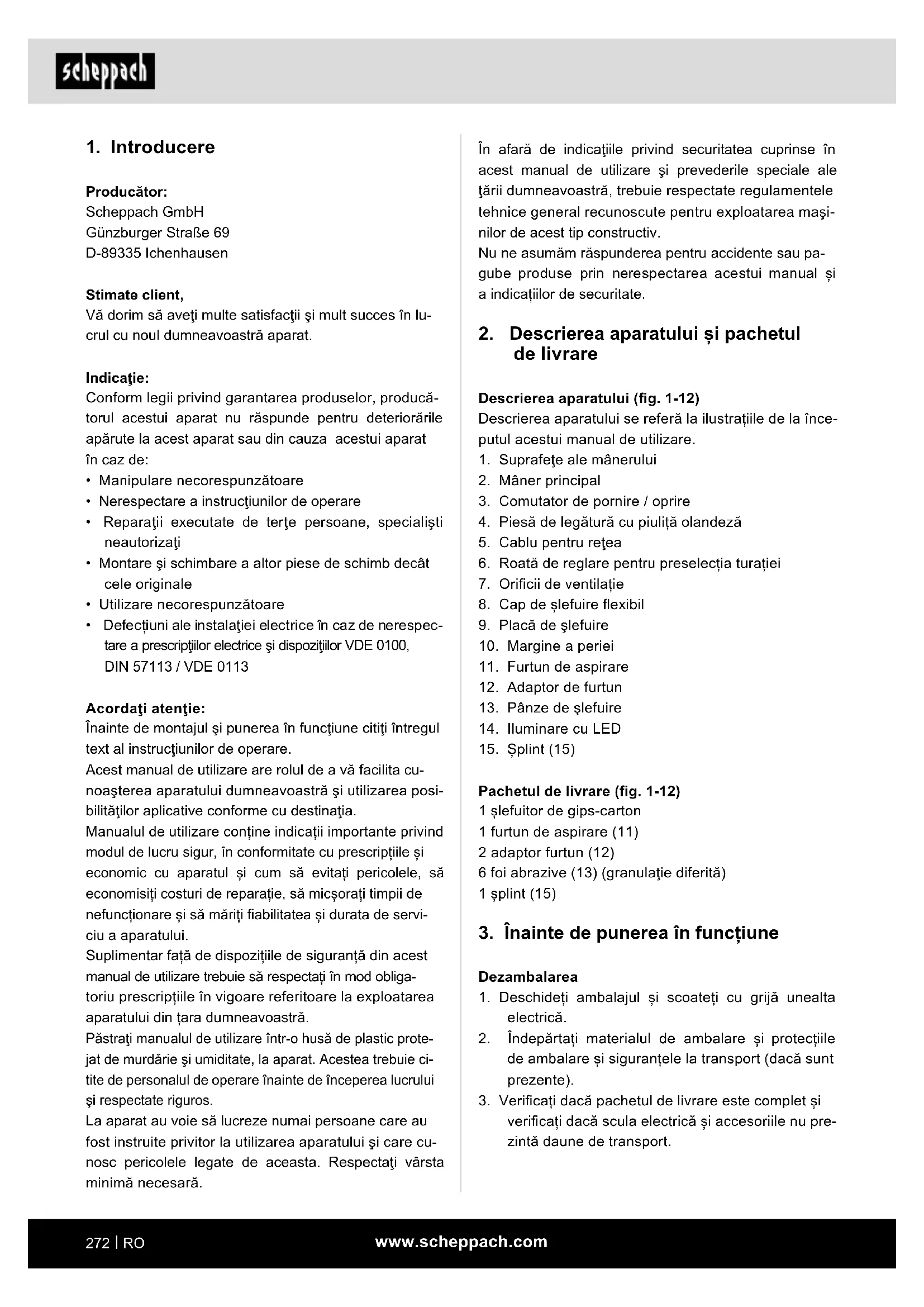 Producător: Scheppach GmbH Günzburger Straße 69 D-89335 Ichenhausen Stimate client, Vă dorim să aveţi multe satisfacţii şi mult succes în lu- crul cu noul dumneavoastră aparat. Indicaţie: Conform legii privind garantarea produselor, producă- torul acestui aparat nu răspunde pentru deteriorările apărute la acest aparat sau din cauza acestui aparat în caz de: