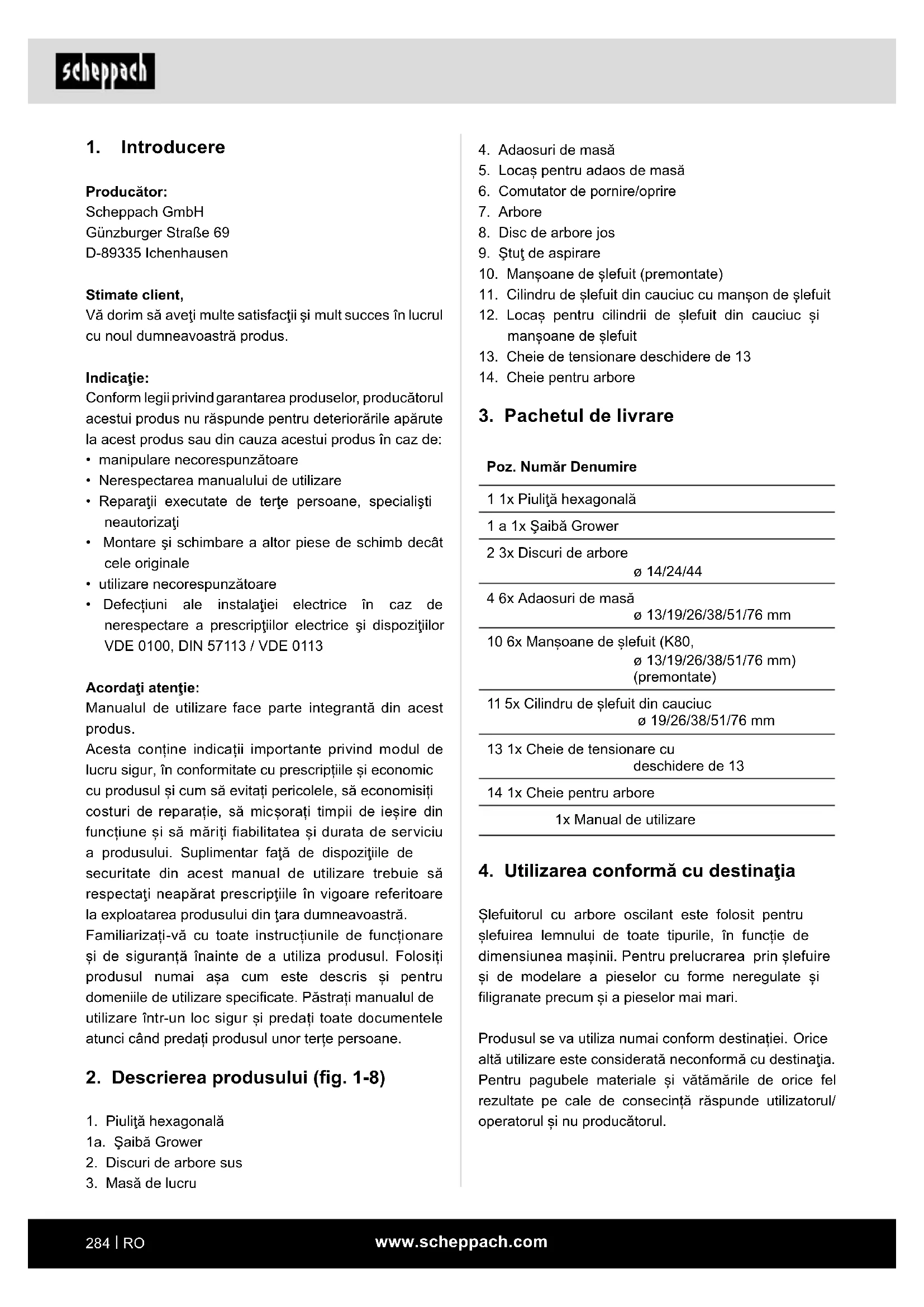 Producător: Scheppach GmbH Günzburger Straße 69 D-89335 Ichenhausen Stimate client, Vă dorim să aveţi multe satisfacţii şi mult succes în lucrul cu noul dumneavoastră produs. Indicaţie: Conform legii privind garantarea produselor, producătorul acestui produs nu răspunde pentru deteriorările apărute la acest produs sau din cauza acestui produs în caz de: