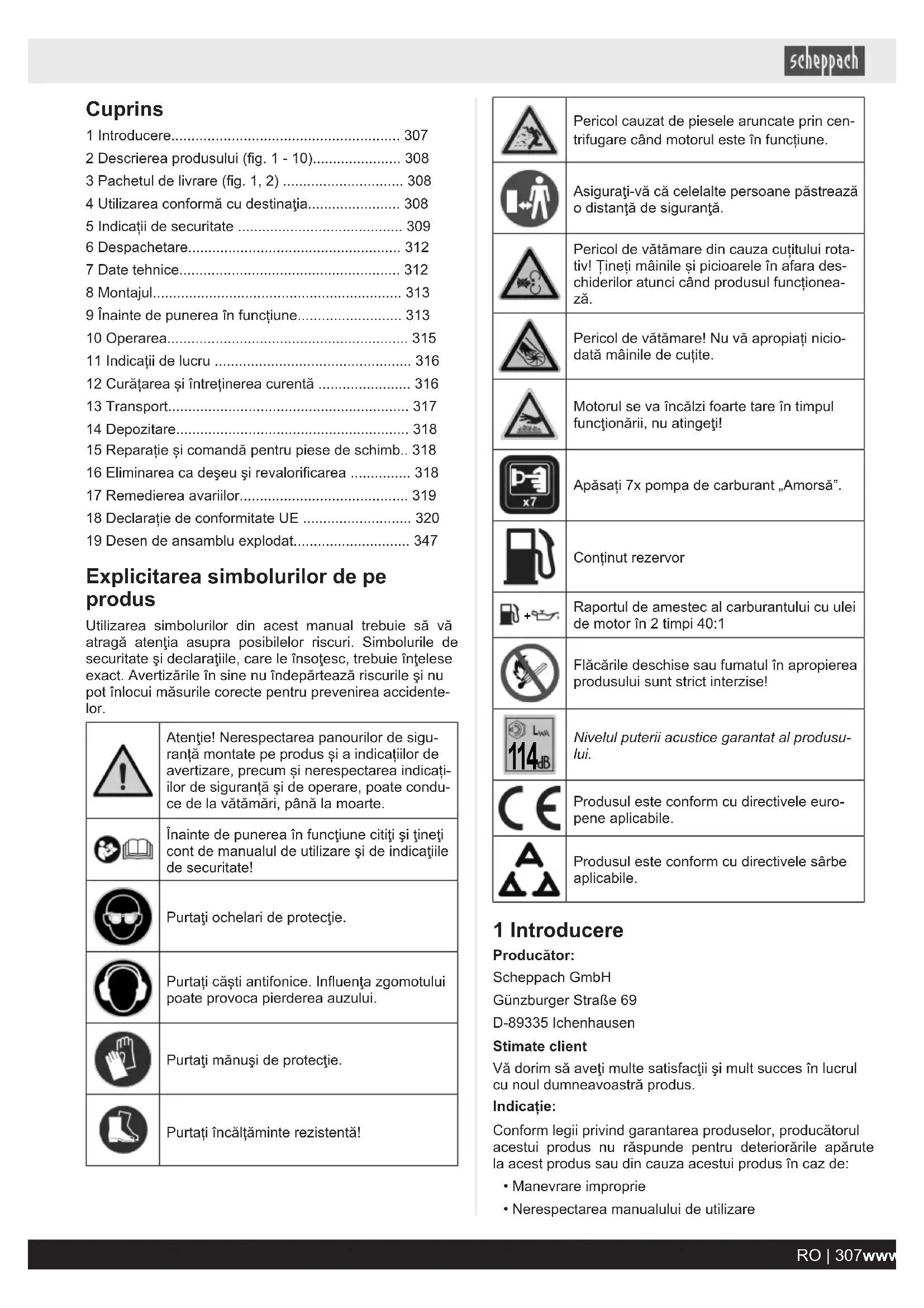 - Este destinată colectării frunzelor sau a deșeurilor ge- nerale de grădină, cum ar fi resturile de la tuns sau pentru a le îndepărta din locuri greu accesibile. Produsul se va utiliza numai conform destinației. Orice al- tă utilizare în afară de aceasta nu este conformă cu utili- zarea prevăzută. Pentru pagubele materiale și vătămările de orice fel rezultate pe cale de consecință răspunde utili- zatorul și nu producătorul. Din utilizarea conformă cu destinaţia face parte şi respec- tarea indicaţiilor de securitate, precum şi a manualului de montaj şi a indicaţiilor de operare din manualul de utiliza- re. Persoanele care operează și întrețin produsul trebuie să fie familiarizate cu acesta și informate cu privire la posibi- lele pericole. Modificările aduse produsului exclud complet orice res- ponsabilitate din partea producătorului și orice daune re- zultate. Produsul poate fi utilizat numai cu piese și accesorii origi- nale ale producătorului. Prescripțiile de securitate, de lucru și de întreținere curen- tă emise de producător, precum și dimensiunile indicate în Date tehnice trebuie să fie respectate. Vă rugăm să aveţi în vedere că produsele noastre nu au fost construite având ca destinaţie exploatarea profesio- nală sau industrială. Nu preluăm garanţia dacă produsul este utilizat în regim profesional sau industrial, precum şi la activităţi la fel de solicitante. Explicitarea cuvintelor de semnalizare din manualul de utilizare PERICOL Cuvânt de semnalizare pentru a indica o situ- ație periculoasă iminentă care, dacă nu este evitată, va avea ca rezultat decesul sau vătă- marea gravă. 308 | RO www.scheppach.comAVERTIZARE Cuvânt de semnalizare pentru a indica o situ- ație potențial periculoasă care, dacă nu este evitată, ar putea avea ca rezultat decesul sau vătămarea gravă. PRECAUŢIE Cuvânt de semnalizare pentru a indica o situ- ație potențial periculoasă care, dacă nu este evitată, ar putea avea ca rezultat vătămări mi- nore sau moderate. ATENŢIE Cuvânt de semnalizare pentru a indica o situ- ație potențial periculoasă care, dacă nu este evitată, ar putea avea drept rezultat daune materiale la produs sau la proprietate/pose- sie. 5 Indicații de securitate Indicaţii generale de securitate AVERTIZARE Pentru siguranța dumneavoastră, vă rugăm să citiți cu atenție acest manual și indicațiile generale de securitate înainte de a pune în funcțiune produsul. Dacă cesionați produsul unor terți, atașați întotdeauna acest manual de utilizare. AVERTIZARE Utilizați numai carburanți recomandați în acest manual. AVERTIZARE Nu utilizați niciodată carburant care nu este amestecat cu ulei în 2 timpi. Acest lucru poate provoca deteriorări permanente ale motorului și exclude garanția legală a producătorului pentru acest produs. Nu utilizați nicioda- tă un amestec de carburant, care este depozitat pe o perioadă de 90 zile. Păstrați toate indicațiile de securitate și instrucțiunile pentru utilizarea viitoare!