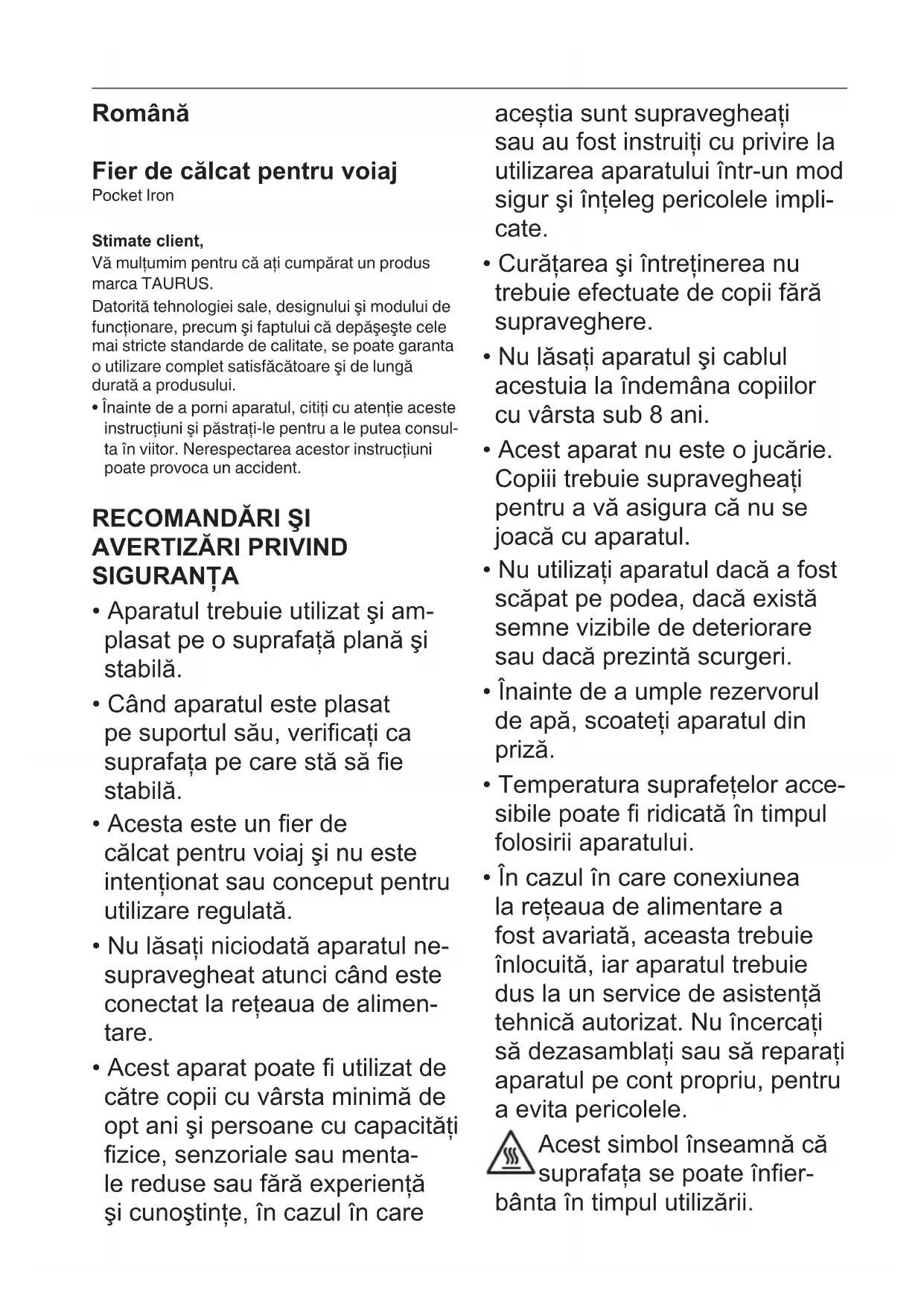 - Produsul nu conţine substanţe în concentraţii care ar putea considerate ca dăunătoare pentru mediu. Acest simbol înseamnă că, în cazul în care doriţi să eliminaţi produsul la încheierea duratei de funcţionare a acestuia, trebuie să îl duceţi la un centru autorizat de colectare a deşeurilor, în vederea colectării selective a deşeurilor de echipamente electrice şi electronice (WEEE). Acest aparat respectă Directiva 2014/35/UE cu privire la echipamentele electrice destinate utilizării în cadrul unor anumite limite de tensiune, Directiva 2014/30/UE cu privire la compatibilitatea electromagnetică, Directiva 2011/65/UE privind restricţiile de utilizare a anumitor substanţe peri- culoase în echipamentele electrice şi electronice, precum şi Directiva 2009/125/CE de instituire a unui cadru pentru stabilirea cerinţelor în materie de proiectare ecologică aplicabile produselor cu impact energetic.Български Туристическа ютия Pocket Iron Уважаеми клиенти: Благодарим Ви, че закупихте електроуред с марката TAURUS. Технологията, дизайнът и функционалността на същия, както и фактът, че надвишава най-стриктните норми за качество, ще Ви донесат пълно и дълготрайно задоволство от него. Прочетете внимателно тази брошура, преди да пуснете уреда в действие. Запазете я за по-нататъшни справки. Несъобразяването с настоящите указания може да предизвика произшествие.