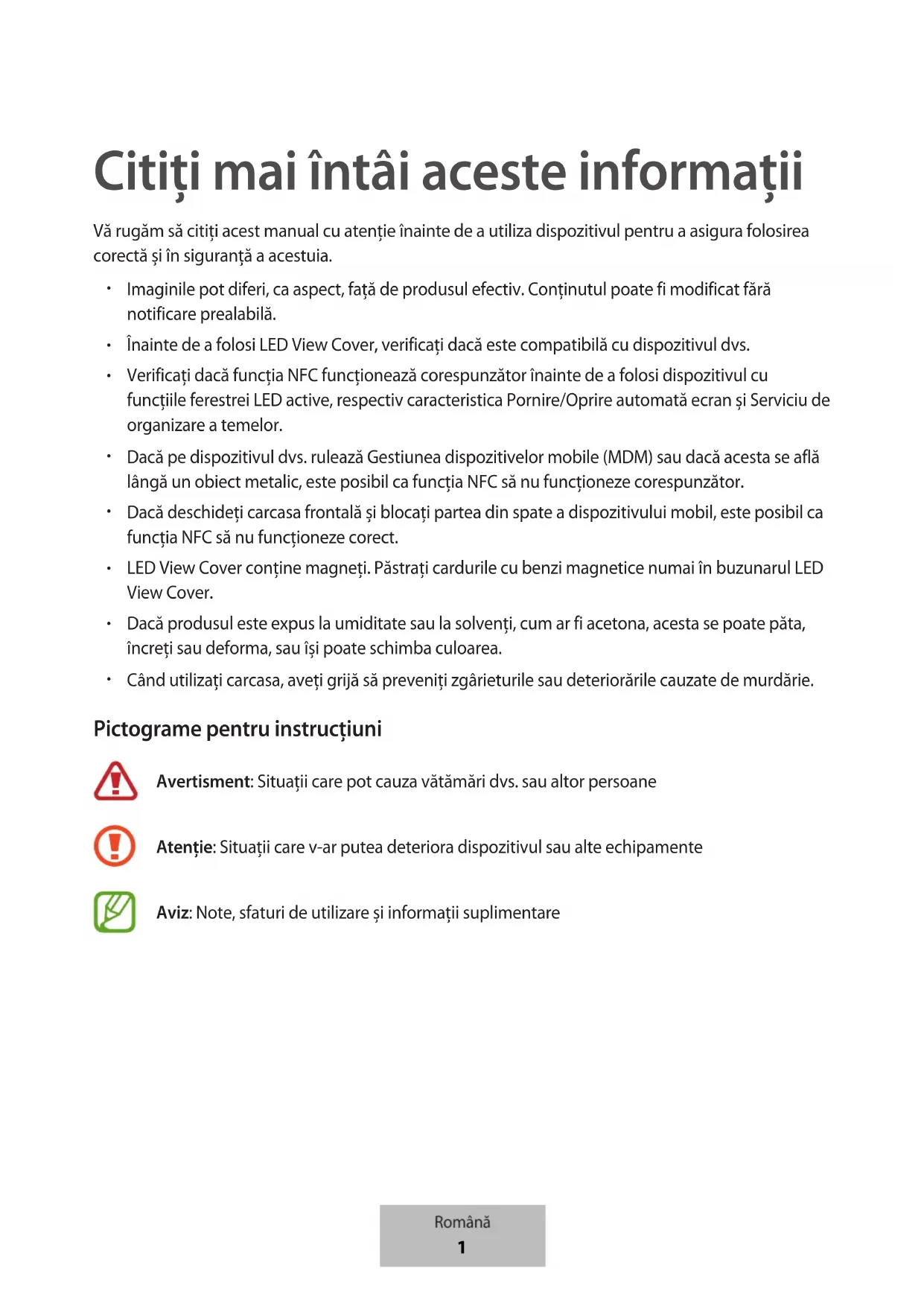 Când utilizați carcasa, aveți grijă să preveniți zgârieturile sau deteriorările cauzate de murdărie. Pictograme pentru instrucţiuni Avertisment: Situaţii care pot cauza vătămări dvs. sau altor persoane Atenţie: Situaţii care v-ar putea deteriora dispozitivul sau alte echipamente Aviz: Note, sfaturi de utilizare şi informaţii suplimentare Română