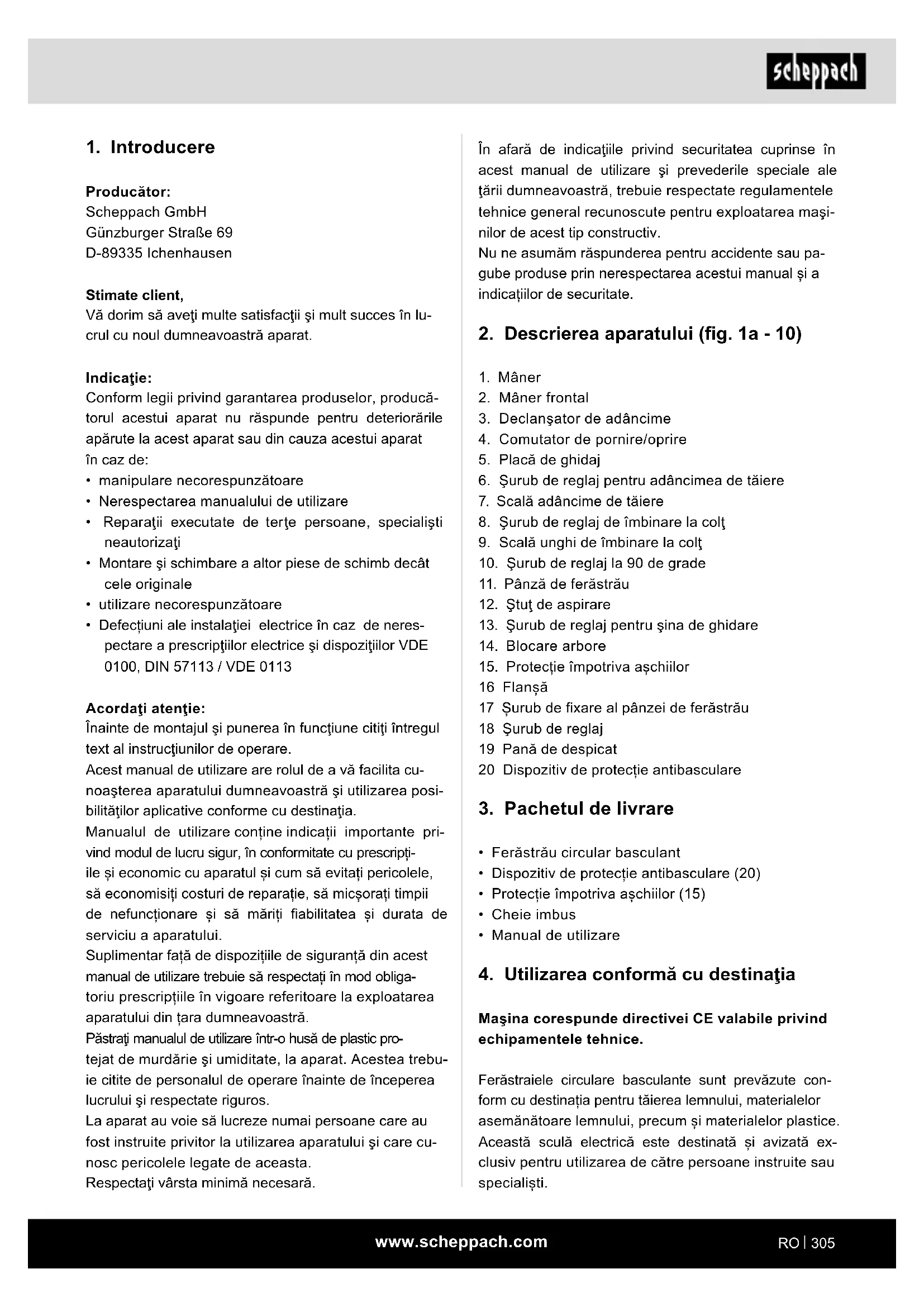 Producător: Scheppach GmbH Günzburger Straße 69 D-89335 Ichenhausen Stimate client, Vă dorim să aveţi multe satisfacţii şi mult succes în lu- crul cu noul dumneavoastră aparat. Indicaţie: Conform legii privind garantarea produselor, producă- torul acestui aparat nu răspunde pentru deteriorările apărute la acest aparat sau din cauza acestui aparat în caz de: