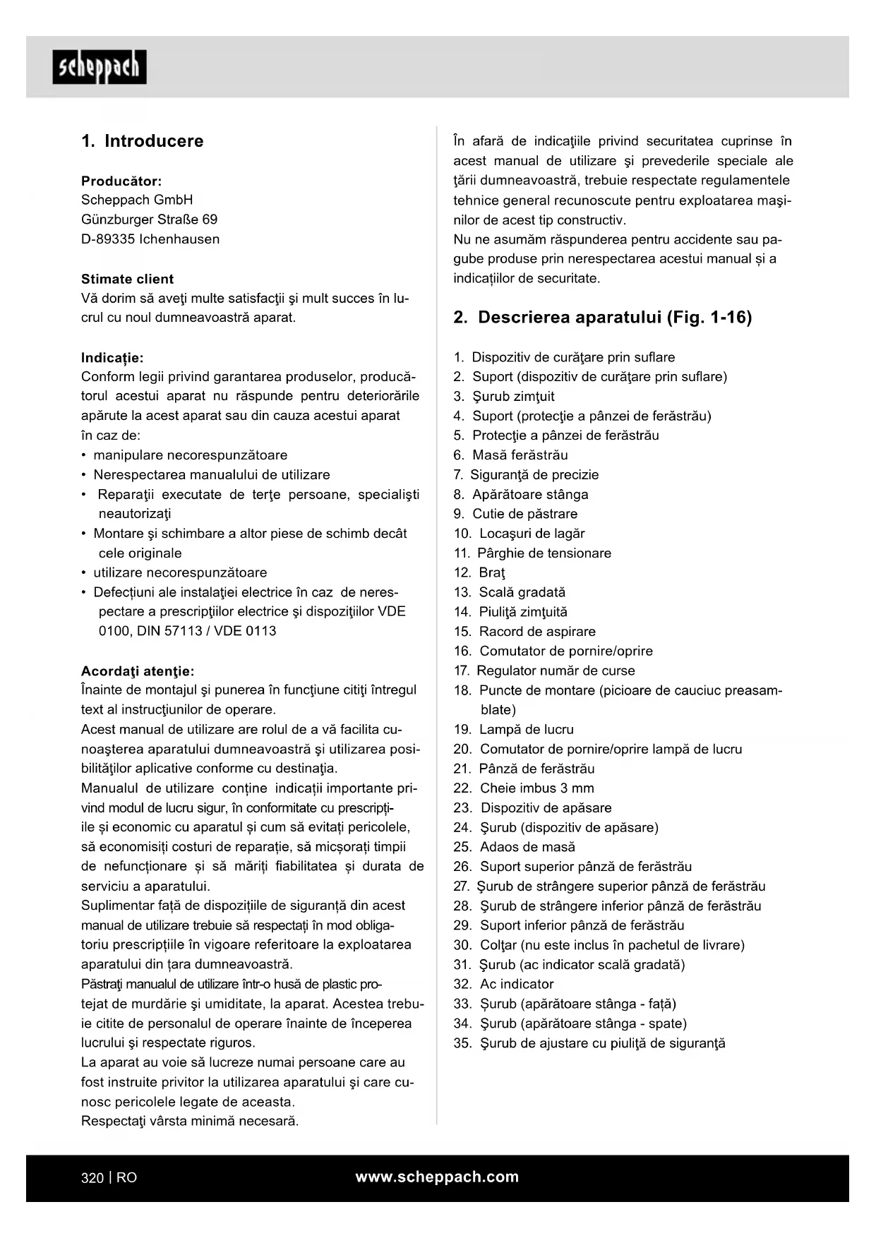 - Modicările la maşină exclud complet orice răspun- dere a producătorului pentru prejudiciile rezultate din situaţiile respective.www.scheppach.com
