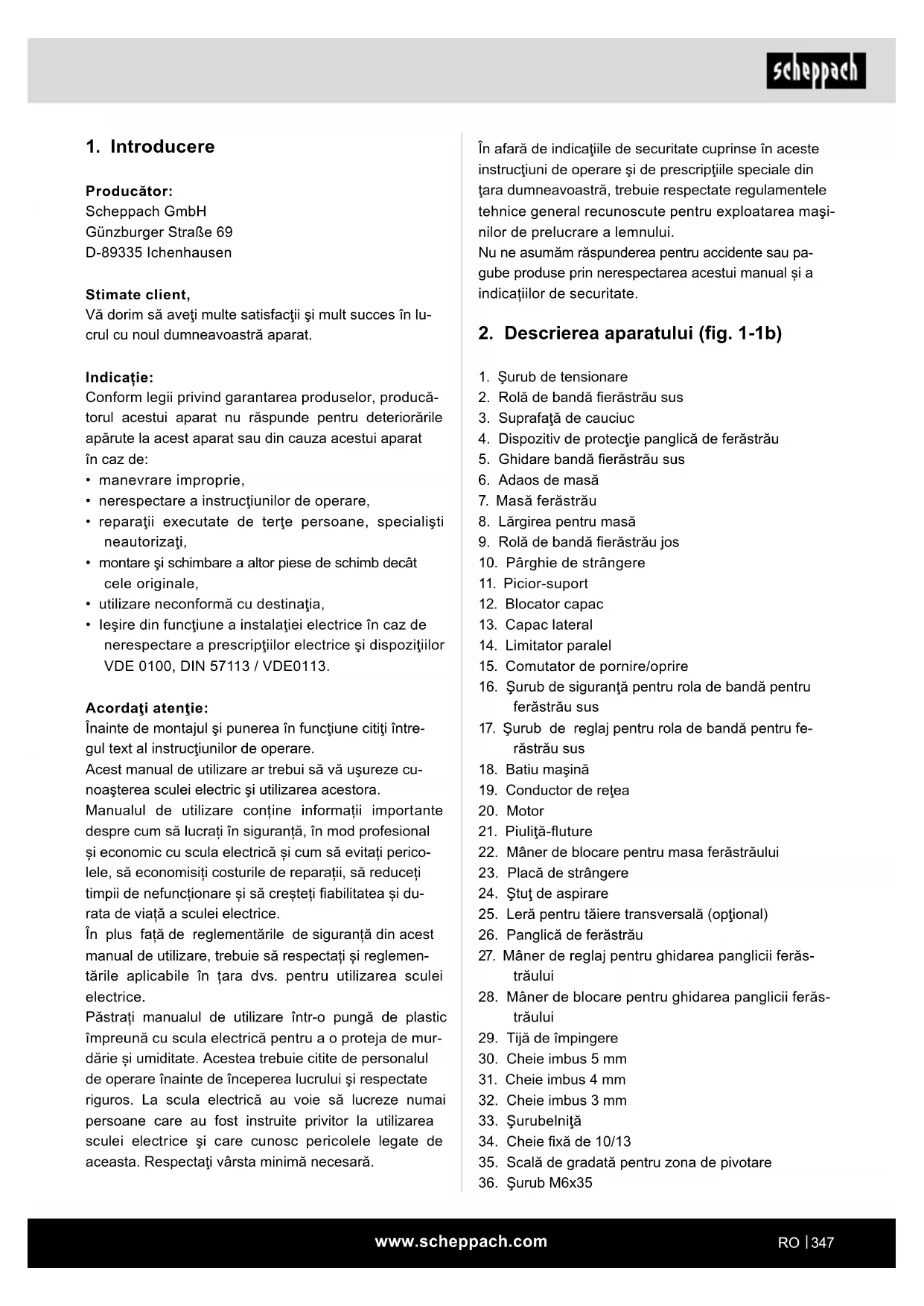 Producător: Scheppach GmbH Günzburger Straße 69 D-89335 Ichenhausen Stimate client, Vă dorim să aveţi multe satisfacţii şi mult succes în lu- crul cu noul dumneavoastră aparat. Indicație: Conform legii privind garantarea produselor, producă- torul acestui aparat nu răspunde pentru deteriorările apărute la acest aparat sau din cauza acestui aparat în caz de: