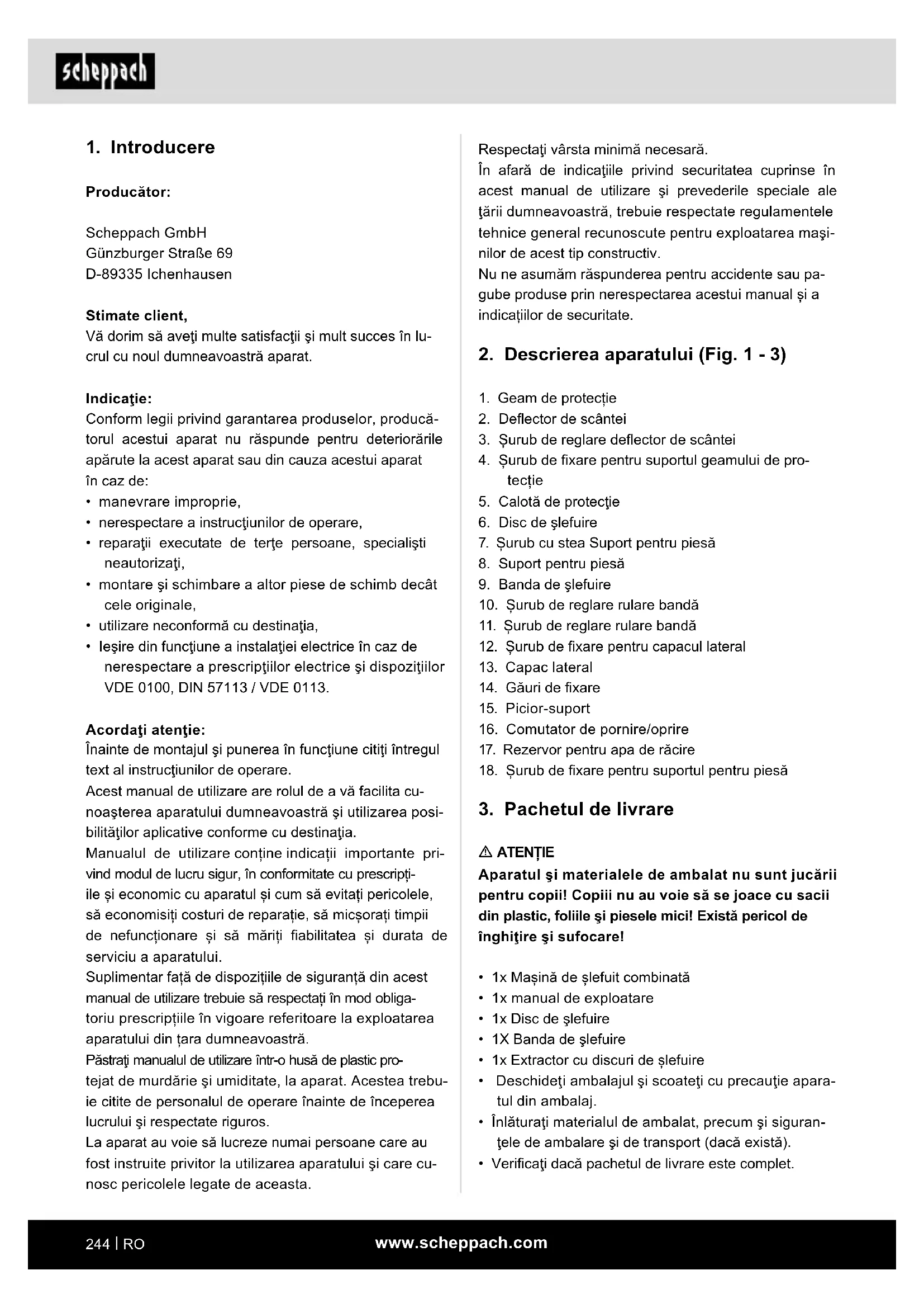 Producător: Scheppach GmbH Günzburger Straße 69 D-89335 Ichenhausen Stimate client, Vă dorim să aveţi multe satisfacţii şi mult succes în lu- crul cu noul dumneavoastră aparat. Indicaţie: Conform legii privind garantarea produselor, producă- torul acestui aparat nu răspunde pentru deteriorările apărute la acest aparat sau din cauza acestui aparat în caz de: